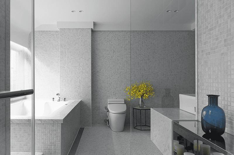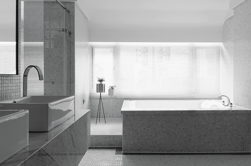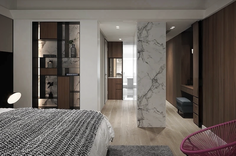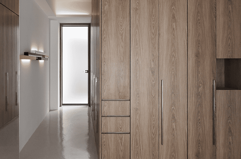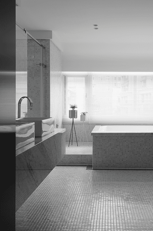 Light and airflow are essential in any living space, especially in this residence, which originally faced water leakage and mold issues. Within the narrow layout, the design addressed these problems by adjusting balcony and window proportions, introducing transparent materials to enhance natural light, and applying moisture-resistant finishes. An elevator was added, with the area between it and the staircase transformed into a transitional porch space.Designed for a couple and their two school-age children, the layout includes a garage, guest room, and playroom with a light court on the first floor. The second floor features an open plan, where a downsized kitchen frees space for the living area, enhanced by cabinets that extend visual depth through layered steel-brushed wood and metal. On the third floor, the master suite is defined by marble cabinets and drapes, with an expanded bathroom featuring a sauna, shower, and mosaic tiles that reflect a bright, airy ambiance.