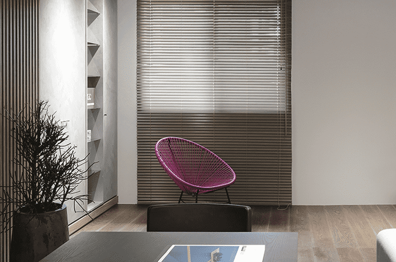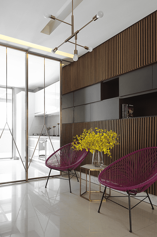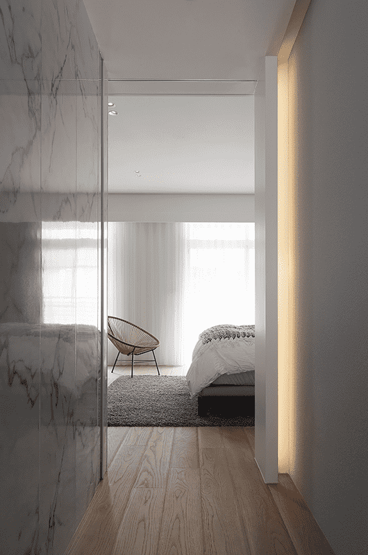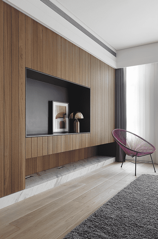 光線、空氣一直是居住環境中重要的因素條件,因原結構關係,住宅有漏水和壁癌狀況,在保留原有格局下,如何在狹長空間引進光線和氣流,並改善結構缺失,是此案課題。因此在有限條件裡,改變陽台平面占比和調整門窗比例,運用通透材質貫穿區域來有效改善光線問題;並採用調濕材料做面材處理,改善濕氣,另有設置電梯配置,其與梯間之間空間作一玄關區域,來做為動線外至內的過渡空間。本案使用人為夫婦2人和一對學齡兒女,在樓層配置上,一樓作為車庫、客房和孩童遊戲空間使用,孩童空間並設有採光天井,可讓陽光灑入;二樓為主要開放區域,原一字型動線的廚房佔領過大面積,加上生活模式考量,我們將尺度縮減,釋放空間給客廳區域,同時流暢其動線,櫃體除收納機能外並用鋼刷木皮格柵堆疊和金屬搭配,利用線條分割延伸視覺尺度並隱喻層層起伏的概念。三樓的主臥空間以大理石材質的雙面櫃和布簾區分各區域,另外將衛浴空間擴大以容納三溫暖烤箱、淋浴間等設備,並以石材馬賽克磚作為主要表面材質,使光線照射後,能讓馬賽克磚色澤相互照映,散發明亮清透的氛圍。| 桃園室內設計 | 空間規劃 | 中古屋翻修 |