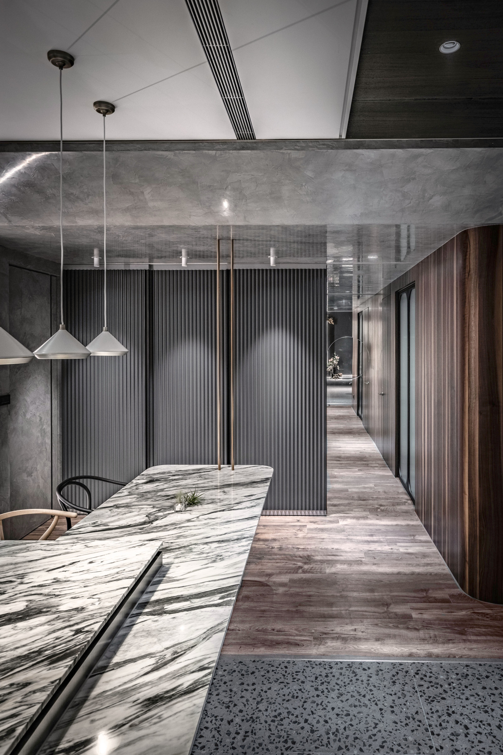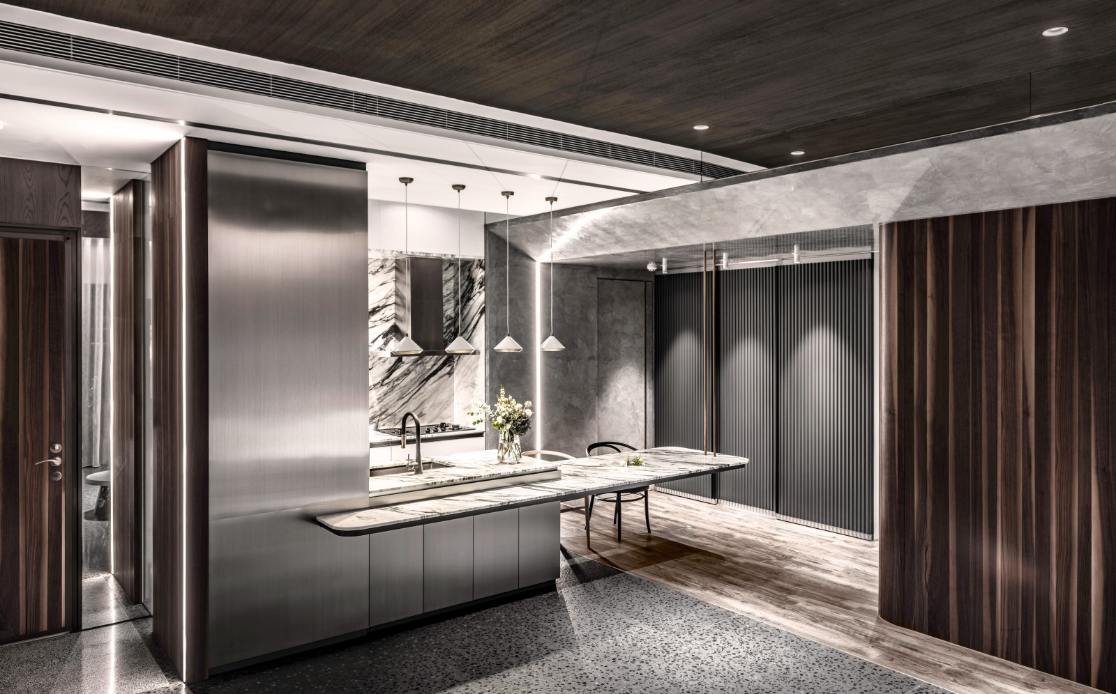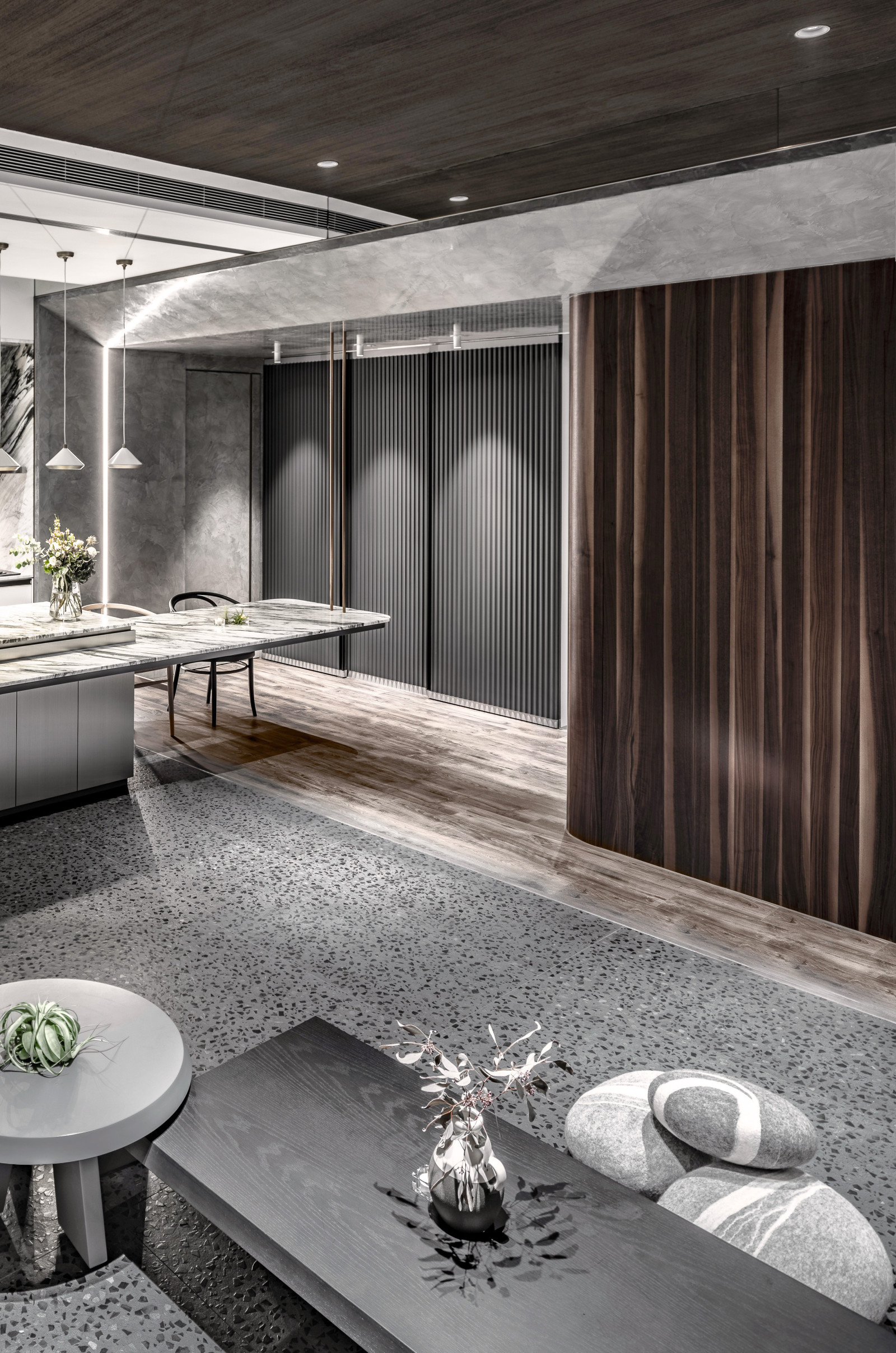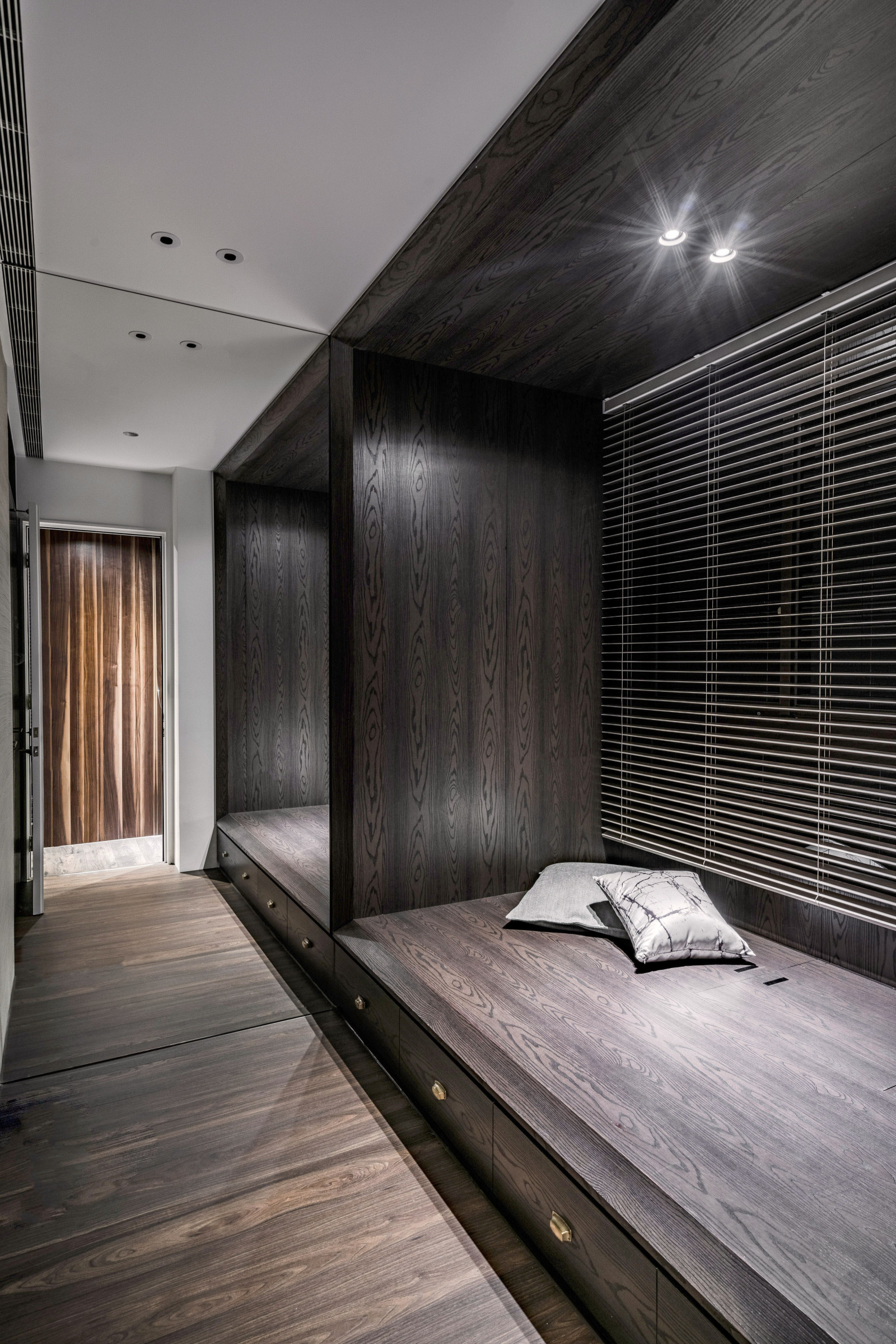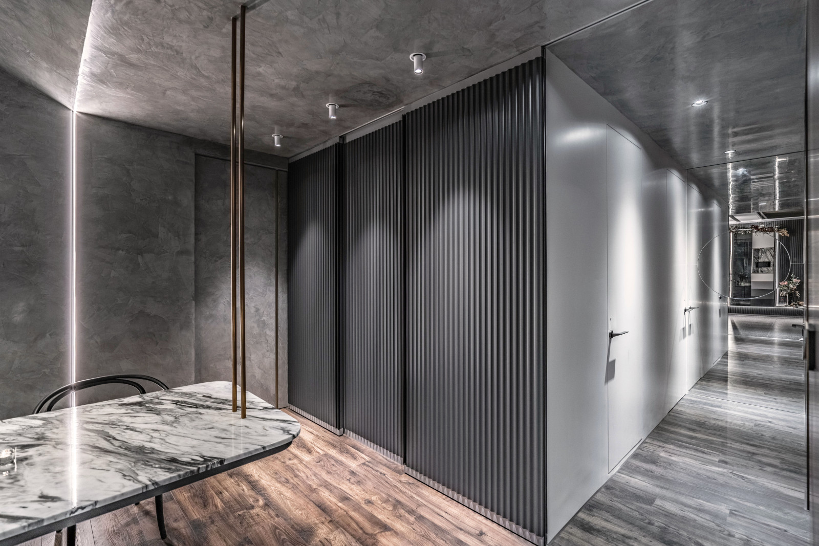 The layout reflects the owner's lifestyle, blending sense and sensibility through varied materials. Contrasting colors and lines define the interior, creating a balance of warmth and coolness. Rich wood tones and sunset views bring softness to the living room, while the kitchen island’s black-and-white stone and stainless steel lines add dramatic tension. Though visually distinct, vertical lines unify the open-plan design and express the owner’s bold taste.A gray lacquered frame in the hallway leads to an illusory mirrored end, using spatial compression and visual extension to evoke “every cloud has a silver lining.” The private area offers a calm retreat, with warm wood tones and double-sided cabinets that enhance order and spaciousness. Hidden mirrors and LED lighting add a modern touch, while the clean palette allows the natural sky outside to shine as the focal point.