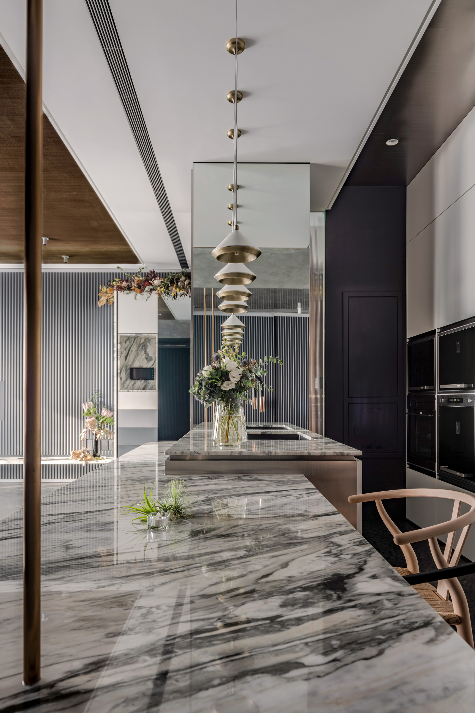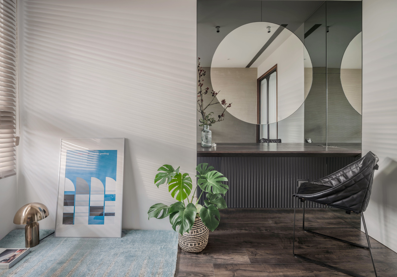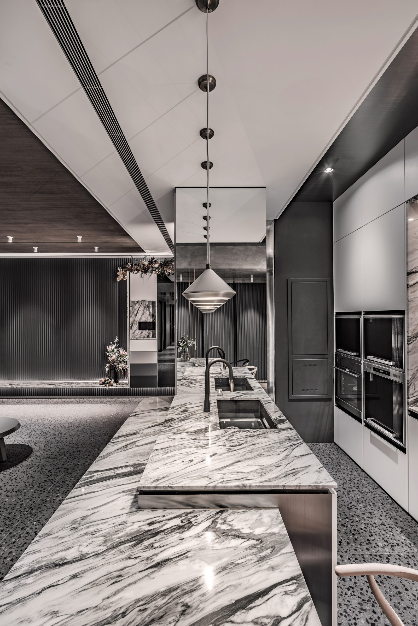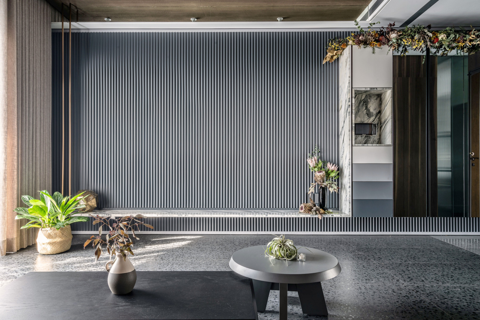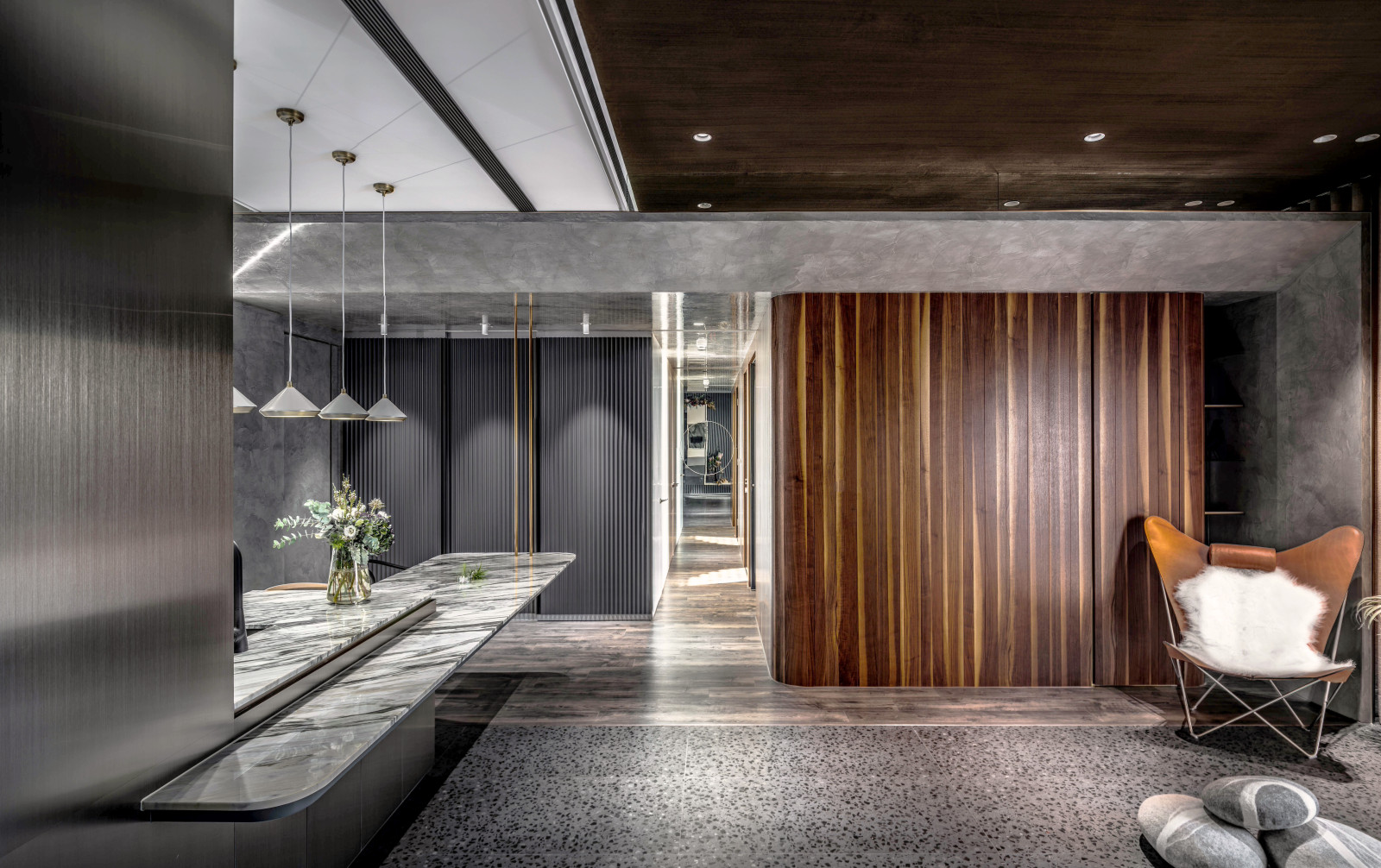 The layout reflects the owner's lifestyle, blending sense and sensibility through varied materials. Contrasting colors and lines define the interior, creating a balance of warmth and coolness. Rich wood tones and sunset views bring softness to the living room, while the kitchen island’s black-and-white stone and stainless steel lines add dramatic tension. Though visually distinct, vertical lines unify the open-plan design and express the owner’s bold taste.A gray lacquered frame in the hallway leads to an illusory mirrored end, using spatial compression and visual extension to evoke “every cloud has a silver lining.” The private area offers a calm retreat, with warm wood tones and double-sided cabinets that enhance order and spaciousness. Hidden mirrors and LED lighting add a modern touch, while the clean palette allows the natural sky outside to shine as the focal point.