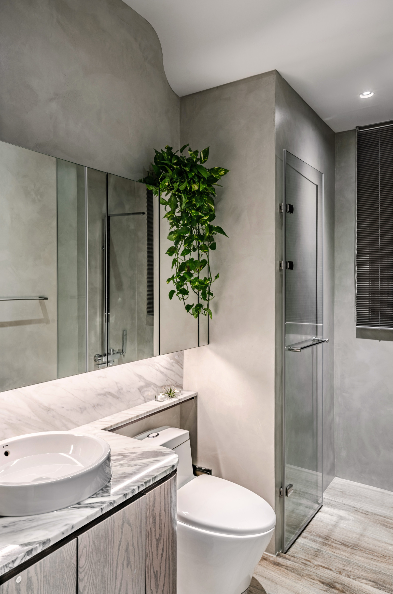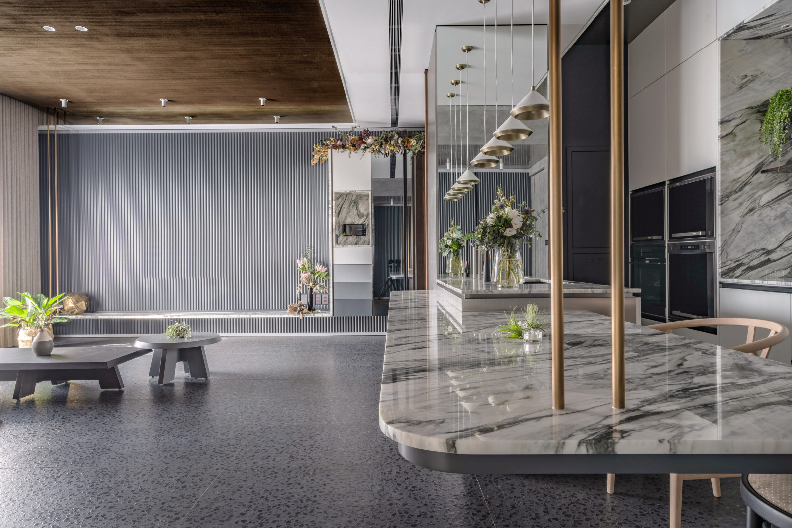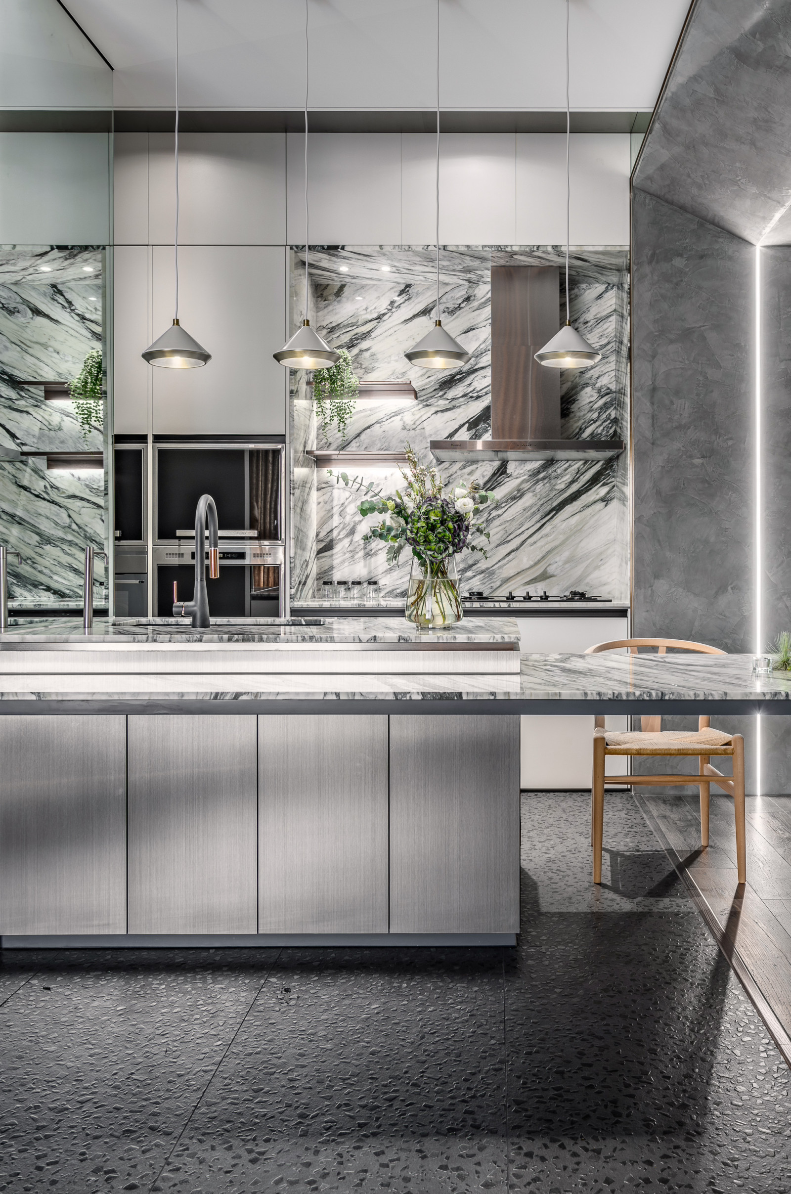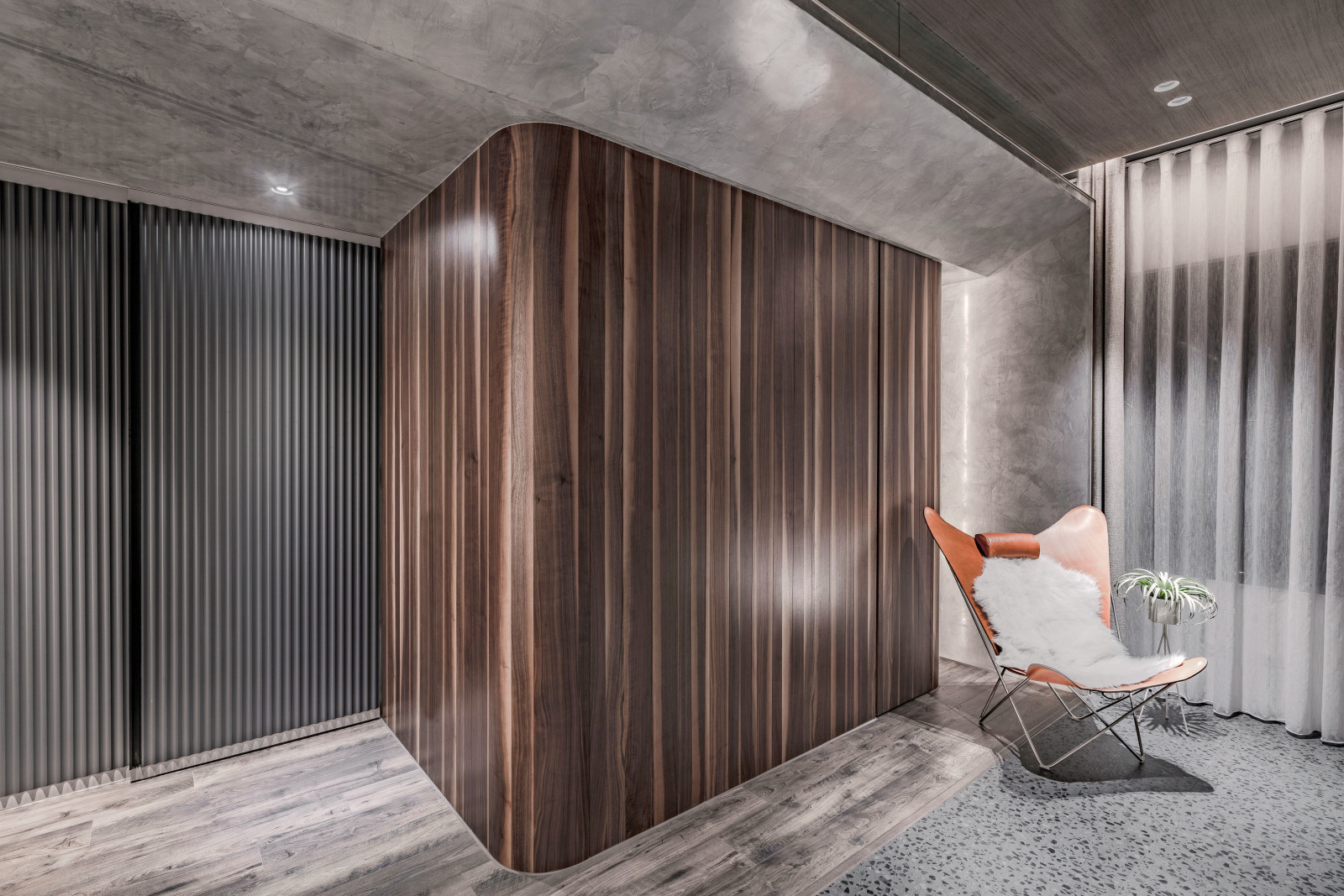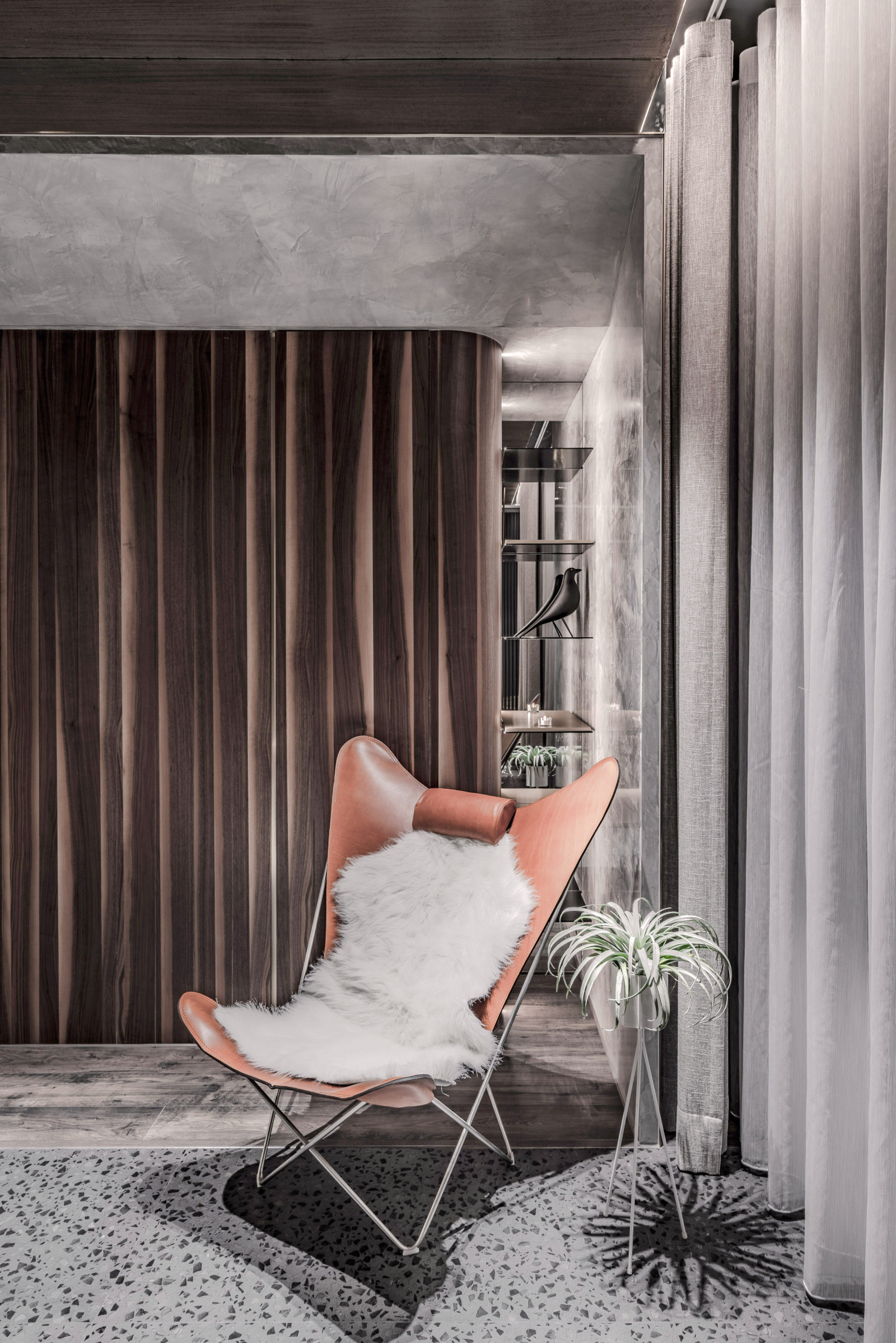 The layout reflects the owner's lifestyle, blending sense and sensibility through varied materials. Contrasting colors and lines define the interior, creating a balance of warmth and coolness. Rich wood tones and sunset views bring softness to the living room, while the kitchen island’s black-and-white stone and stainless steel lines add dramatic tension. Though visually distinct, vertical lines unify the open-plan design and express the owner’s bold taste.A gray lacquered frame in the hallway leads to an illusory mirrored end, using spatial compression and visual extension to evoke “every cloud has a silver lining.” The private area offers a calm retreat, with warm wood tones and double-sided cabinets that enhance order and spaciousness. Hidden mirrors and LED lighting add a modern touch, while the clean palette allows the natural sky outside to shine as the focal point.
