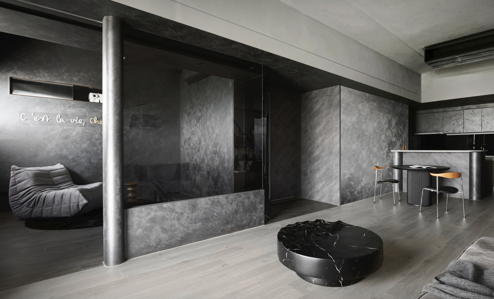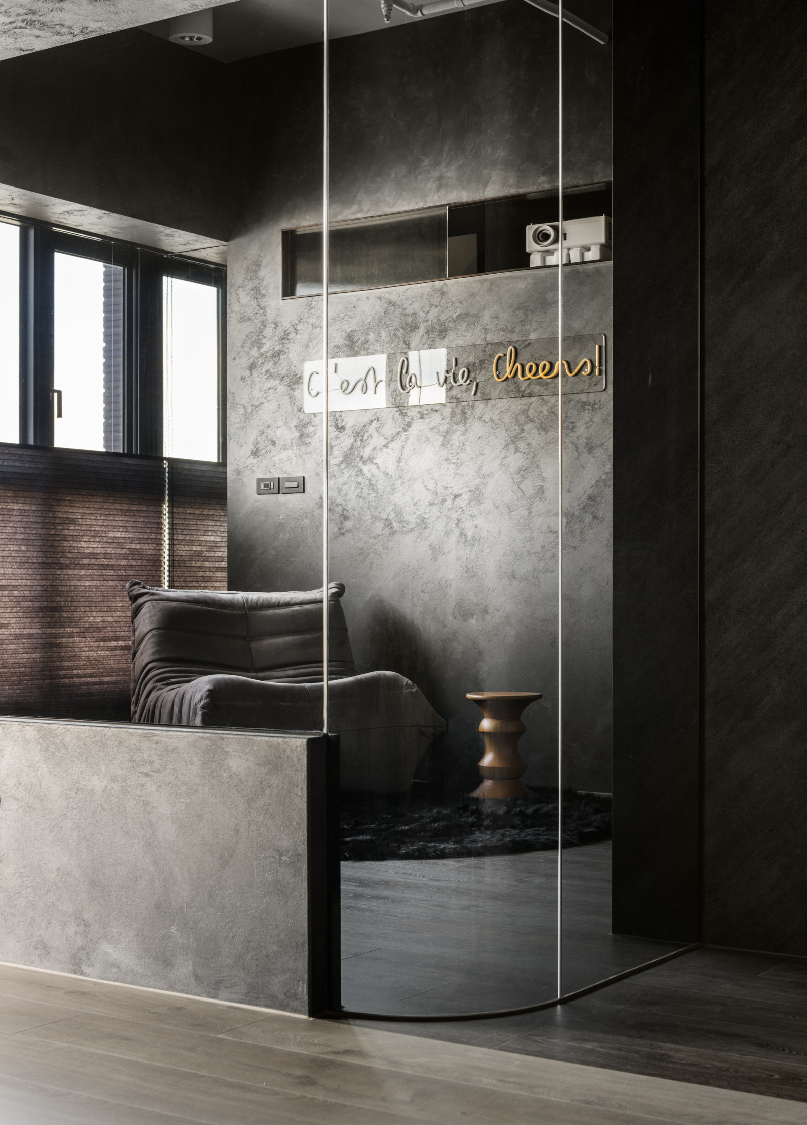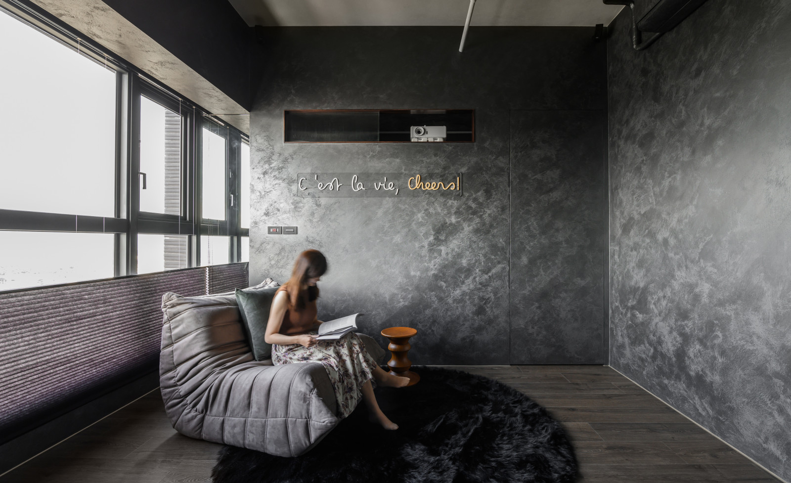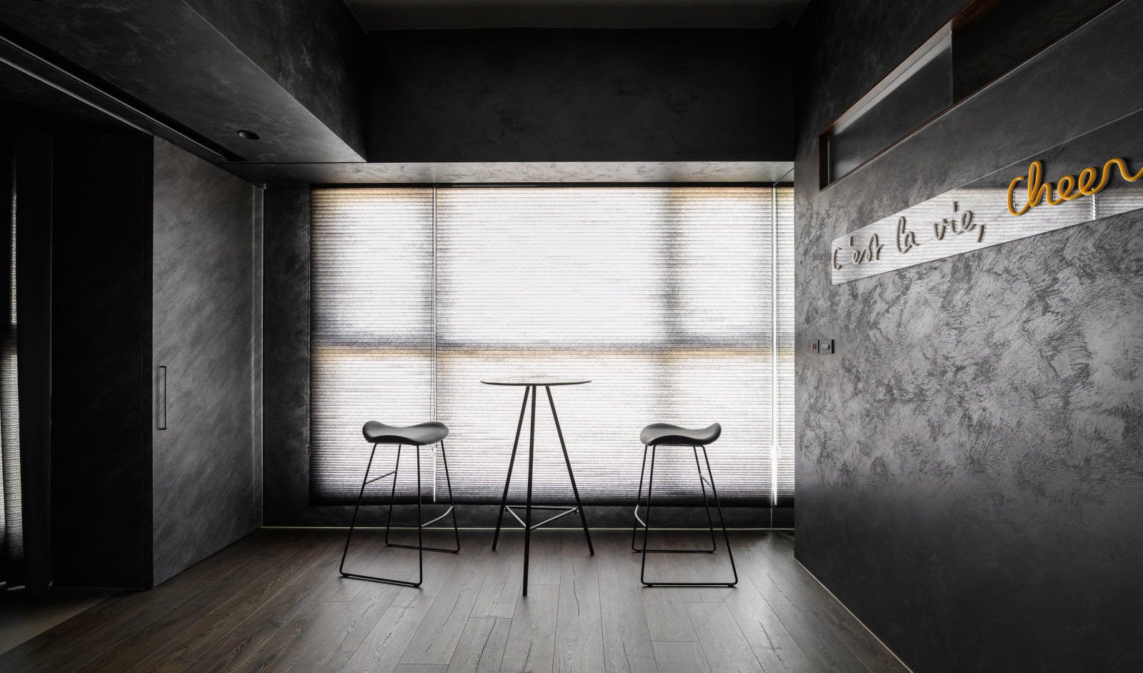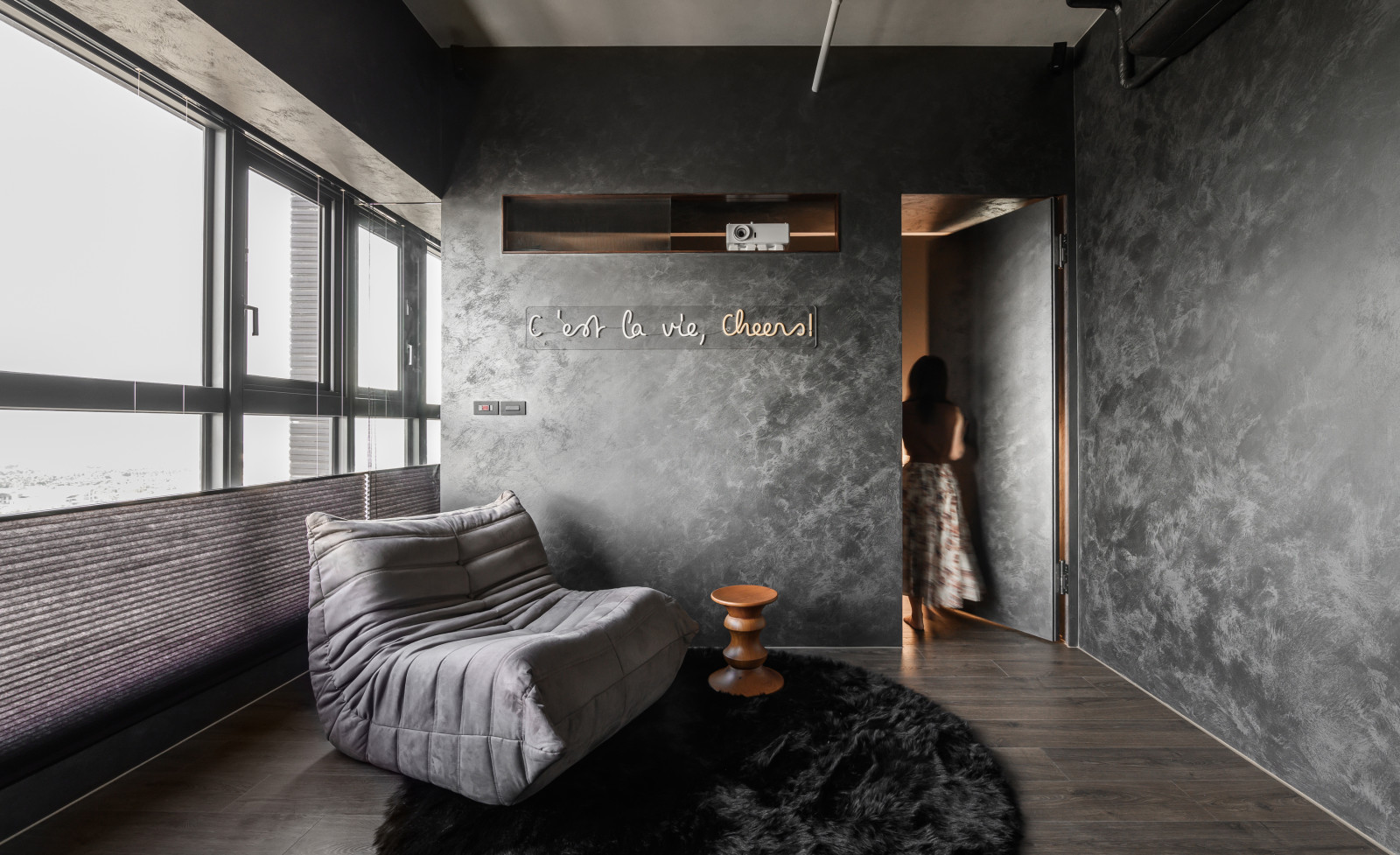 一個人的生活空間,意味著彈性與自由。屋主喜歡科技為生活帶來的娛樂與便利性,同時期待在頂樓公寓,凌駕城市天際線遼闊景觀,手握酒杯,品味人生。室內格局順應既有結構,並圍繞屋主需求進行劃分,除主臥室之外,多功能視聽娛樂室整合更衣間,化解採光面原有畸零,且閒置的牆角;公領域運用開放式設計延展空間感;玄關的長向走道,亦是注入充足收納櫃體。藉此,讓每處空間適得其所,以機能成就流暢的生活動線。陰翳洗鍊的玄關盡頭,銜接著日光端景。洗灰石特殊塗料佈局了空間,其中性的米灰色調,斑駁的藝術質感,陳述起都會男子的生活風格,是於沈穩中,蘊藏自主意識。玄關的長向走廊,是住宅核心的入口,左側利用整面櫃體收納偌大鞋量與物品,並在尾端做斜面修飾,結合右側灰鏡的反射,與重點式光源設計,使廊道更為開闊。客廳與餐廳、廚房、吧台連貫,一旁的多功能視聽娛樂室以曲面玻璃為隔間,最大限度地導入日光與景觀視野,小酌品酒時,與景相伴,為美好人生敬一杯!曲面玻璃後的多功能視聽娛樂室,體現出男主人的興趣,專業級放映投影機與音響,配合專業技師的安排,構築符合此隅空間的音場設計,配上屋主自己手寫的「Cest La Vie, Cheers!」霓虹燈,讓這座頂樓公寓,擁有城市天際線最具規格的視聽饗宴。由於住宅空間位居頂樓,天花板梁位突兀,結合窗簾盒與溝縫作平行設計,使部分管線能夠穿透,而裸露的管線亦整合投射燈軌道為線性語彙,引領規律的空間節奏,在夜晚點開情境式的星光燈,消弭了視覺凌亂,構築了專屬都會生活的簡練質感。| 桃園室內設計 | 空間規劃 客變設計 | 新成屋設計 |