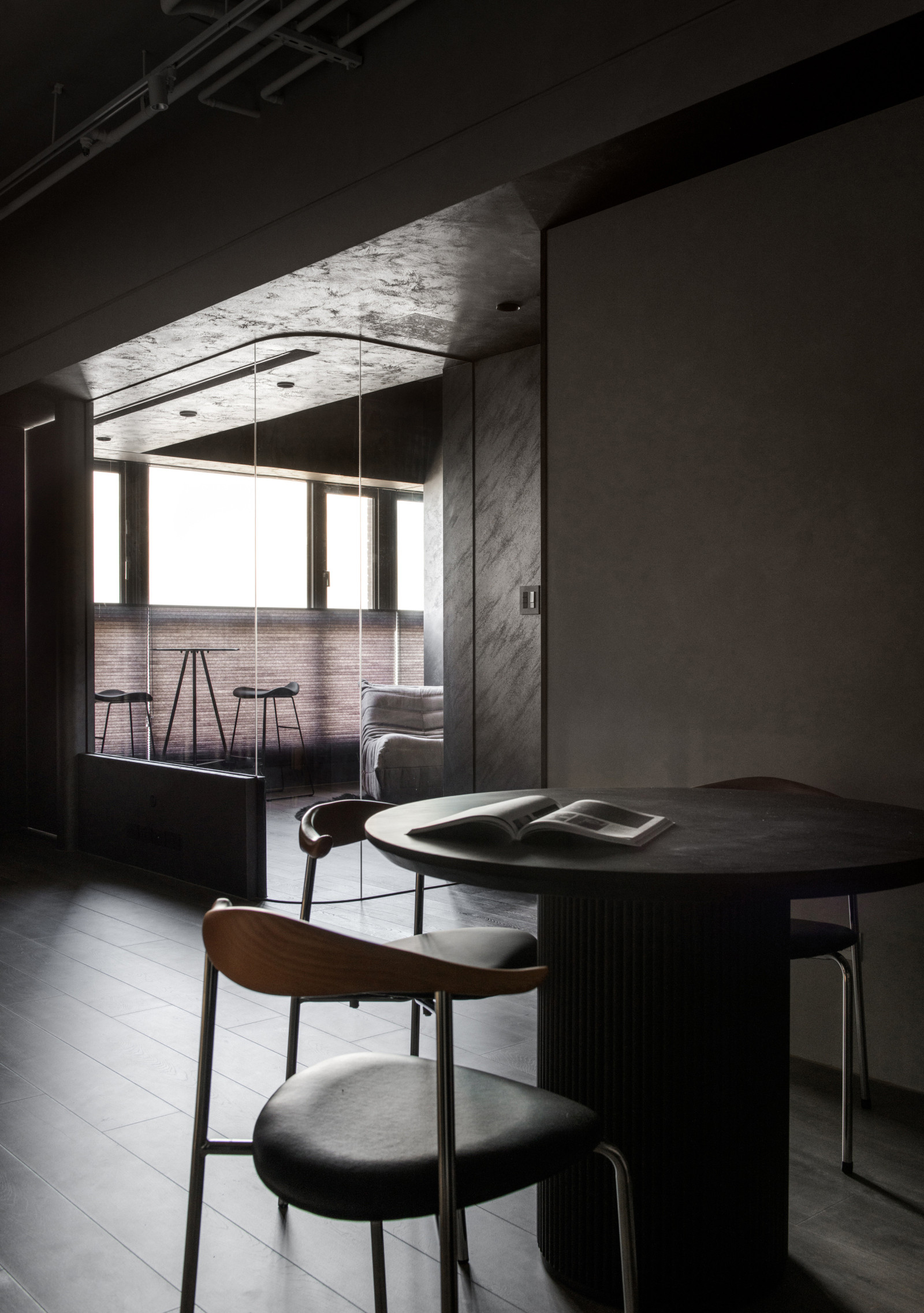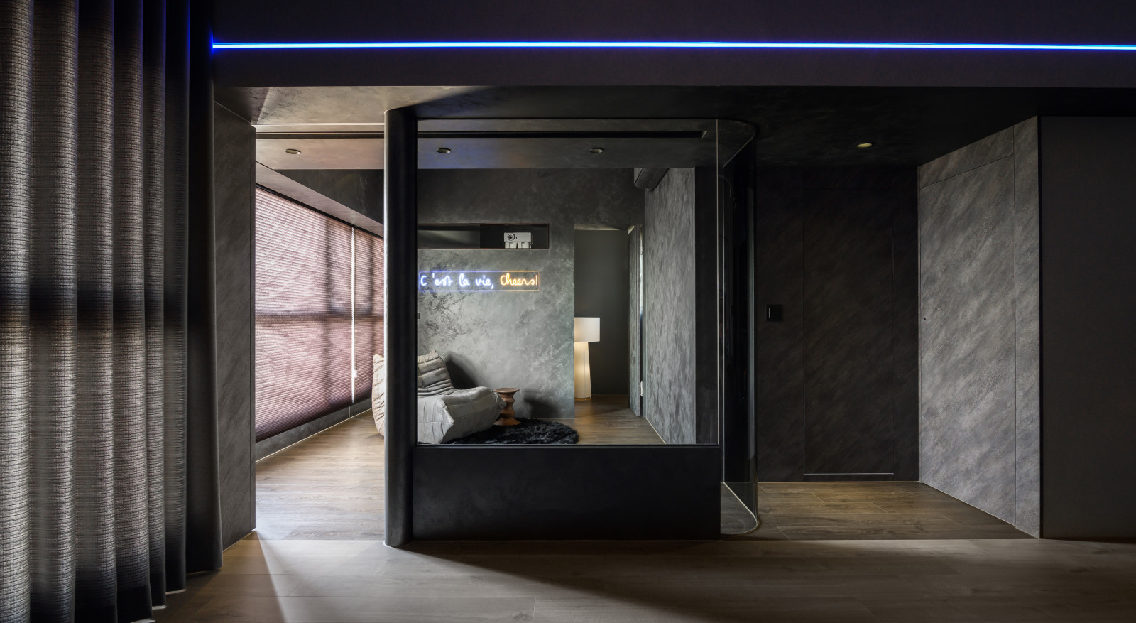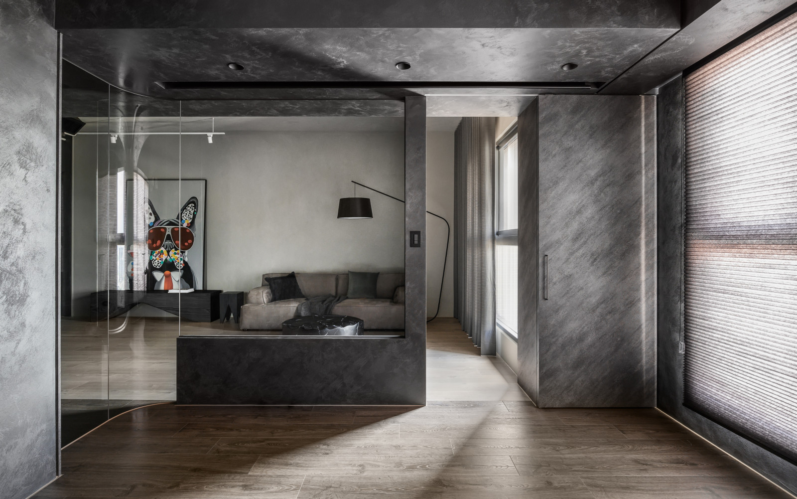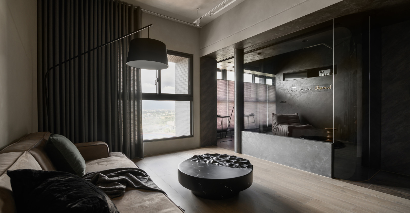 一個人的生活空間,意味著彈性與自由。屋主喜歡科技為生活帶來的娛樂與便利性,同時期待在頂樓公寓,凌駕城市天際線遼闊景觀,手握酒杯,品味人生。室內格局順應既有結構,並圍繞屋主需求進行劃分,除主臥室之外,多功能視聽娛樂室整合更衣間,化解採光面原有畸零,且閒置的牆角;公領域運用開放式設計延展空間感;玄關的長向走道,亦是注入充足收納櫃體。藉此,讓每處空間適得其所,以機能成就流暢的生活動線。陰翳洗鍊的玄關盡頭,銜接著日光端景。洗灰石特殊塗料佈局了空間,其中性的米灰色調,斑駁的藝術質感,陳述起都會男子的生活風格,是於沈穩中,蘊藏自主意識。玄關的長向走廊,是住宅核心的入口,左側利用整面櫃體收納偌大鞋量與物品,並在尾端做斜面修飾,結合右側灰鏡的反射,與重點式光源設計,使廊道更為開闊。客廳與餐廳、廚房、吧台連貫,一旁的多功能視聽娛樂室以曲面玻璃為隔間,最大限度地導入日光與景觀視野,小酌品酒時,與景相伴,為美好人生敬一杯!曲面玻璃後的多功能視聽娛樂室,體現出男主人的興趣,專業級放映投影機與音響,配合專業技師的安排,構築符合此隅空間的音場設計,配上屋主自己手寫的「Cest La Vie, Cheers!」霓虹燈,讓這座頂樓公寓,擁有城市天際線最具規格的視聽饗宴。由於住宅空間位居頂樓,天花板梁位突兀,結合窗簾盒與溝縫作平行設計,使部分管線能夠穿透,而裸露的管線亦整合投射燈軌道為線性語彙,引領規律的空間節奏,在夜晚點開情境式的星光燈,消弭了視覺凌亂,構築了專屬都會生活的簡練質感。| 桃園室內設計 | 空間規劃 客變設計 | 新成屋設計 |