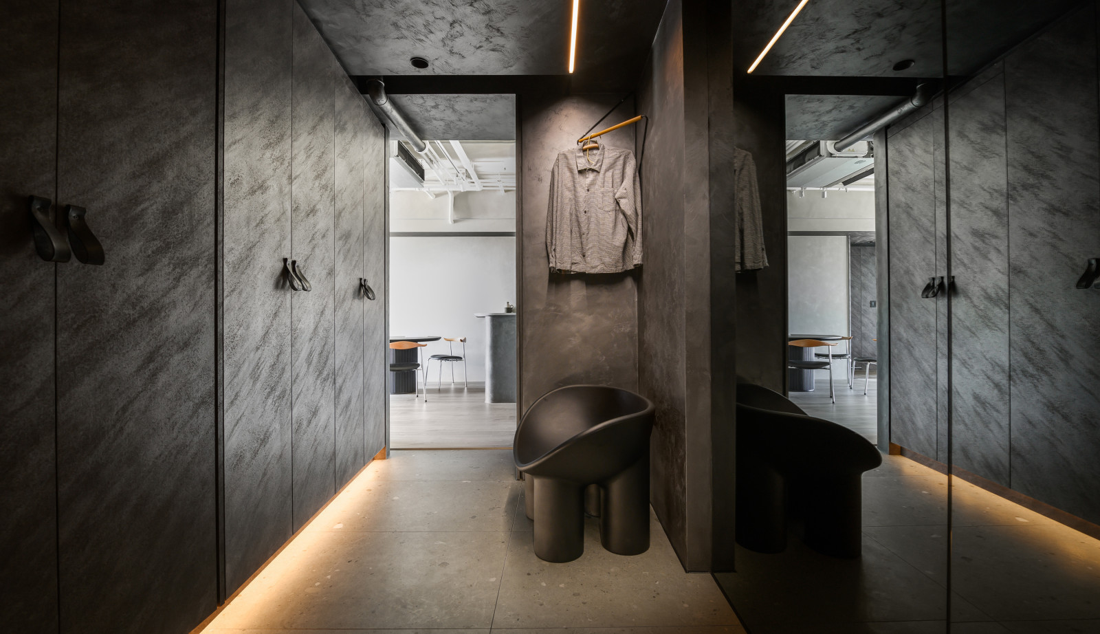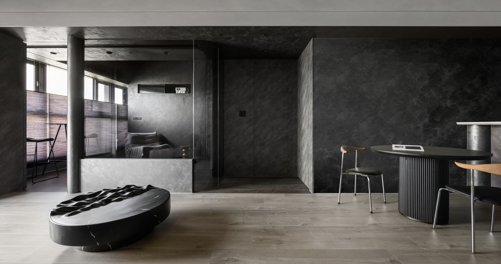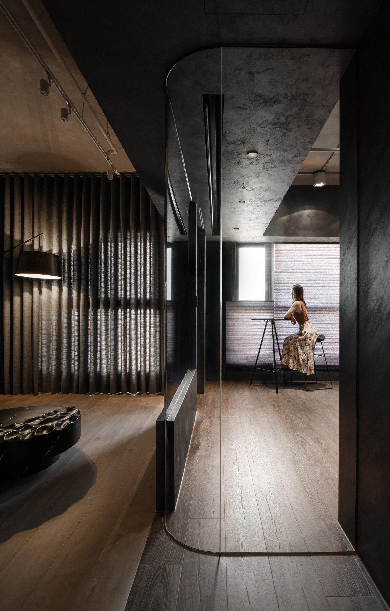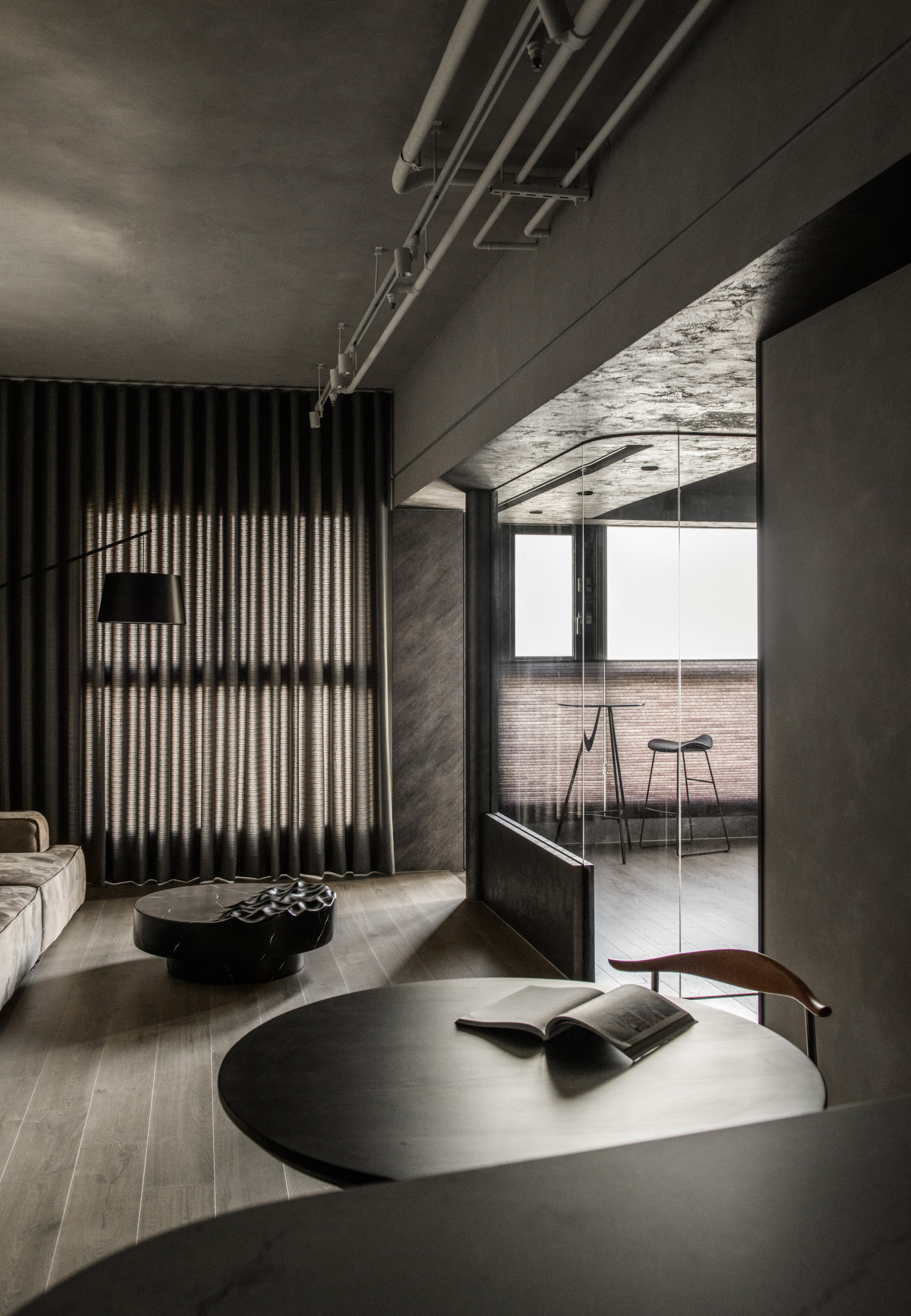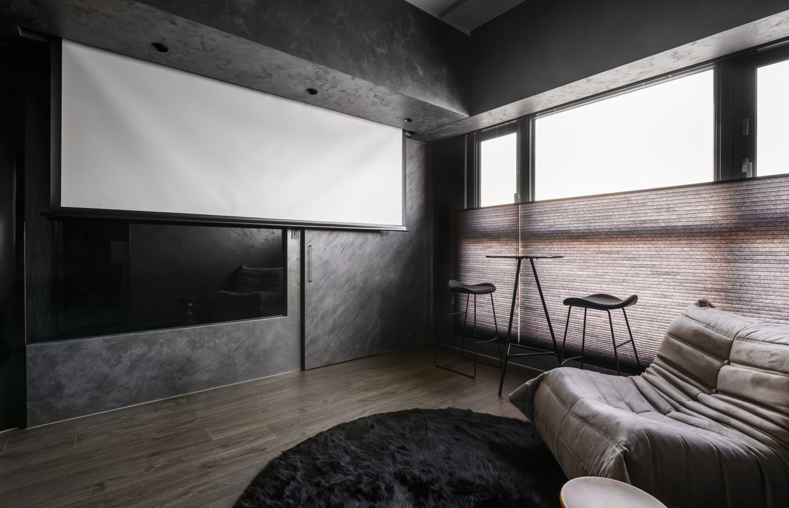 一個人的生活空間,意味著彈性與自由。屋主喜歡科技為生活帶來的娛樂與便利性,同時期待在頂樓公寓,凌駕城市天際線遼闊景觀,手握酒杯,品味人生。室內格局順應既有結構,並圍繞屋主需求進行劃分,除主臥室之外,多功能視聽娛樂室整合更衣間,化解採光面原有畸零,且閒置的牆角;公領域運用開放式設計延展空間感;玄關的長向走道,亦是注入充足收納櫃體。藉此,讓每處空間適得其所,以機能成就流暢的生活動線。陰翳洗鍊的玄關盡頭,銜接著日光端景。洗灰石特殊塗料佈局了空間,其中性的米灰色調,斑駁的藝術質感,陳述起都會男子的生活風格,是於沈穩中,蘊藏自主意識。玄關的長向走廊,是住宅核心的入口,左側利用整面櫃體收納偌大鞋量與物品,並在尾端做斜面修飾,結合右側灰鏡的反射,與重點式光源設計,使廊道更為開闊。客廳與餐廳、廚房、吧台連貫,一旁的多功能視聽娛樂室以曲面玻璃為隔間,最大限度地導入日光與景觀視野,小酌品酒時,與景相伴,為美好人生敬一杯!曲面玻璃後的多功能視聽娛樂室,體現出男主人的興趣,專業級放映投影機與音響,配合專業技師的安排,構築符合此隅空間的音場設計,配上屋主自己手寫的「Cest La Vie, Cheers!」霓虹燈,讓這座頂樓公寓,擁有城市天際線最具規格的視聽饗宴。由於住宅空間位居頂樓,天花板梁位突兀,結合窗簾盒與溝縫作平行設計,使部分管線能夠穿透,而裸露的管線亦整合投射燈軌道為線性語彙,引領規律的空間節奏,在夜晚點開情境式的星光燈,消弭了視覺凌亂,構築了專屬都會生活的簡練質感。| 桃園室內設計 | 空間規劃 客變設計 | 新成屋設計 |