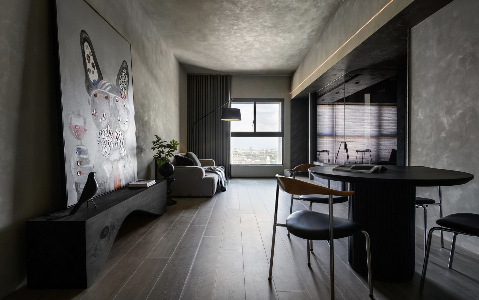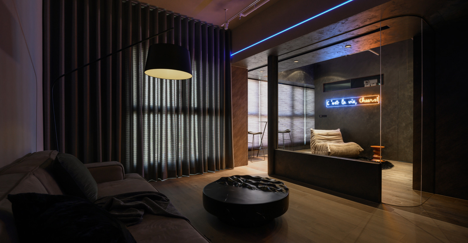This penthouse apartment reflects a life of freedom and style. Designed for a tech-savvy owner, it offers sweeping skyline views and a seamless layout tailored to solo living. Beyond the master bedroom, a curved-glass media room doubles as a walk-in closet, making use of every corner and drawing in natural light.The open-plan living, dining, kitchen, and bar area enhances spaciousness, while the long entry hallway includes built-in storage, gray mirrors, and accent lighting to extend visual depth.Soft gray-beige plaster adds a calm, urban feel. A professional projector, surround sound, and a custom neon sign—“C’est La Vie, Cheers!”—create a personalized cinema experience. Exposed ceiling beams are integrated with lighting tracks and curtain boxes, adding rhythm and clarity to the modern space.