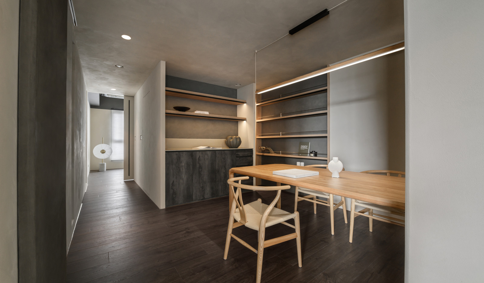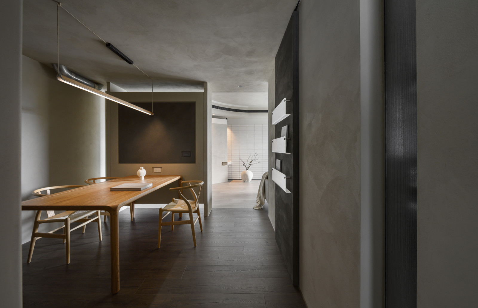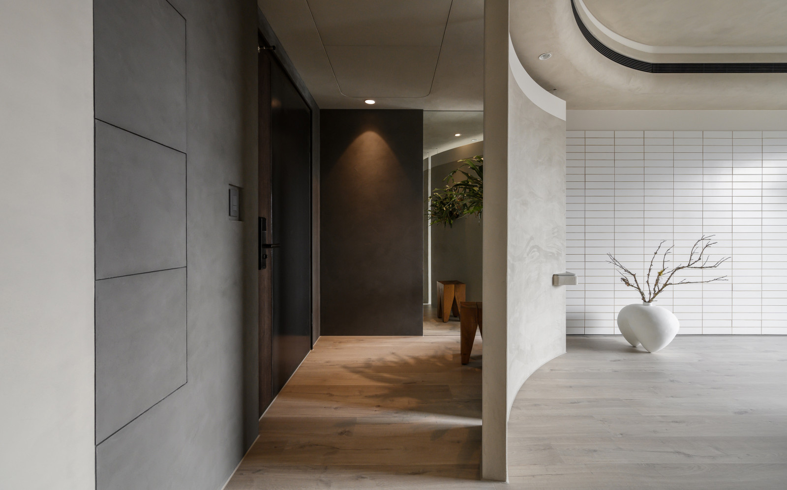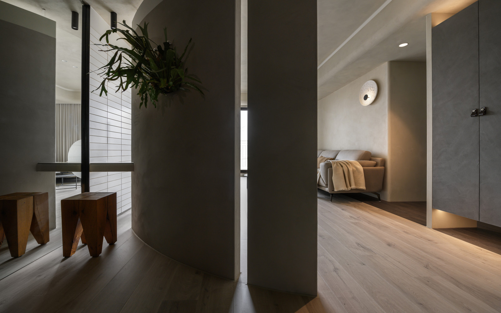 Light enters along a curved wall that serves as a screen—defining the entry, softening views, and guiding light inside. A mirror enhances the curve’s presence, creating a calm, welcoming atmosphere.To address high humidity, an air exchanger and mineral paint help regulate air and moisture. A dark gray panel conceals the electrical box, streamlining visuals.A multi-purpose room is reserved for future needs. The open layout follows the shape of a pre-owned sofa, with soft tones and handmade tiles echoing the building’s exterior.The dining area, at the boundary of public and private zones, supports dining, reading, and work. Shelving and storage blend wood accents for warmth and connect to an active hallway.Hidden doors in the master suite maintain clean lines. Fluted glass brings in light, while the bed anchors the space between bath and closet. A niche above adds depth and structure.