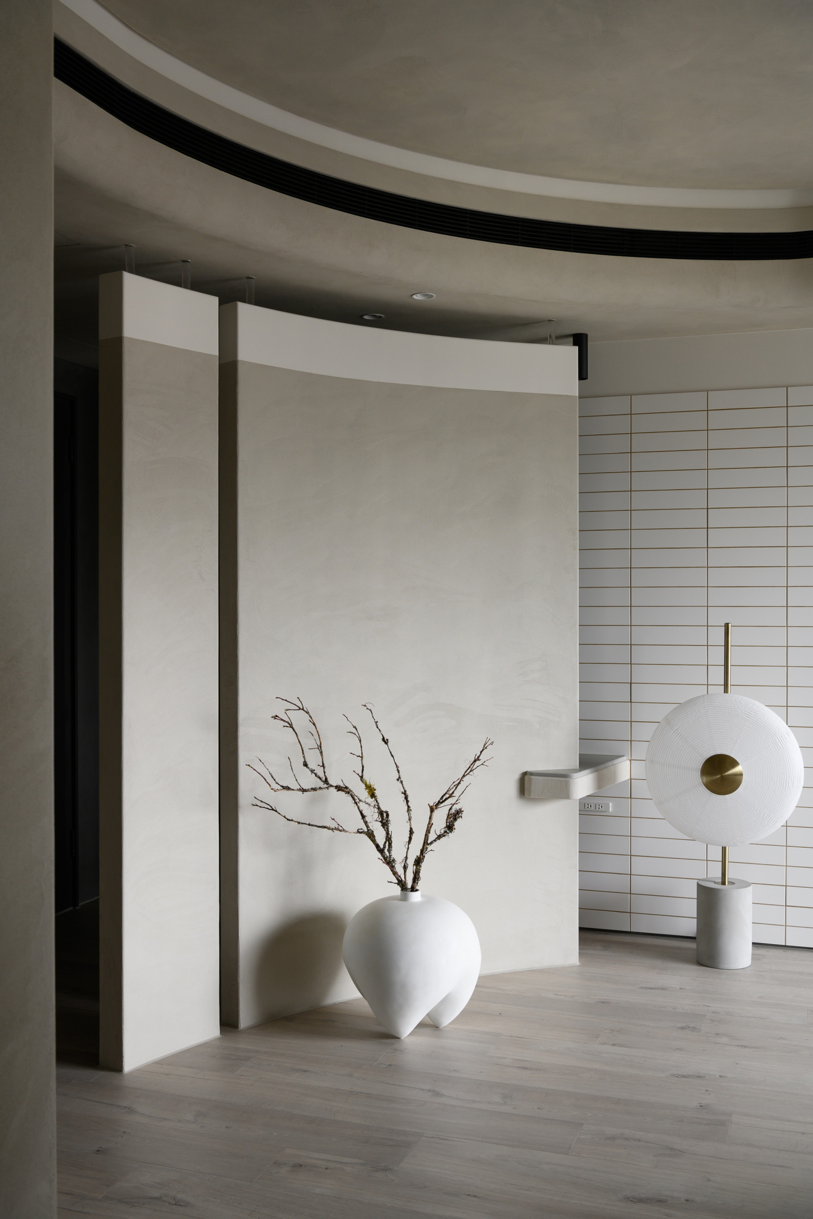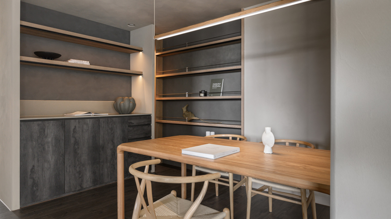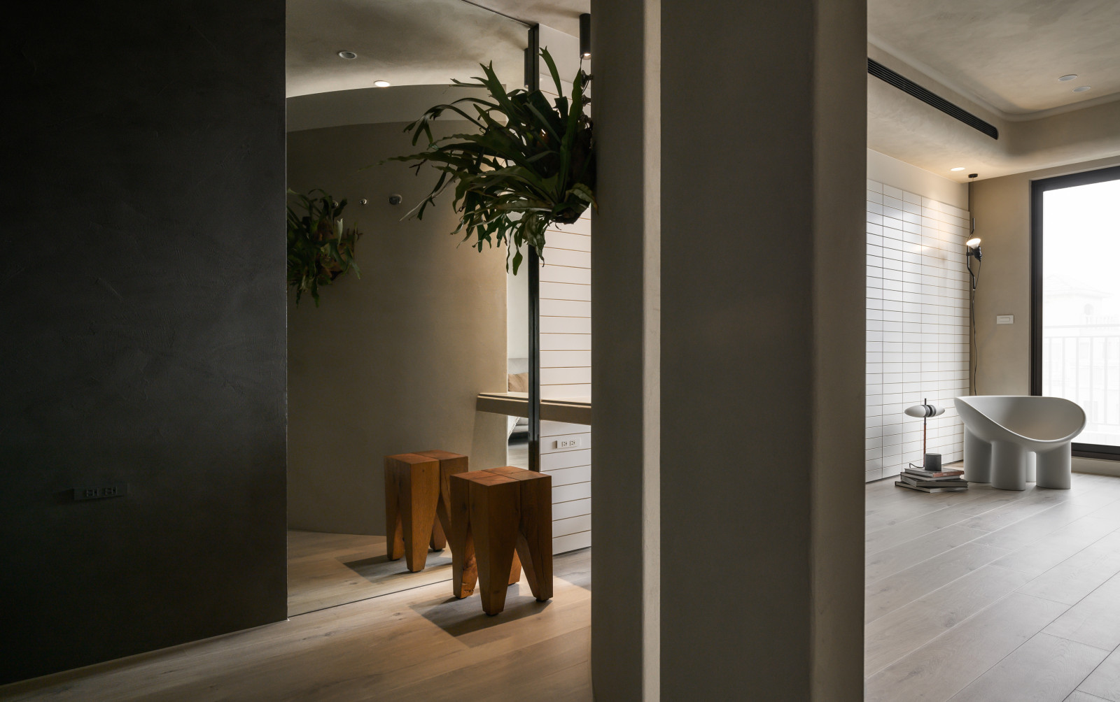 Light enters along a curved wall that serves as a screen—defining the entry, softening views, and guiding light inside. A mirror enhances the curve’s presence, creating a calm, welcoming atmosphere.To address high humidity, an air exchanger and mineral paint help regulate air and moisture. A dark gray panel conceals the electrical box, streamlining visuals.A multi-purpose room is reserved for future needs. The open layout follows the shape of a pre-owned sofa, with soft tones and handmade tiles echoing the building’s exterior.The dining area, at the boundary of public and private zones, supports dining, reading, and work. Shelving and storage blend wood accents for warmth and connect to an active hallway.Hidden doors in the master suite maintain clean lines. Fluted glass brings in light, while the bed anchors the space between bath and closet. A niche above adds depth and structure.