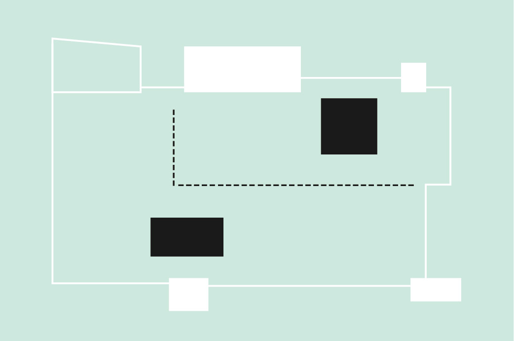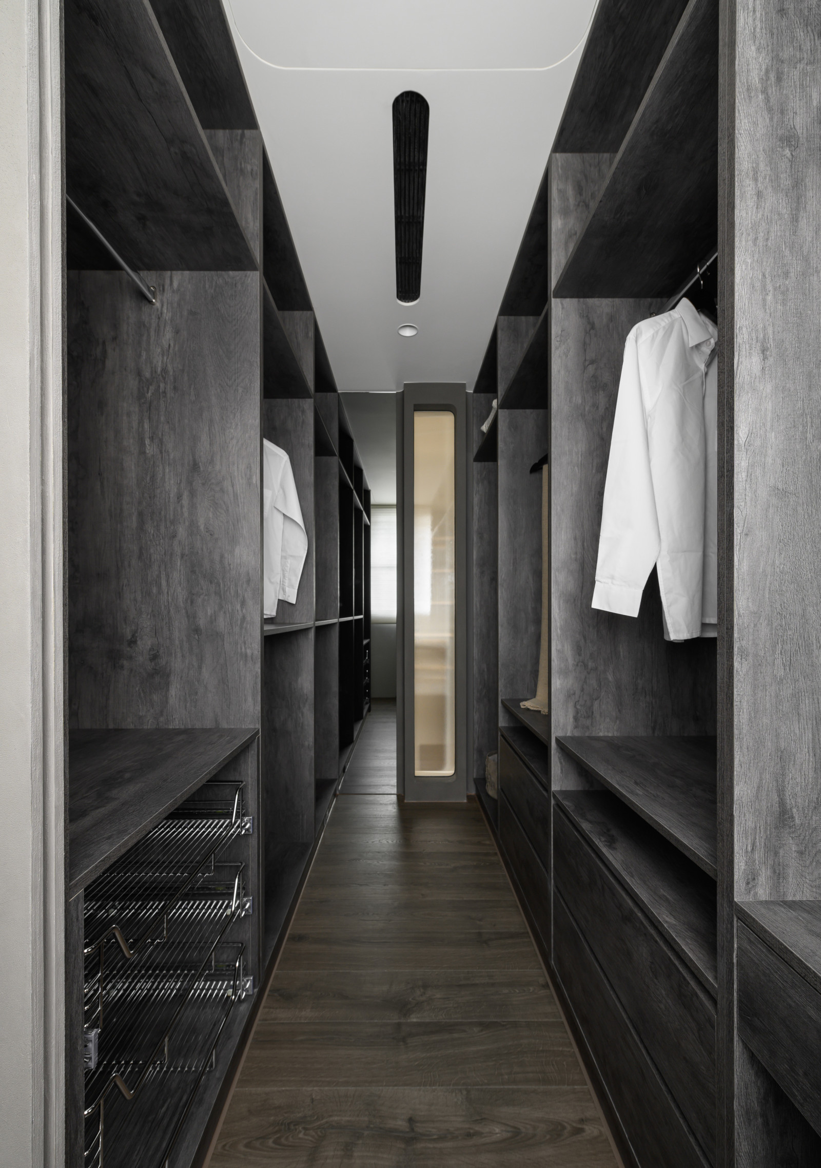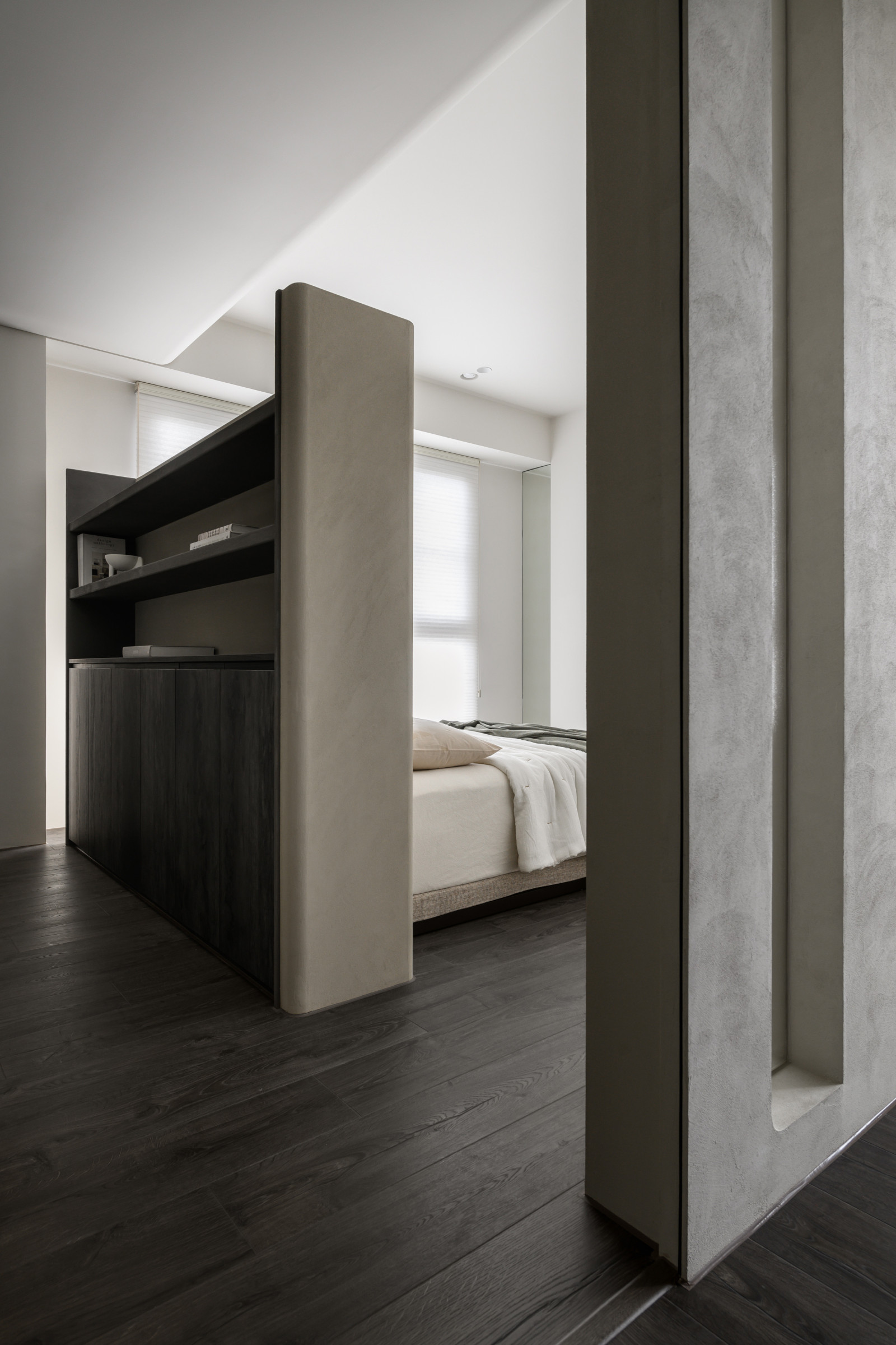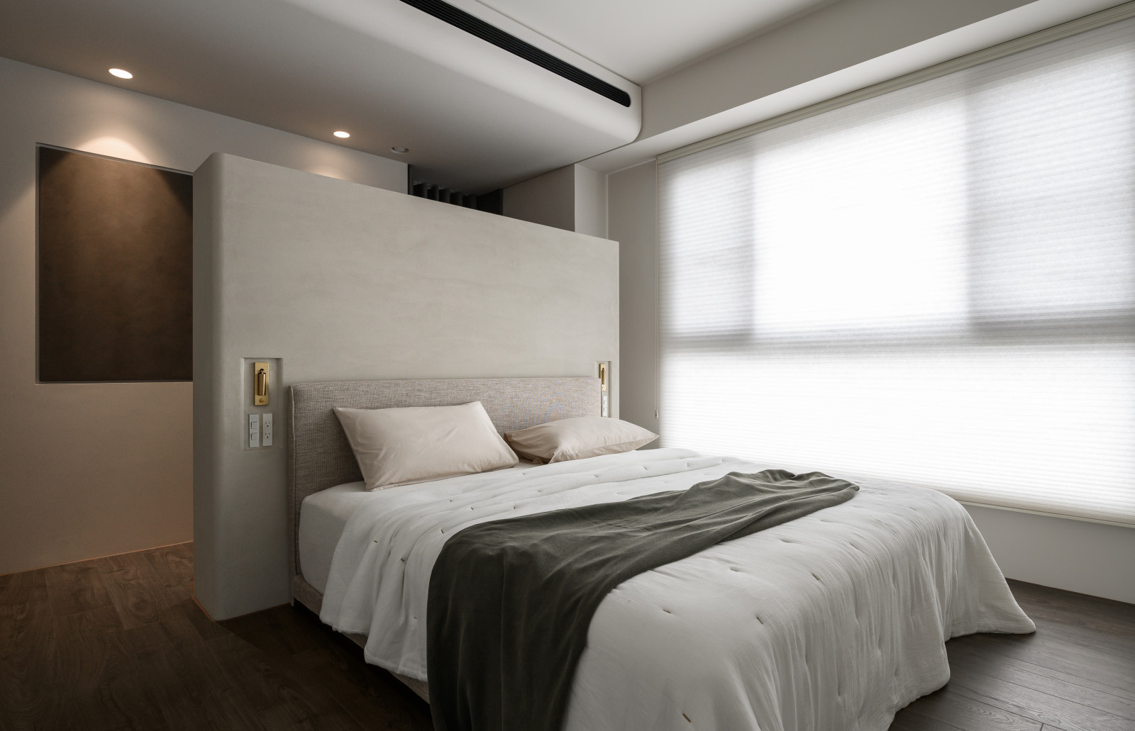 Light enters along a curved wall that serves as a screen—defining the entry, softening views, and guiding light inside. A mirror enhances the curve’s presence, creating a calm, welcoming atmosphere.To address high humidity, an air exchanger and mineral paint help regulate air and moisture. A dark gray panel conceals the electrical box, streamlining visuals.A multi-purpose room is reserved for future needs. The open layout follows the shape of a pre-owned sofa, with soft tones and handmade tiles echoing the building’s exterior.The dining area, at the boundary of public and private zones, supports dining, reading, and work. Shelving and storage blend wood accents for warmth and connect to an active hallway.Hidden doors in the master suite maintain clean lines. Fluted glass brings in light, while the bed anchors the space between bath and closet. A niche above adds depth and structure.