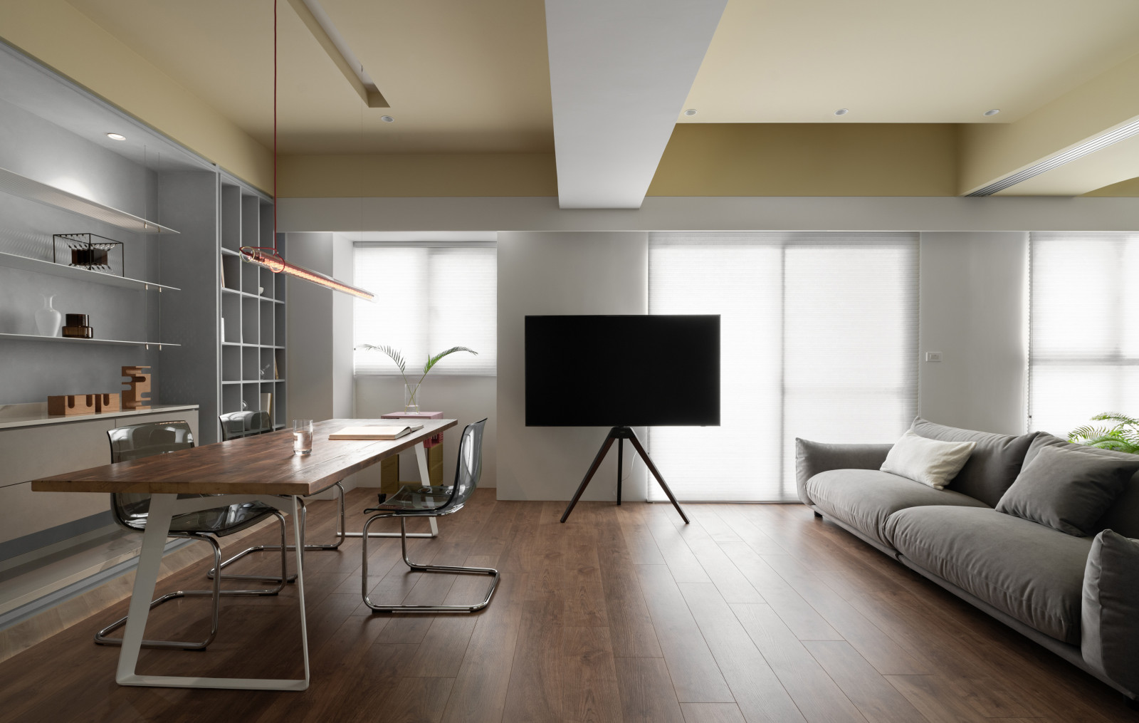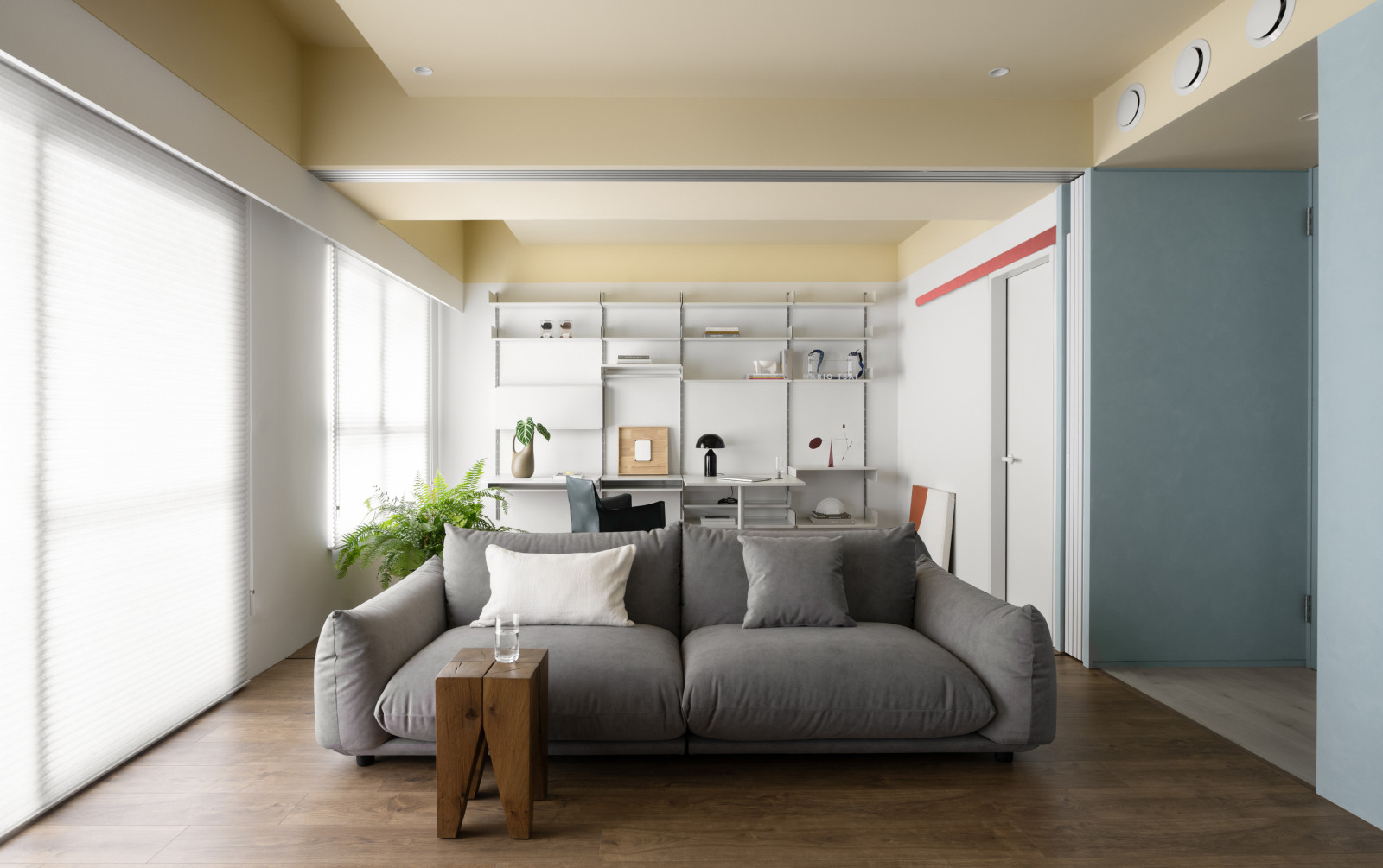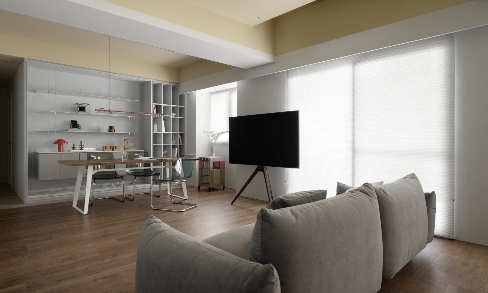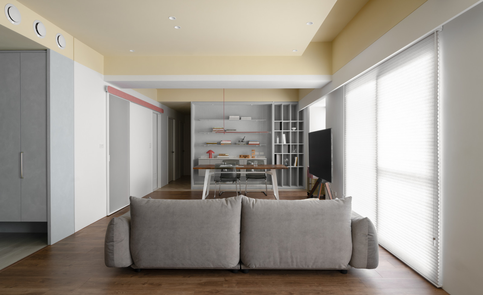 Life flows through the movement of sliding doors.An open layout connects the living room, dining area, and study, forming a bright, spacious core.Soft tones of blush pink, pastel yellow, and powder blue replace saturated colors, creating a calm modern style.Without a fixed TV wall, the standing TV and sofa can be rearranged freely for flexible living.Built-in desks and VITSOE shelving at both ends support the couple’s work-from-home needs.The study behind the sofa features sliding doors, allowing it to become a guest room or quiet meeting space.Sliding doors add both functional flexibility and visual depth.A yellow ceiling, wooden floors, and shifting wall tones create a warm, airy feel, while blush red door tracks add a bold, artistic accent.