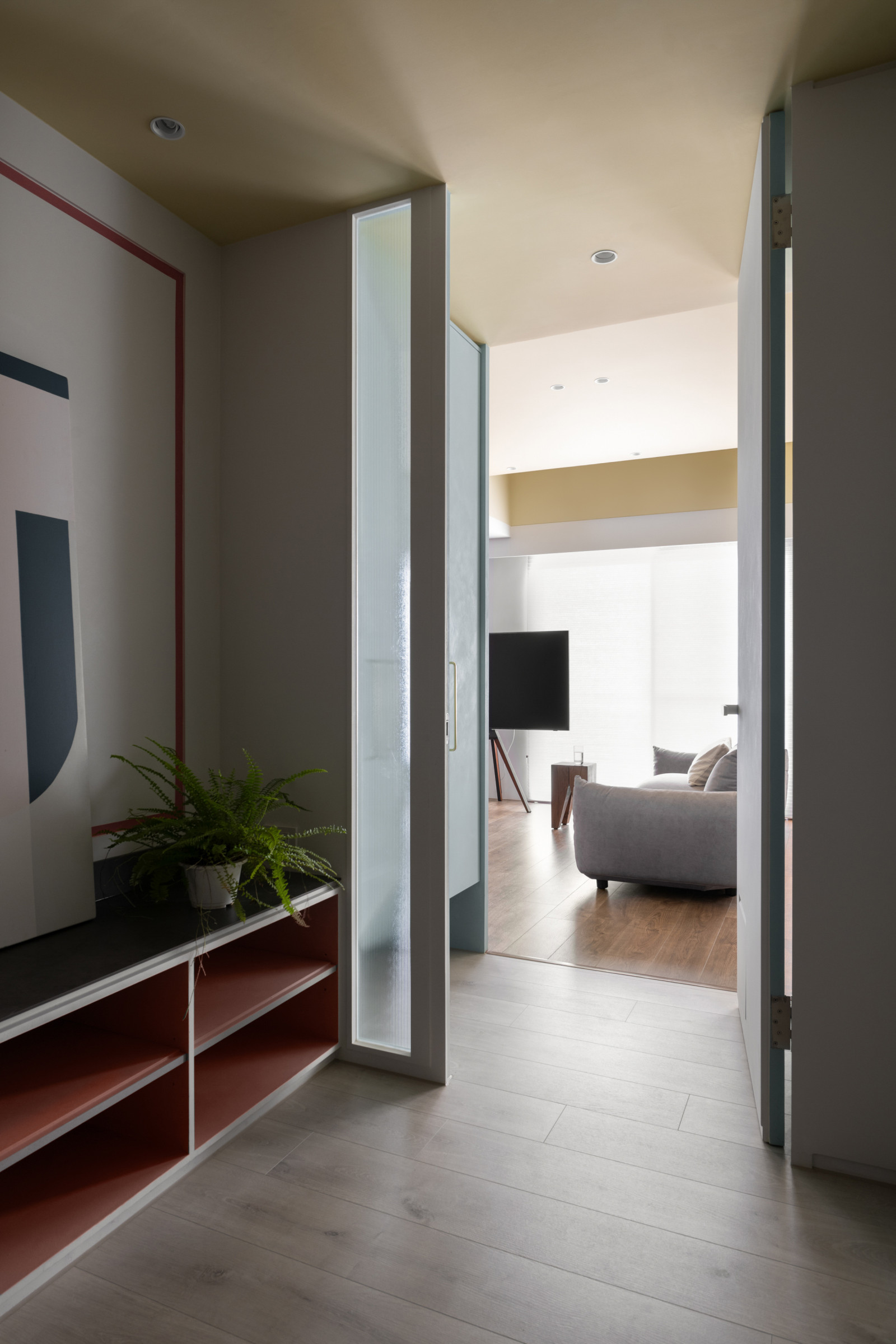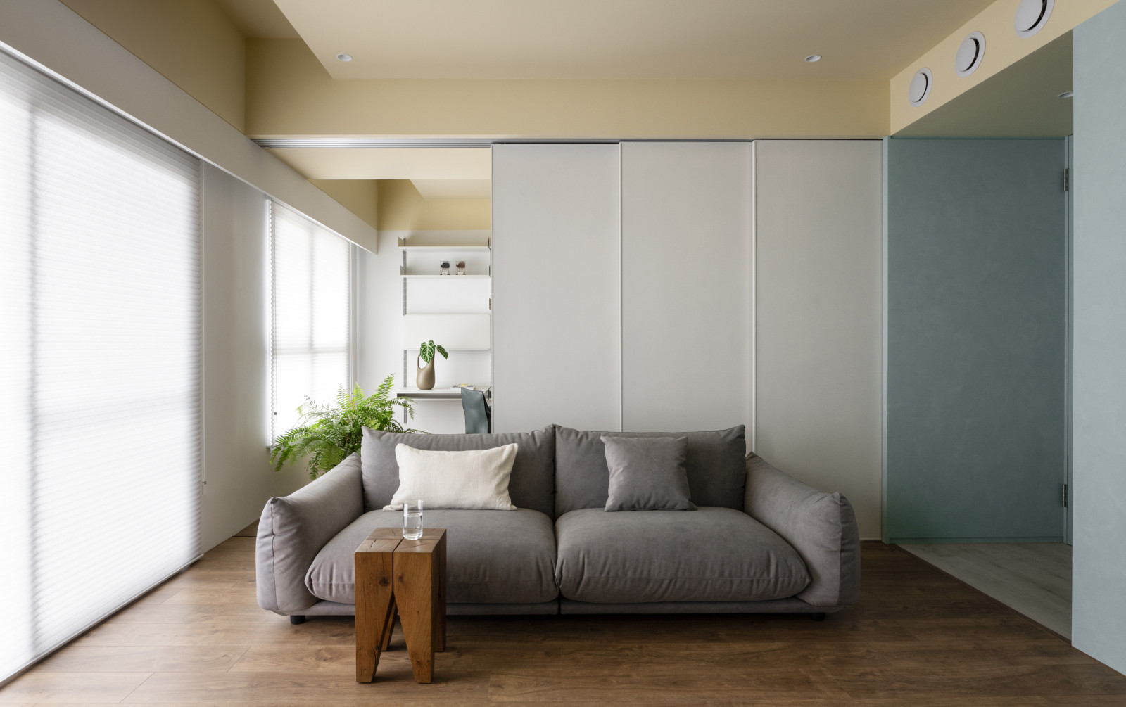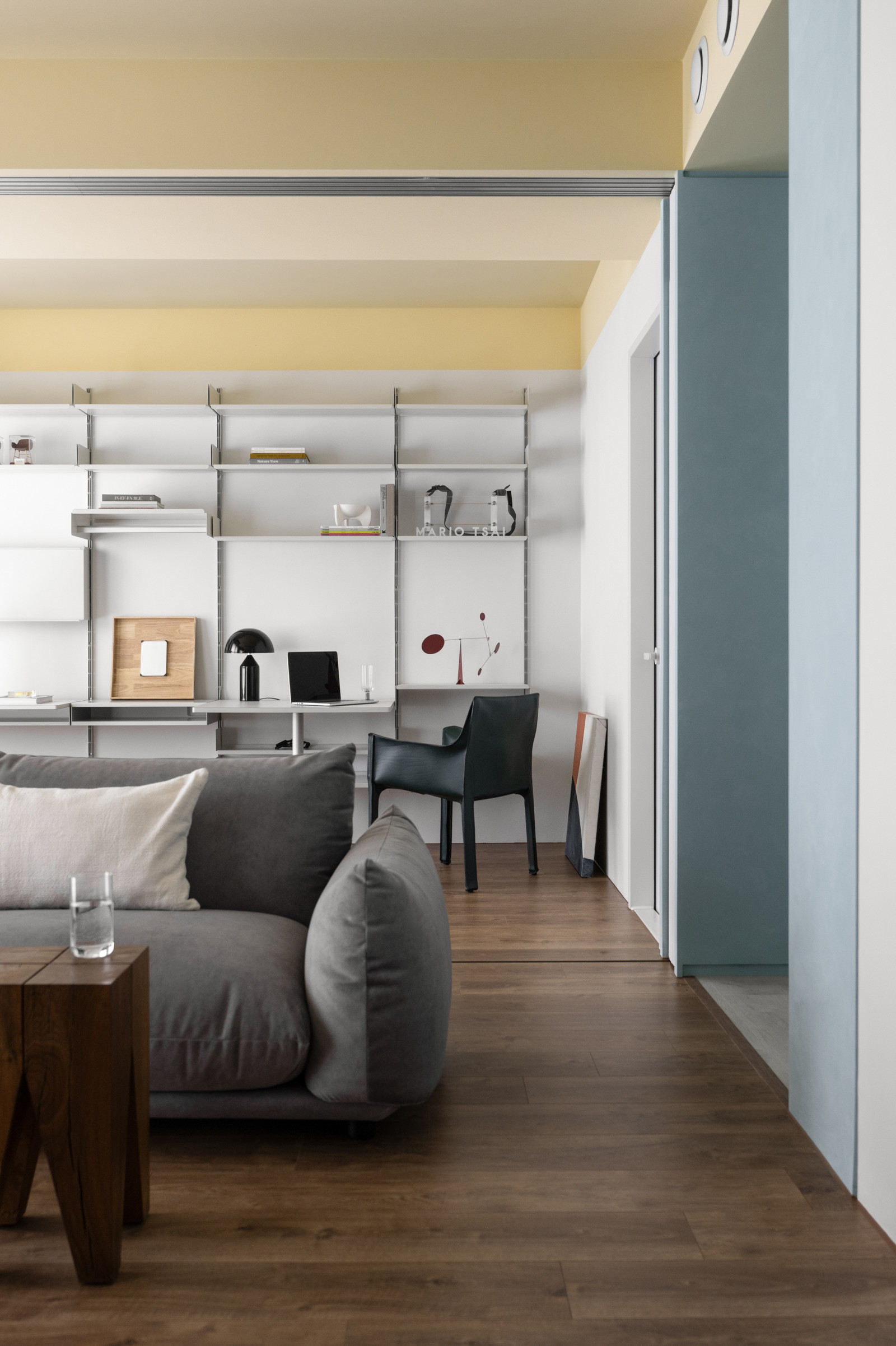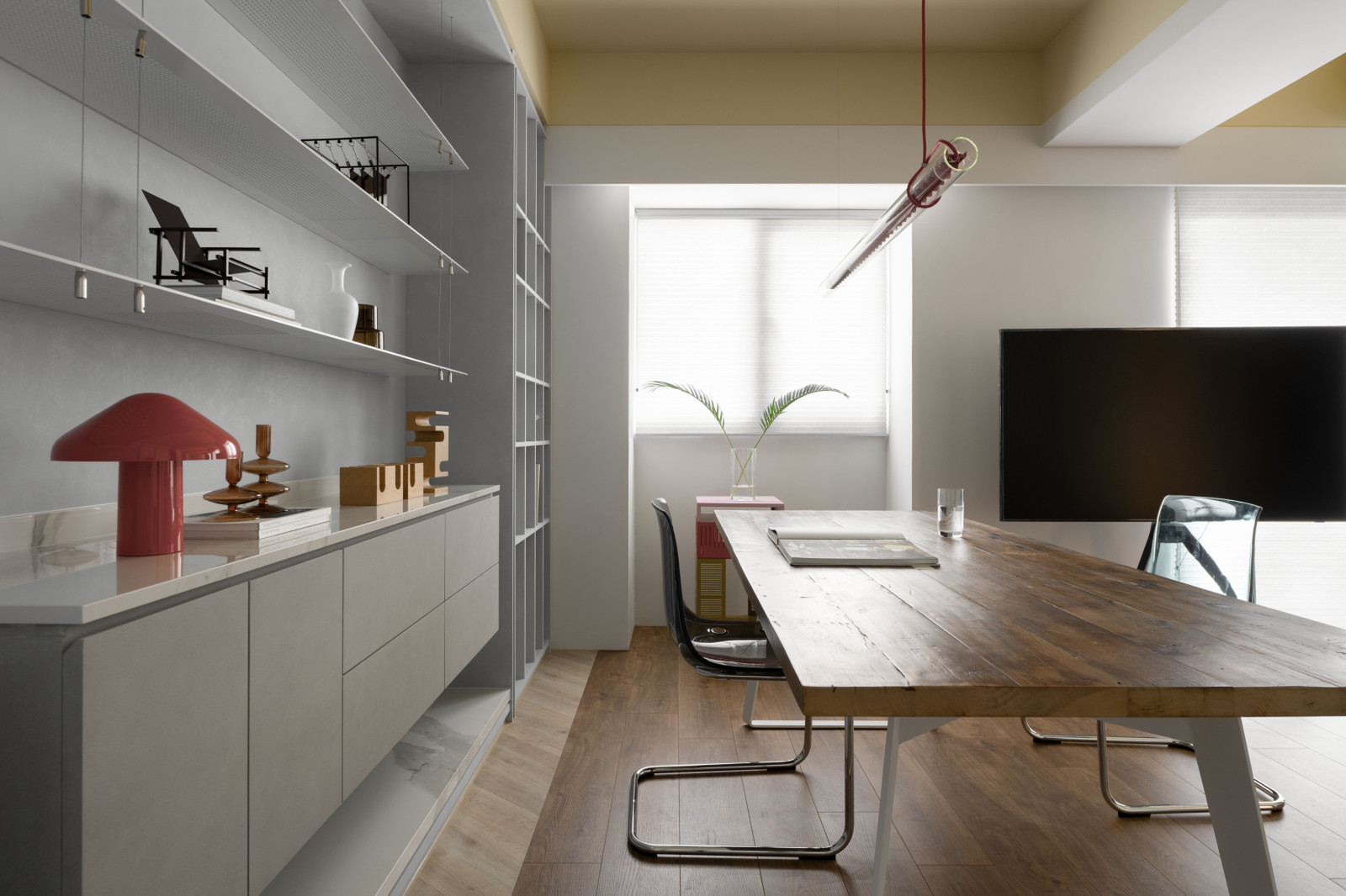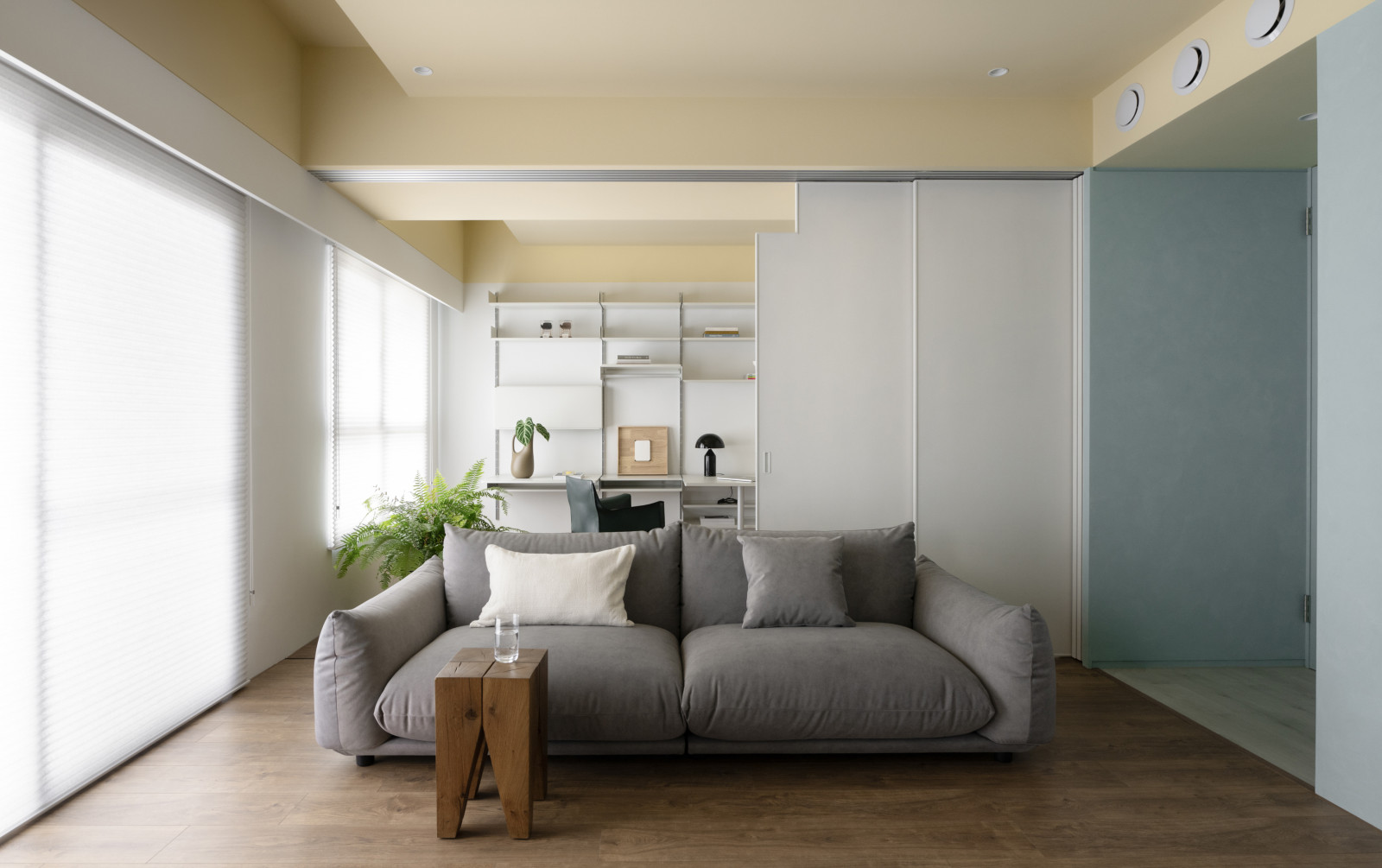 Life flows through the movement of sliding doors.An open layout connects the living room, dining area, and study, forming a bright, spacious core.Soft tones of blush pink, pastel yellow, and powder blue replace saturated colors, creating a calm modern style.Without a fixed TV wall, the standing TV and sofa can be rearranged freely for flexible living.Built-in desks and VITSOE shelving at both ends support the couple’s work-from-home needs.The study behind the sofa features sliding doors, allowing it to become a guest room or quiet meeting space.Sliding doors add both functional flexibility and visual depth.A yellow ceiling, wooden floors, and shifting wall tones create a warm, airy feel, while blush red door tracks add a bold, artistic accent.