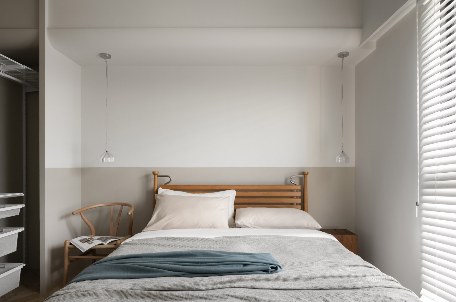因此,住宅透過井然有序的分界,在房屋中心區域以開放手法連結客廳、餐廳、書房,形成通透軒敞的公領域,也是家庭核心區。從生活視角而言,降低原風格色彩的飽和度,透過淡雅的粉橘紅、粉黃、粉藍鋪敘設計主題,傳遞風格派的精神。從雙玄關走入寬敞公領域,沒有固定電視牆,空間也就沒有侷限。站立式電視和沙發均可依循需求隨時移動,打造生活的自由彈性。男女主人都具有電腦工作的重度需求。公領域的兩端牆面利用長桌壁櫃和英國家具品牌VITSOE層架組因應同時居家辦公的靈活度。沙發後端的書房區加入拉門設計,當親戚朋友來訪時,可以完全關上門片以延伸出臨時臥室,抑或當工作期間須進行會議時,能有安靜獨立的空間品質。藉由彈性預設現代生活住宅越趨多元的機能性,拉門也創造了不同的視覺景深。天花板以粉黃色調輝映木地板,溫潤了日常;粉藍與純白於牆面適度變換,創造清爽舒適的日光美學;而粉橘紅色則點綴於滑門軌道上,成為家風景的一抹亮眼,讓平面畫作躍然為立體空間。| 桃園室內設計