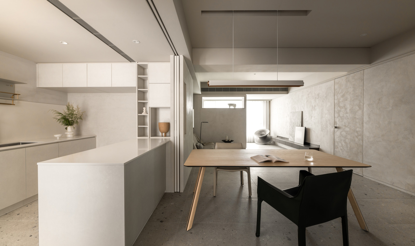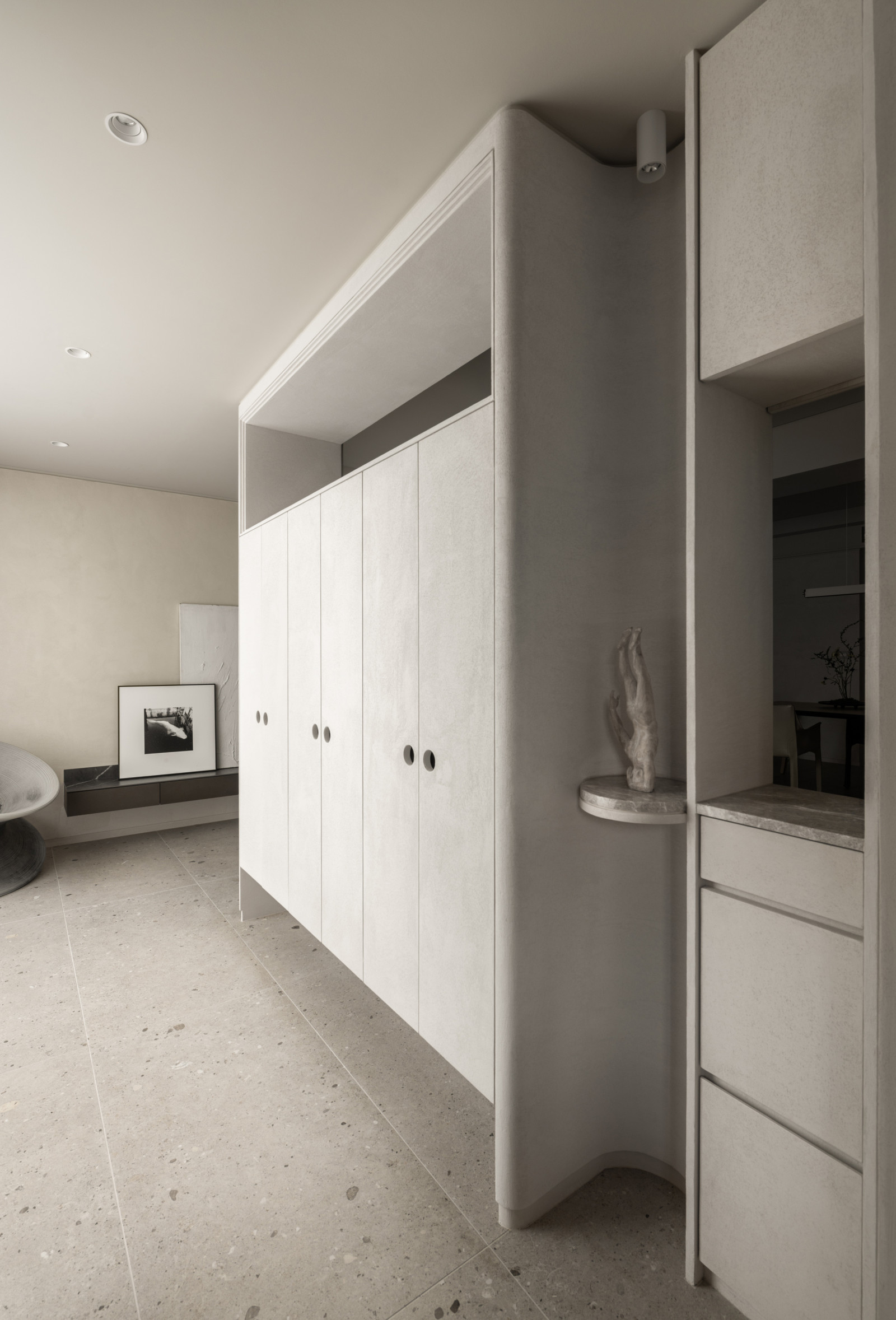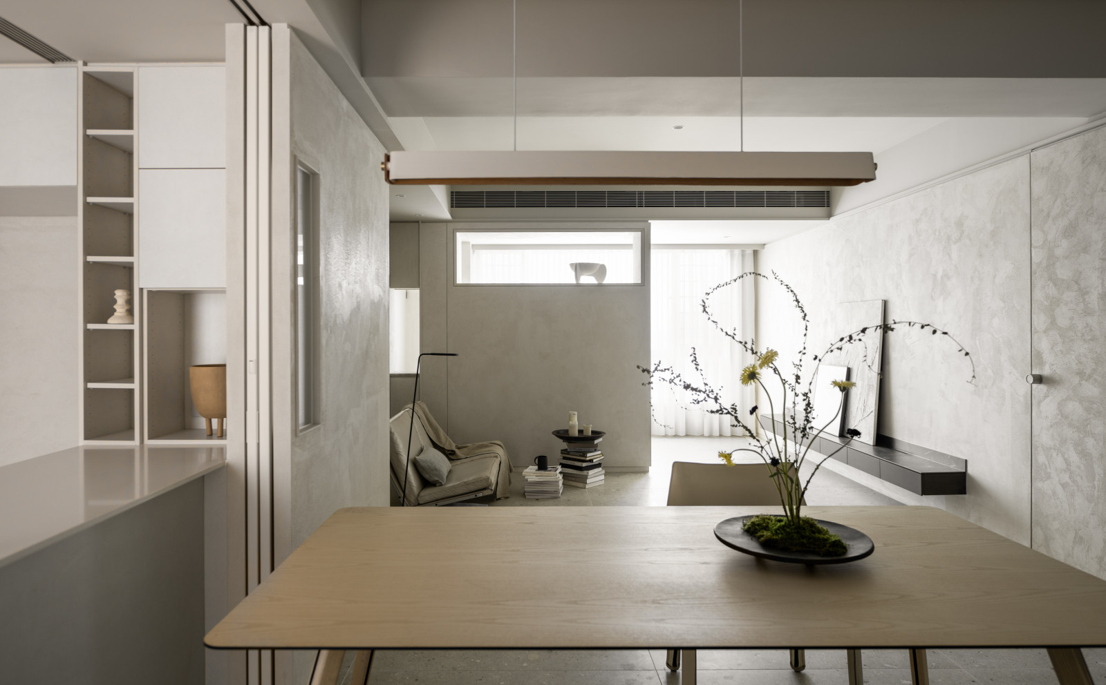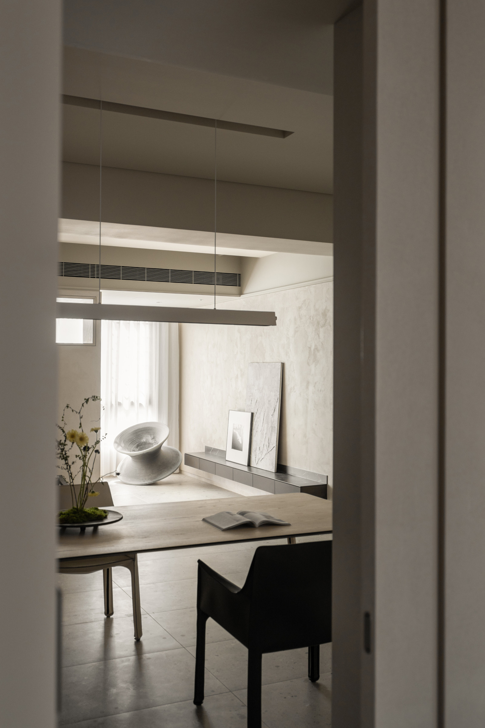 This 20-year-old top-floor apartment is transformed through the interplay of light, materials, and thoughtful spatial planning to create a serene and comfortable living environment. At the entrance, built-in cabinetry features asymmetrical openings that filter sunlight, softening heat and visual exposure—marking the beginning of the light’s journey. Textured artistic wall finishes and earth-toned wooden flooring enhance spatial depth and warmth.The semi-open layout connects the living room and kitchen-dining area, where a central island extends into the dining table, forming a continuous visual axis. A frosted sliding door between the kitchen and dining area allows light to pass while maintaining privacy, creating a calm and gentle atmosphere. Adjacent to the kitchen, the husband’s study is designed as a quiet, independent workspace. In the master bedroom, sliding door elements reappear on the TV wall, which, along with the headboard wall, integrates ample storage. Through refined materials, layered lighting, and functional zoning, this renovated apartment elevates quality of life—gently embracing natural light and emotional calm.