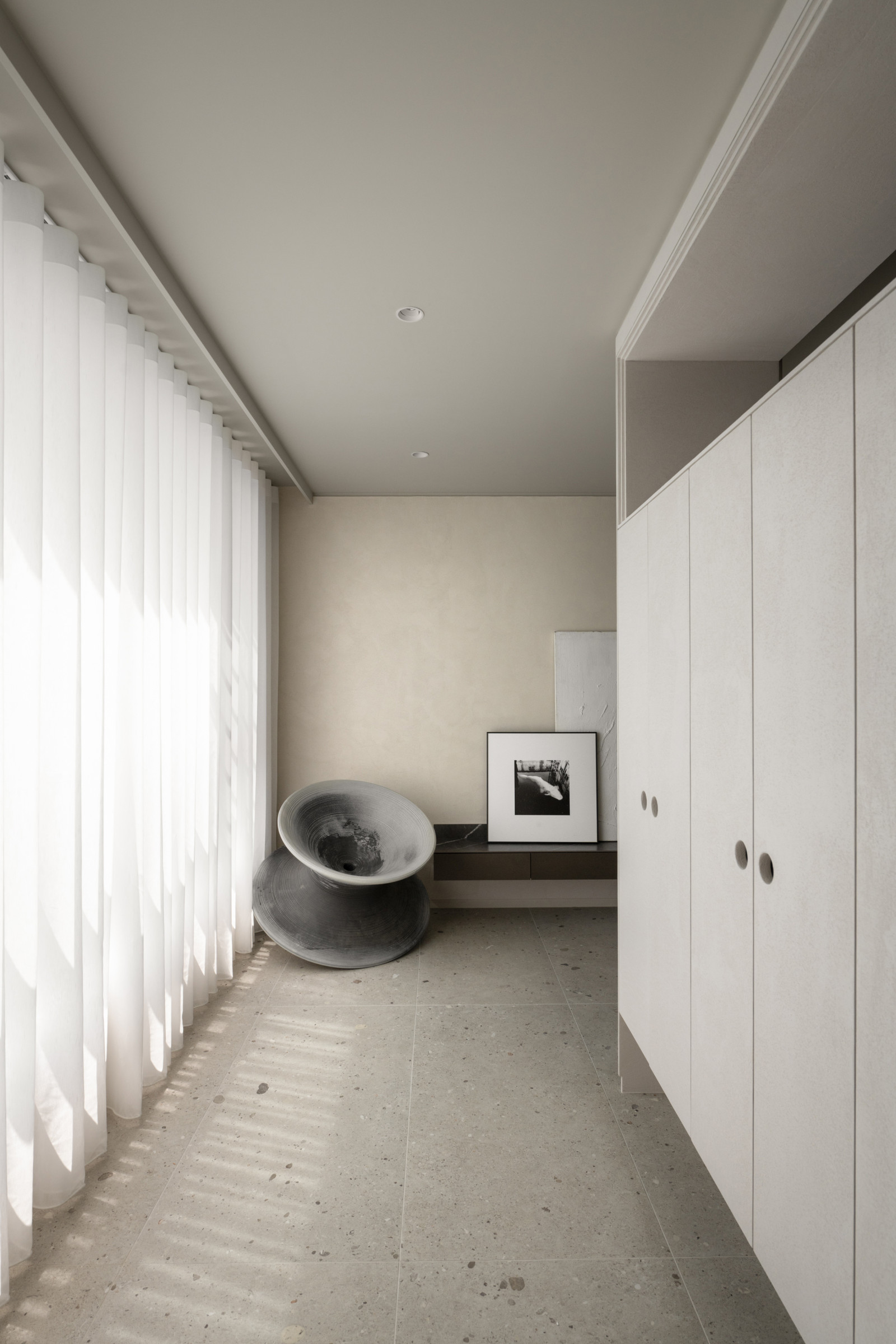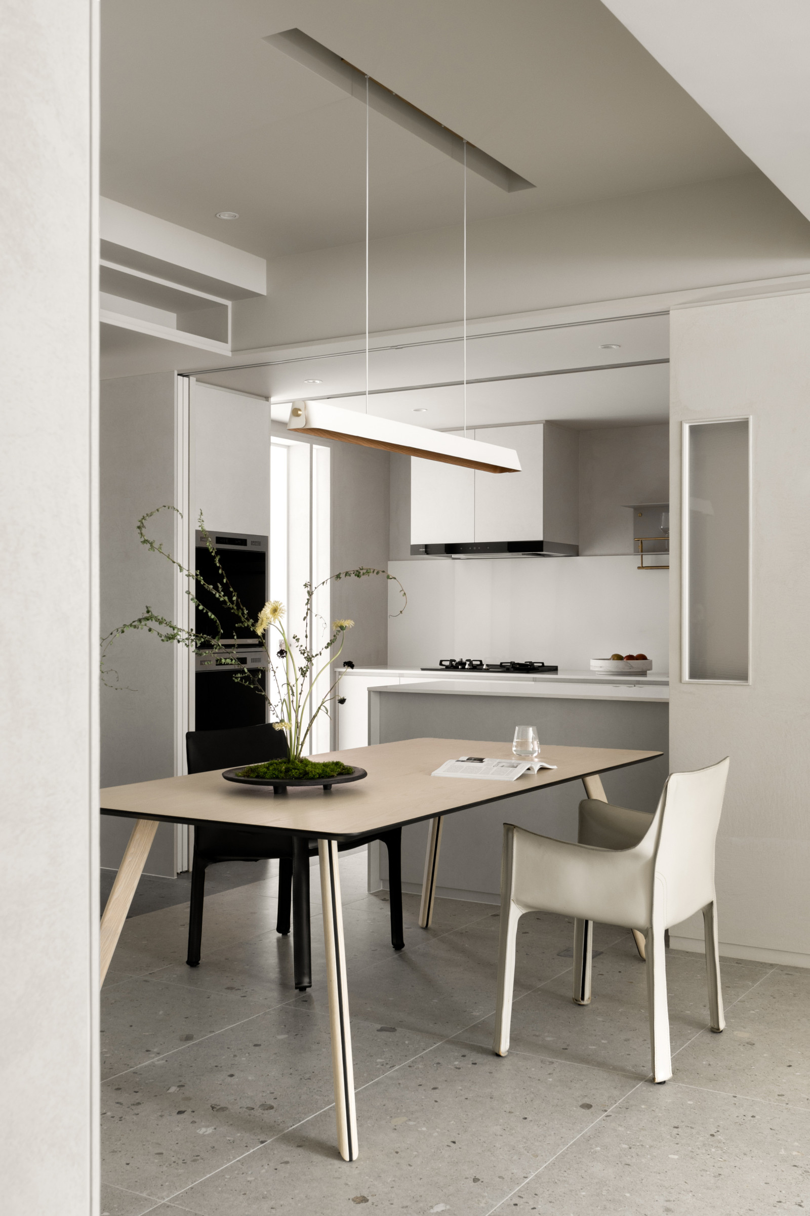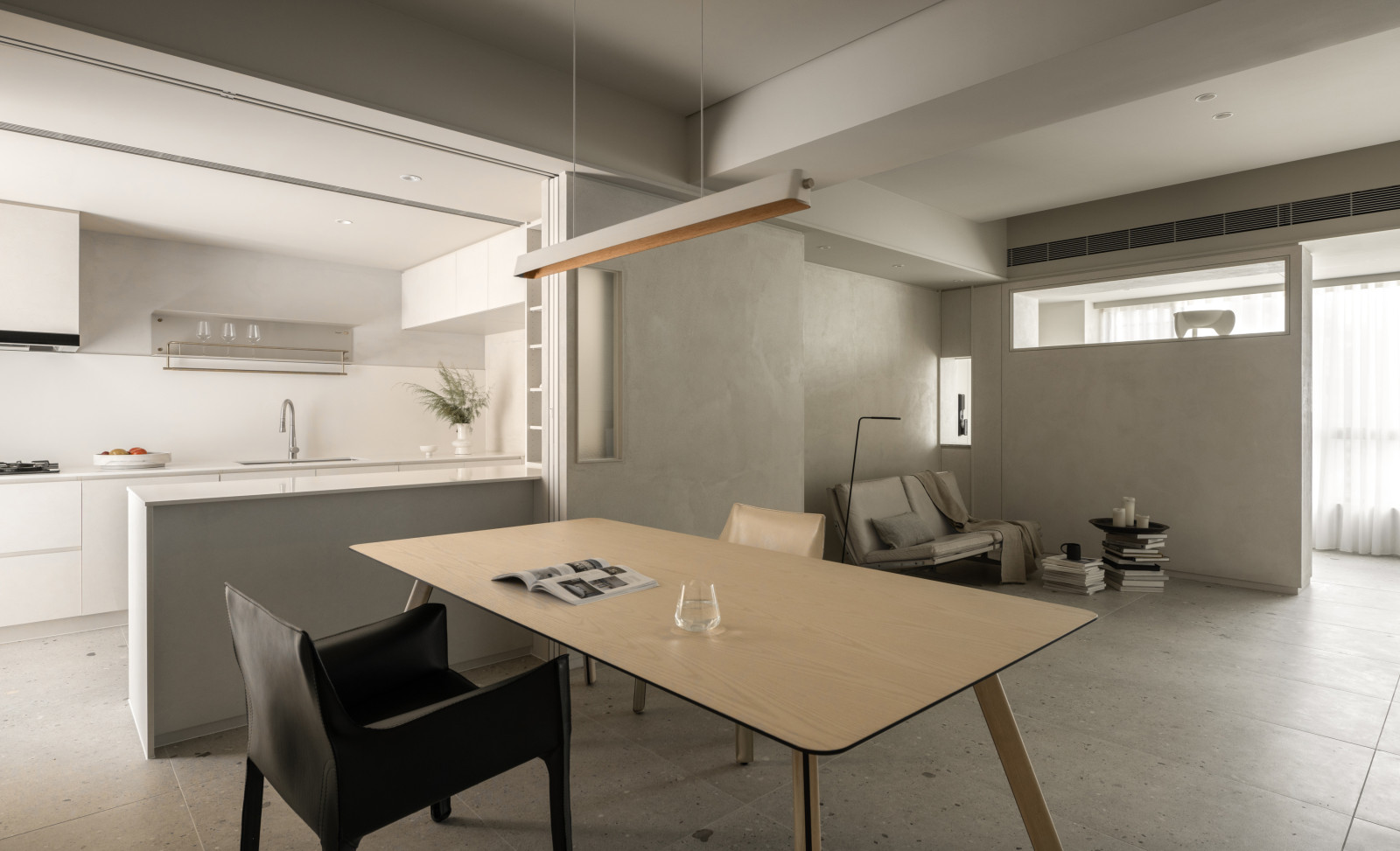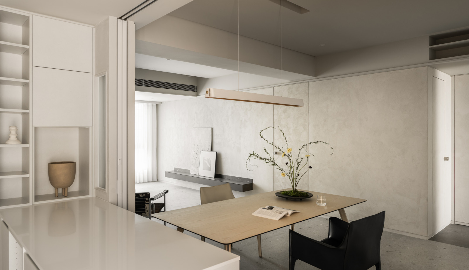 This 20-year-old top-floor apartment is transformed through the interplay of light, materials, and thoughtful spatial planning to create a serene and comfortable living environment. At the entrance, built-in cabinetry features asymmetrical openings that filter sunlight, softening heat and visual exposure—marking the beginning of the light’s journey. Textured artistic wall finishes and earth-toned wooden flooring enhance spatial depth and warmth.The semi-open layout connects the living room and kitchen-dining area, where a central island extends into the dining table, forming a continuous visual axis. A frosted sliding door between the kitchen and dining area allows light to pass while maintaining privacy, creating a calm and gentle atmosphere. Adjacent to the kitchen, the husband’s study is designed as a quiet, independent workspace. In the master bedroom, sliding door elements reappear on the TV wall, which, along with the headboard wall, integrates ample storage. Through refined materials, layered lighting, and functional zoning, this renovated apartment elevates quality of life—gently embracing natural light and emotional calm.