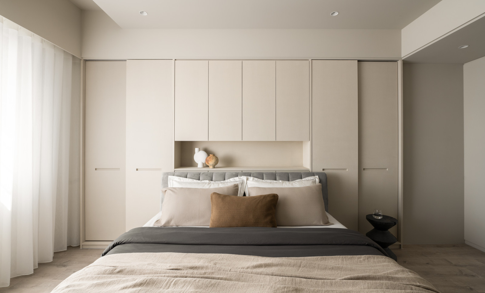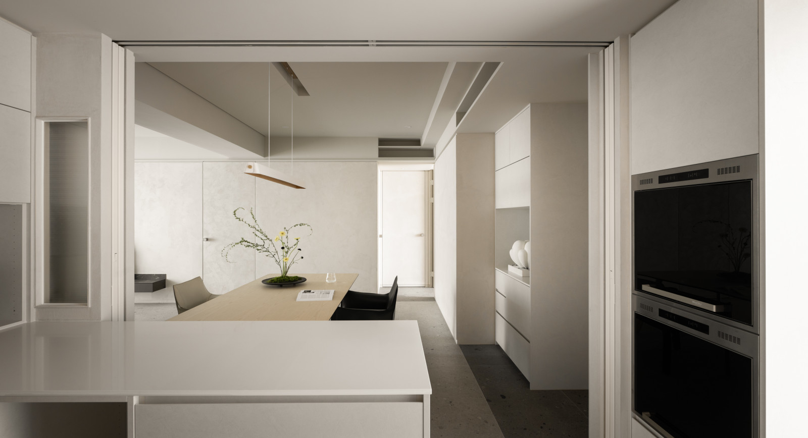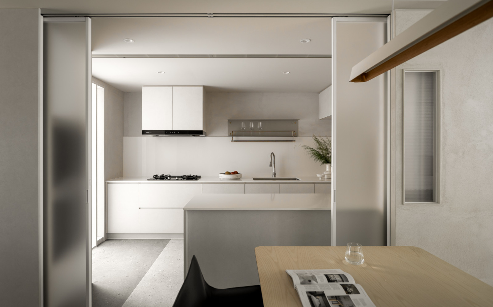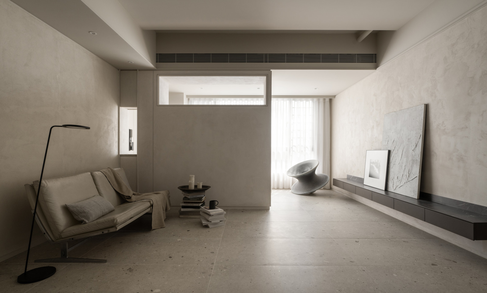 This 20-year-old top-floor apartment is transformed through the interplay of light, materials, and thoughtful spatial planning to create a serene and comfortable living environment. At the entrance, built-in cabinetry features asymmetrical openings that filter sunlight, softening heat and visual exposure—marking the beginning of the light’s journey. Textured artistic wall finishes and earth-toned wooden flooring enhance spatial depth and warmth.The semi-open layout connects the living room and kitchen-dining area, where a central island extends into the dining table, forming a continuous visual axis. A frosted sliding door between the kitchen and dining area allows light to pass while maintaining privacy, creating a calm and gentle atmosphere. Adjacent to the kitchen, the husband’s study is designed as a quiet, independent workspace. In the master bedroom, sliding door elements reappear on the TV wall, which, along with the headboard wall, integrates ample storage. Through refined materials, layered lighting, and functional zoning, this renovated apartment elevates quality of life—gently embracing natural light and emotional calm.