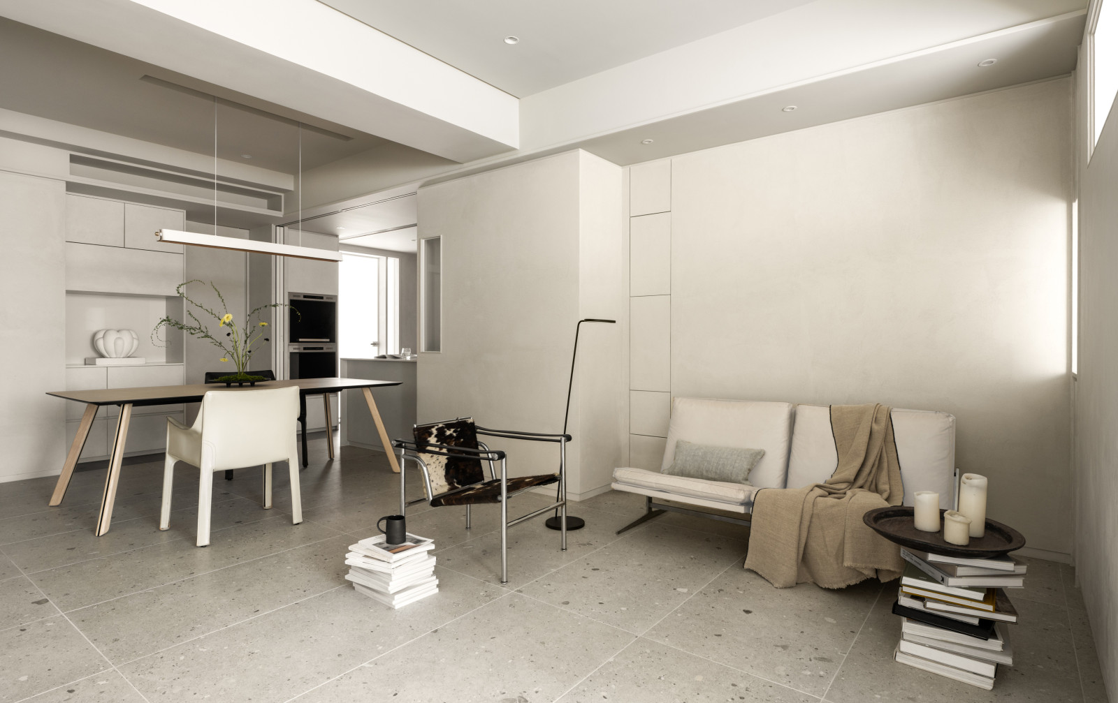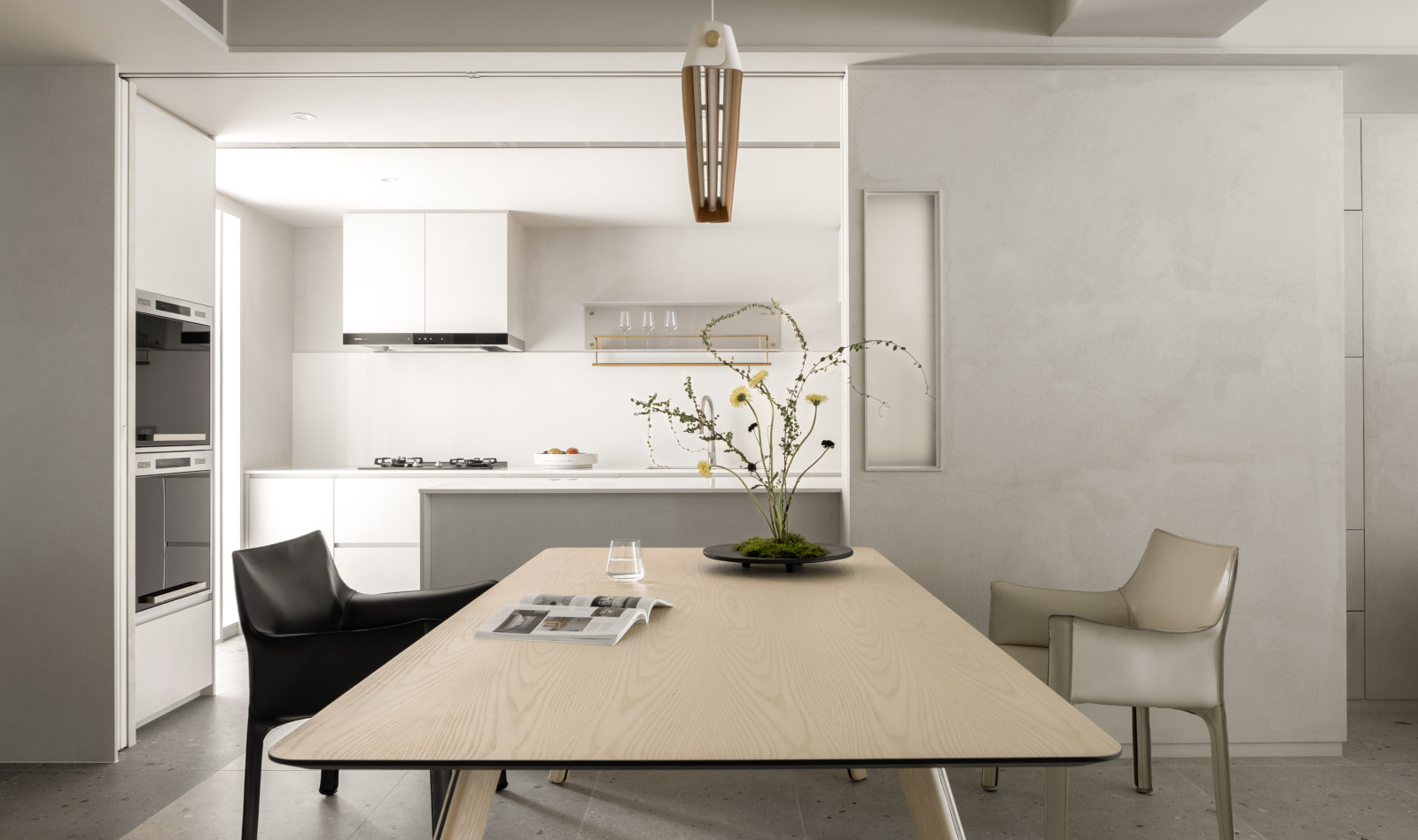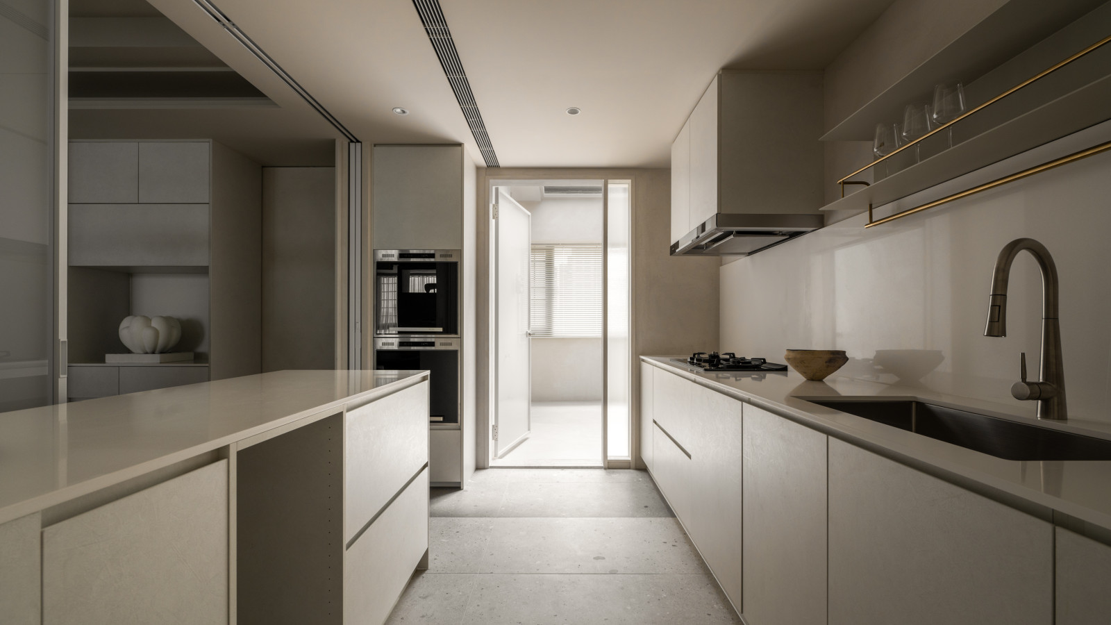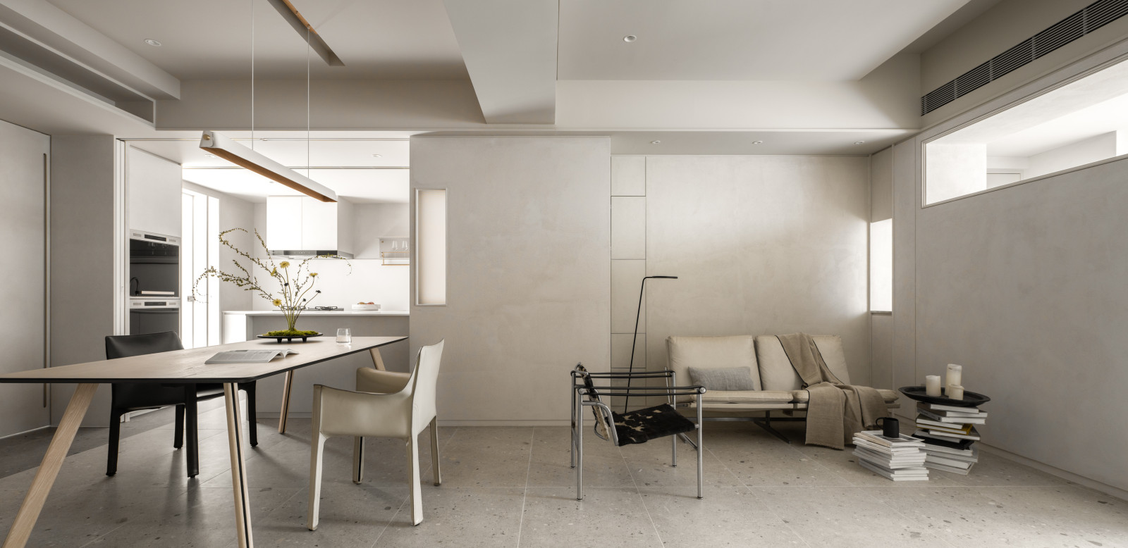 This 20-year-old top-floor apartment is transformed through the interplay of light, materials, and thoughtful spatial planning to create a serene and comfortable living environment. At the entrance, built-in cabinetry features asymmetrical openings that filter sunlight, softening heat and visual exposure—marking the beginning of the light’s journey. Textured artistic wall finishes and earth-toned wooden flooring enhance spatial depth and warmth.The semi-open layout connects the living room and kitchen-dining area, where a central island extends into the dining table, forming a continuous visual axis. A frosted sliding door between the kitchen and dining area allows light to pass while maintaining privacy, creating a calm and gentle atmosphere. Adjacent to the kitchen, the husband’s study is designed as a quiet, independent workspace. In the master bedroom, sliding door elements reappear on the TV wall, which, along with the headboard wall, integrates ample storage. Through refined materials, layered lighting, and functional zoning, this renovated apartment elevates quality of life—gently embracing natural light and emotional calm.