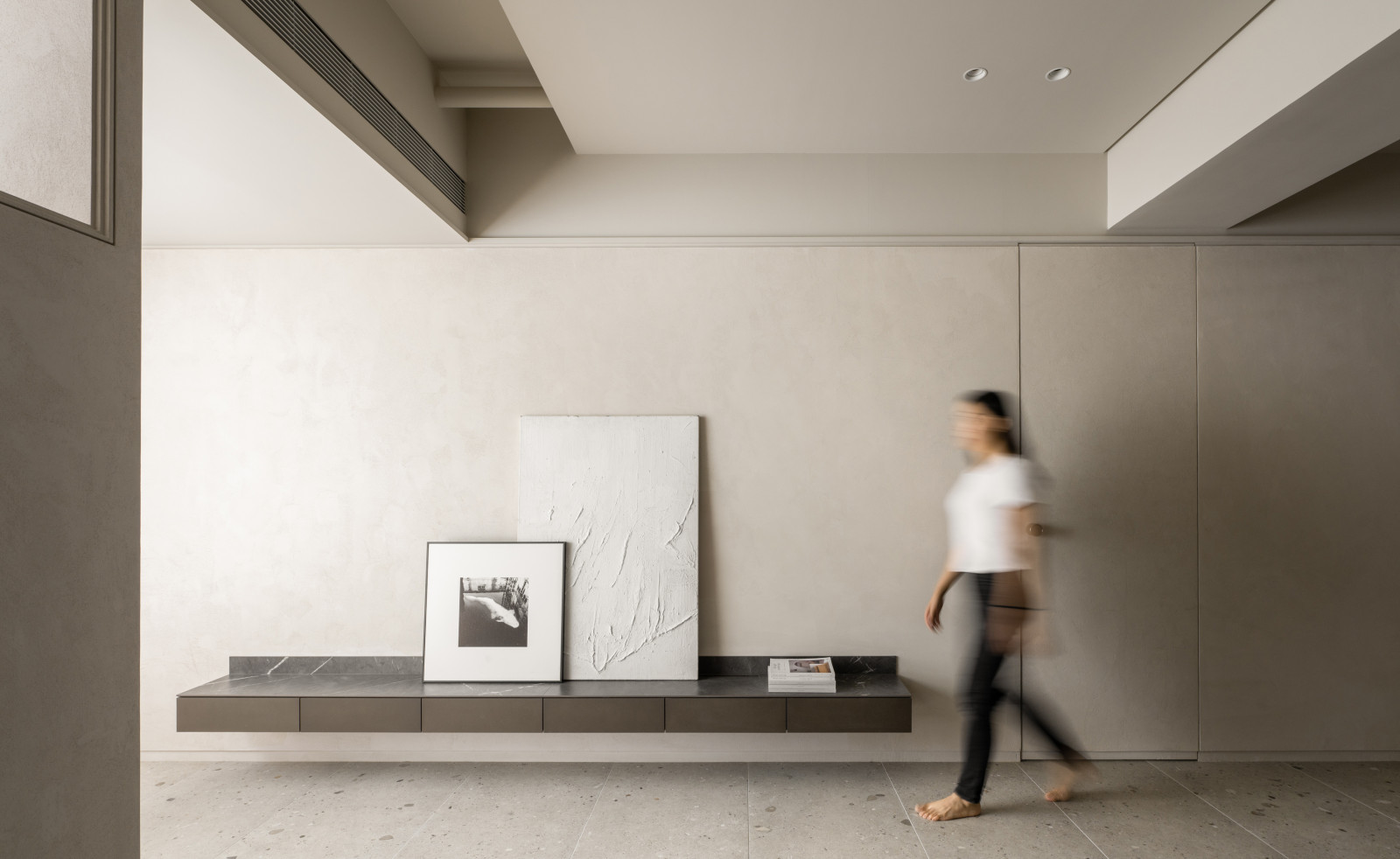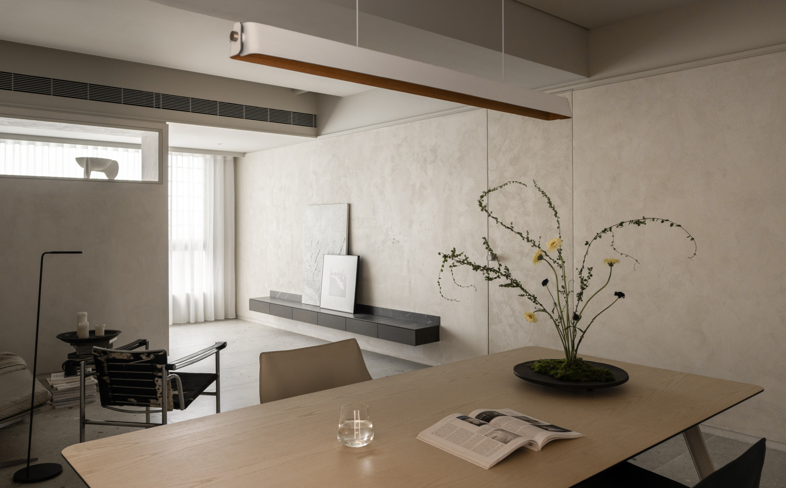 光,隨著不同時間、季節而變化;而於此處,依循牆上開口大小與否,讓光影呈現截然不同的層次與深度。光的途徑,從玄關而起。住宅基地為20年中古屋,位居頂樓,室內單向採光且西曬。結合收納櫃體設計的牆面,上方與側邊打造了一大一小的開口,在家門與採光窗面處形成第一道端口,篩濾光照的熱度,以及過曝的視野。屋內牆面藉由藝術塗料的手感紋理,爬梳陽光彰顯於空間的立體感。木地坪、傢俱幾近一致的大地色系,為屋主賦予寧靜舒適的鬆弛感。公共領域由客廳與餐廚區半開放銜接。廚房區利用中軸線和結構柱劃分而成,吧台中島巧妙與餐桌結合,形成跨領域延伸的視覺端景。同時,廚房與餐桌之間,規劃了霧面玻璃隱藏式拉門,透光不透視,成為第二道篩濾光線的端口,也打造了溫柔沈澱的簡約畫面。廚房電器櫃旁設定為男主人的獨立書房,工作時不受干擾。主臥房則延續拉門設計元素運用於壁掛電視牆,牆後方與床頭板後方皆規劃充足的收納空間,依然以大地色系渲染了溫馨。即使是中古屋仍能透過材質機能與空間格局改善現狀,創造居住品質,緩下情緒,淺讀自然舒展於空間的光影。| 桃園室內設計 | 空間規劃 | 中古屋翻修 |