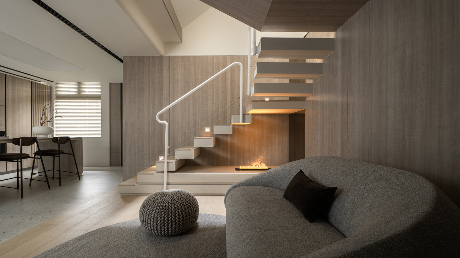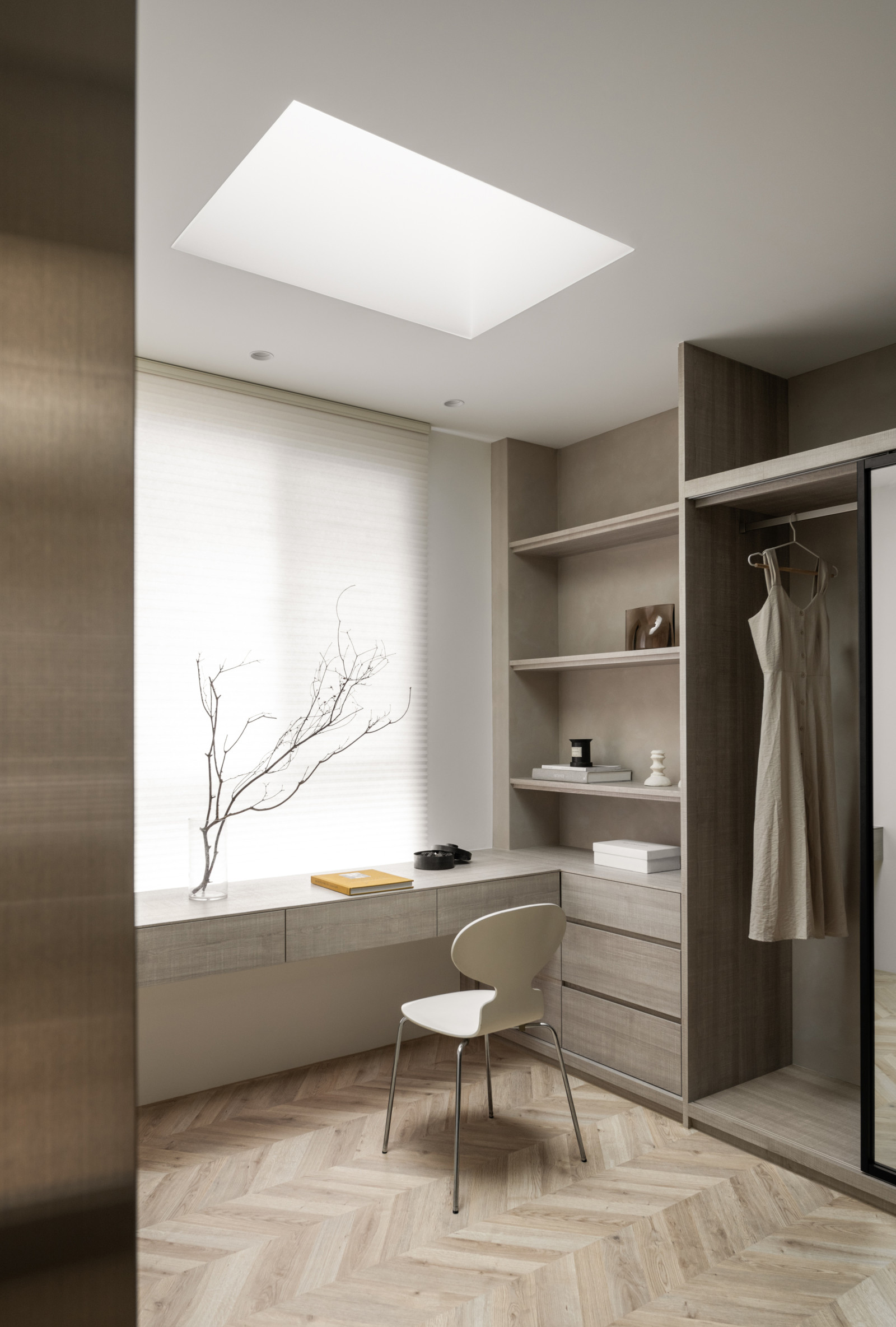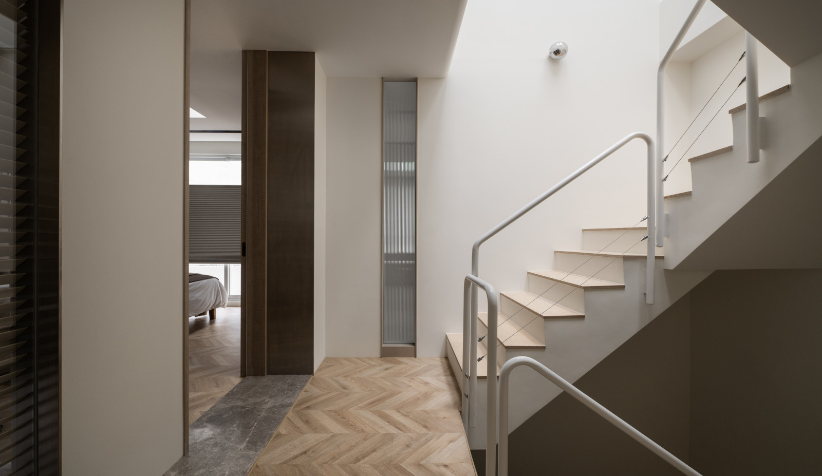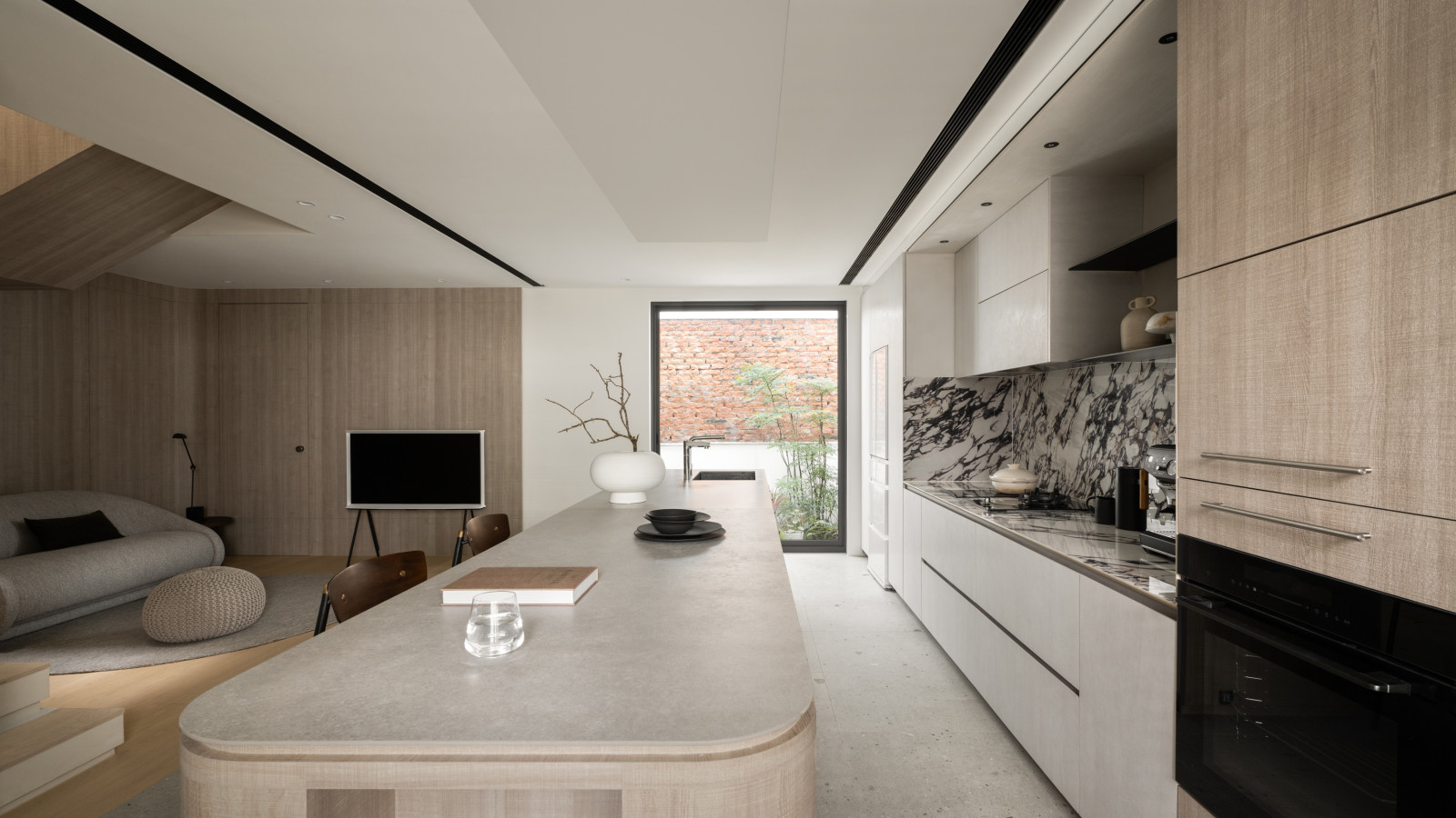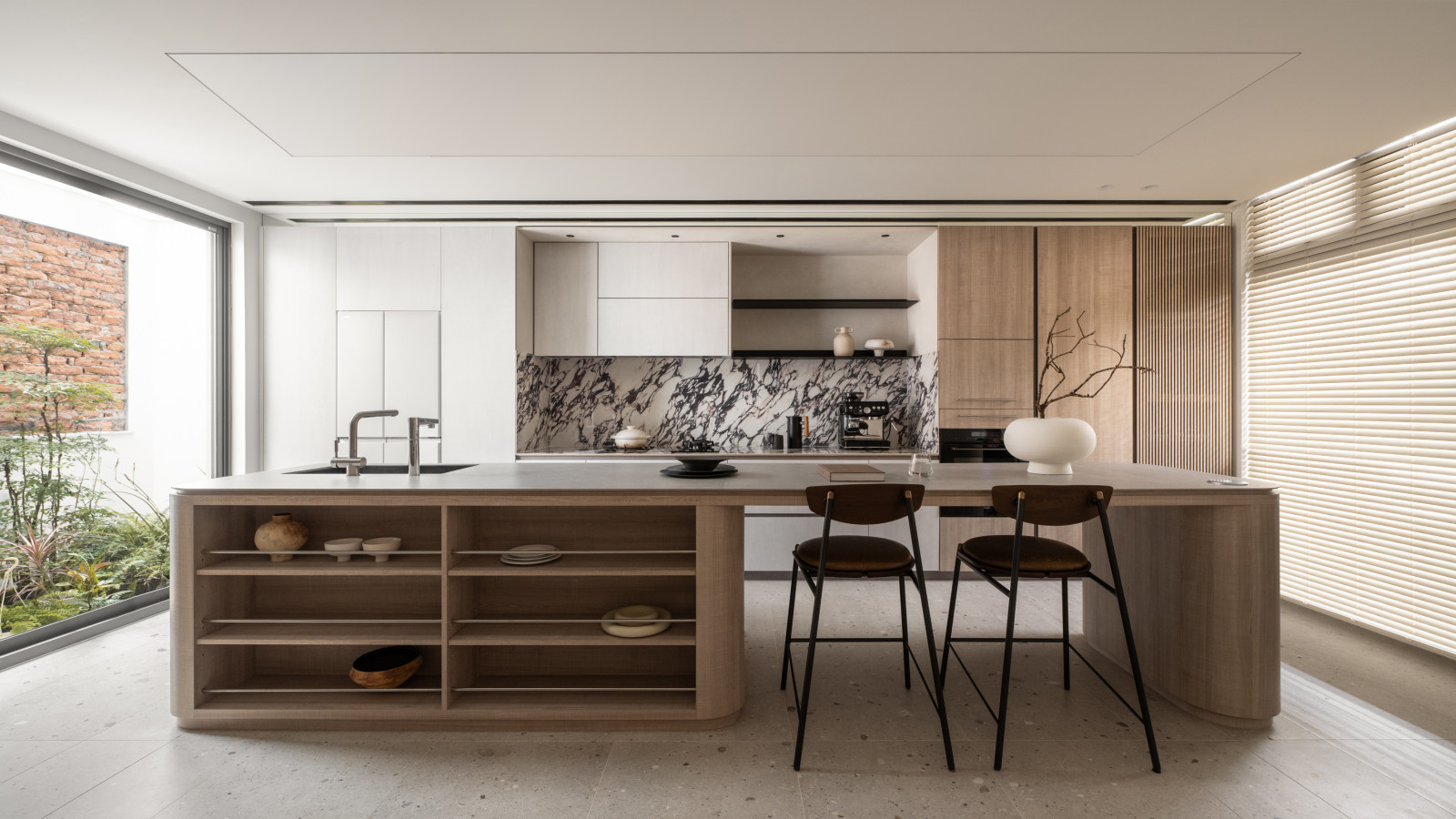 Tree shadows in the courtyard draw greenery into the interior, simplifying the circulation and layout of the old house to meet modern living needs.The central island anchors the public space, blending stone and wood to highlight a warm, natural texture.A cantilevered staircase and double-height skylight express lightness and spatial extension, with dynamic shifts of light and shadow.Storage design extends through the kitchen and dining areas, integrating pleated blinds, slatted doors, and metal elements to showcase a harmonious blend of materials.On the second floor, the audiovisual and workspace are unified behind concealed sliding doors.The master bedroom continues the language of curves and herringbone flooring, creating a serene and elegant atmosphere.The bathroom features wet-dry separation, with a freestanding bathtub and recessed niches that enhance the bathing experience.