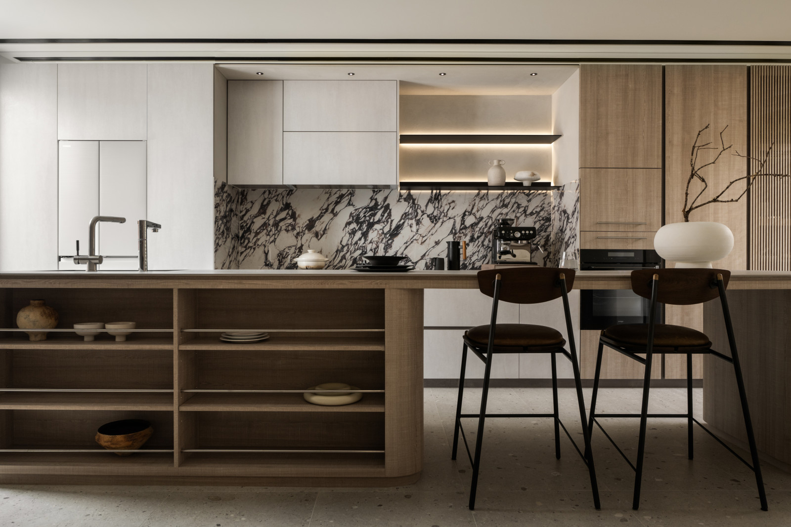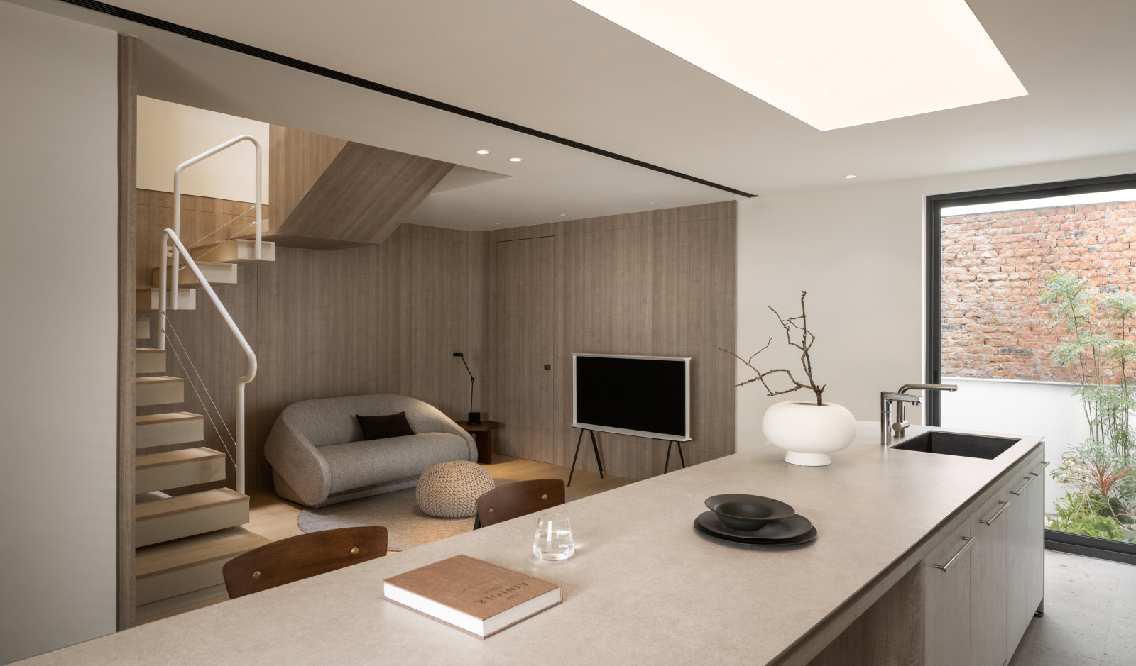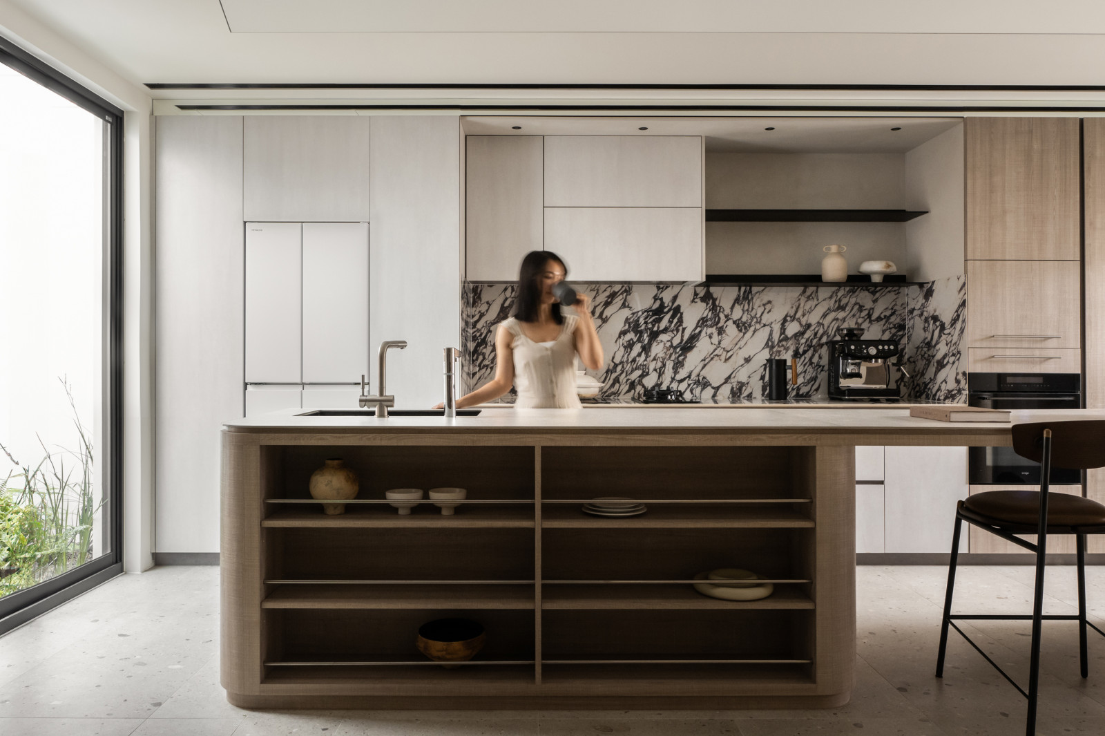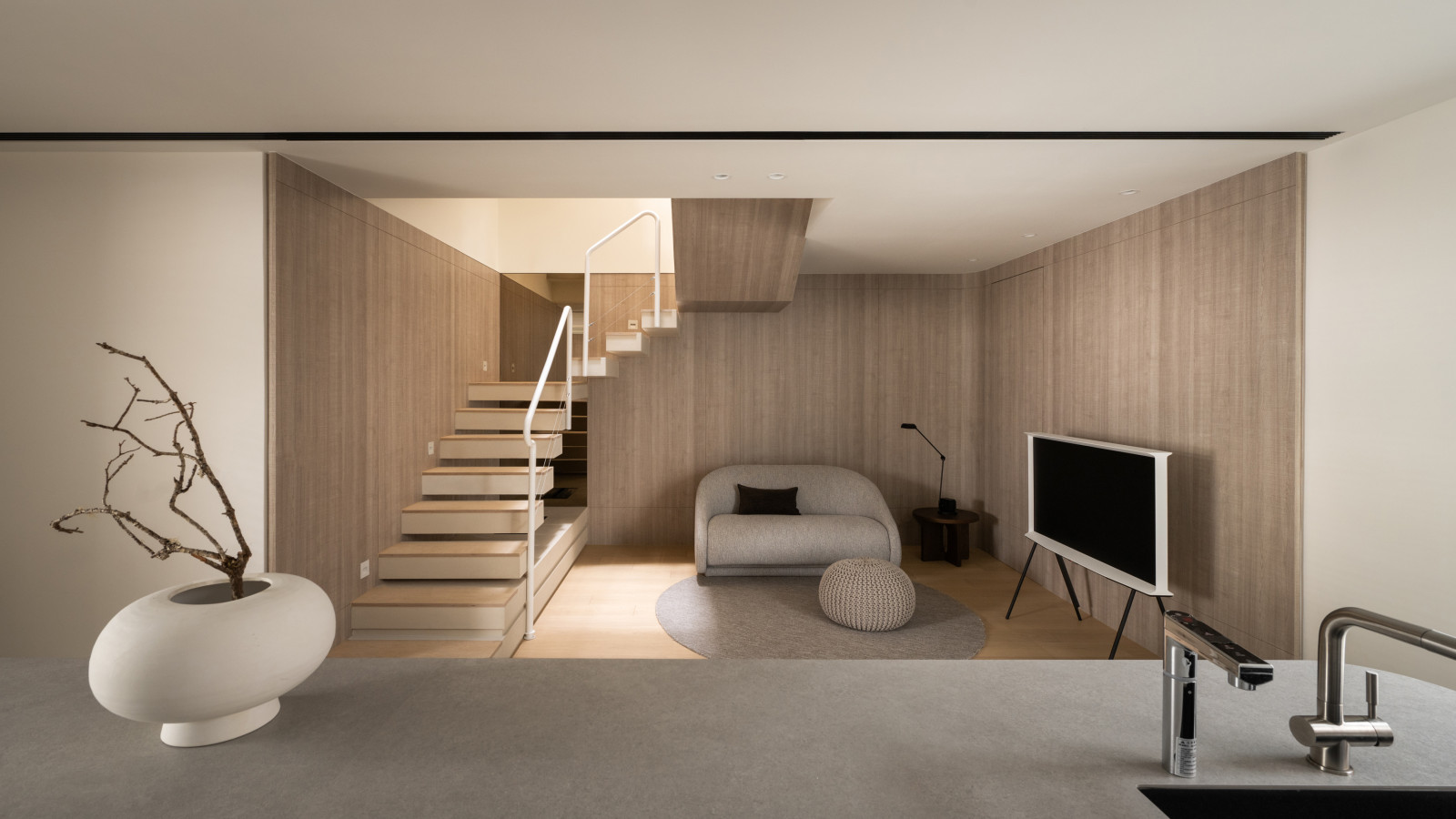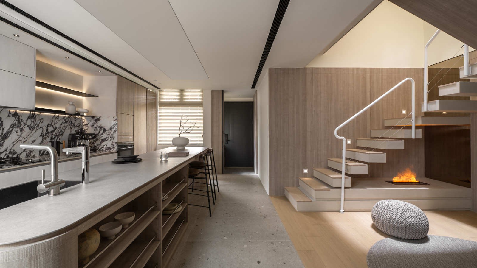 Tree shadows in the courtyard draw greenery into the interior, simplifying the circulation and layout of the old house to meet modern living needs.The central island anchors the public space, blending stone and wood to highlight a warm, natural texture.A cantilevered staircase and double-height skylight express lightness and spatial extension, with dynamic shifts of light and shadow.Storage design extends through the kitchen and dining areas, integrating pleated blinds, slatted doors, and metal elements to showcase a harmonious blend of materials.On the second floor, the audiovisual and workspace are unified behind concealed sliding doors.The master bedroom continues the language of curves and herringbone flooring, creating a serene and elegant atmosphere.The bathroom features wet-dry separation, with a freestanding bathtub and recessed niches that enhance the bathing experience.