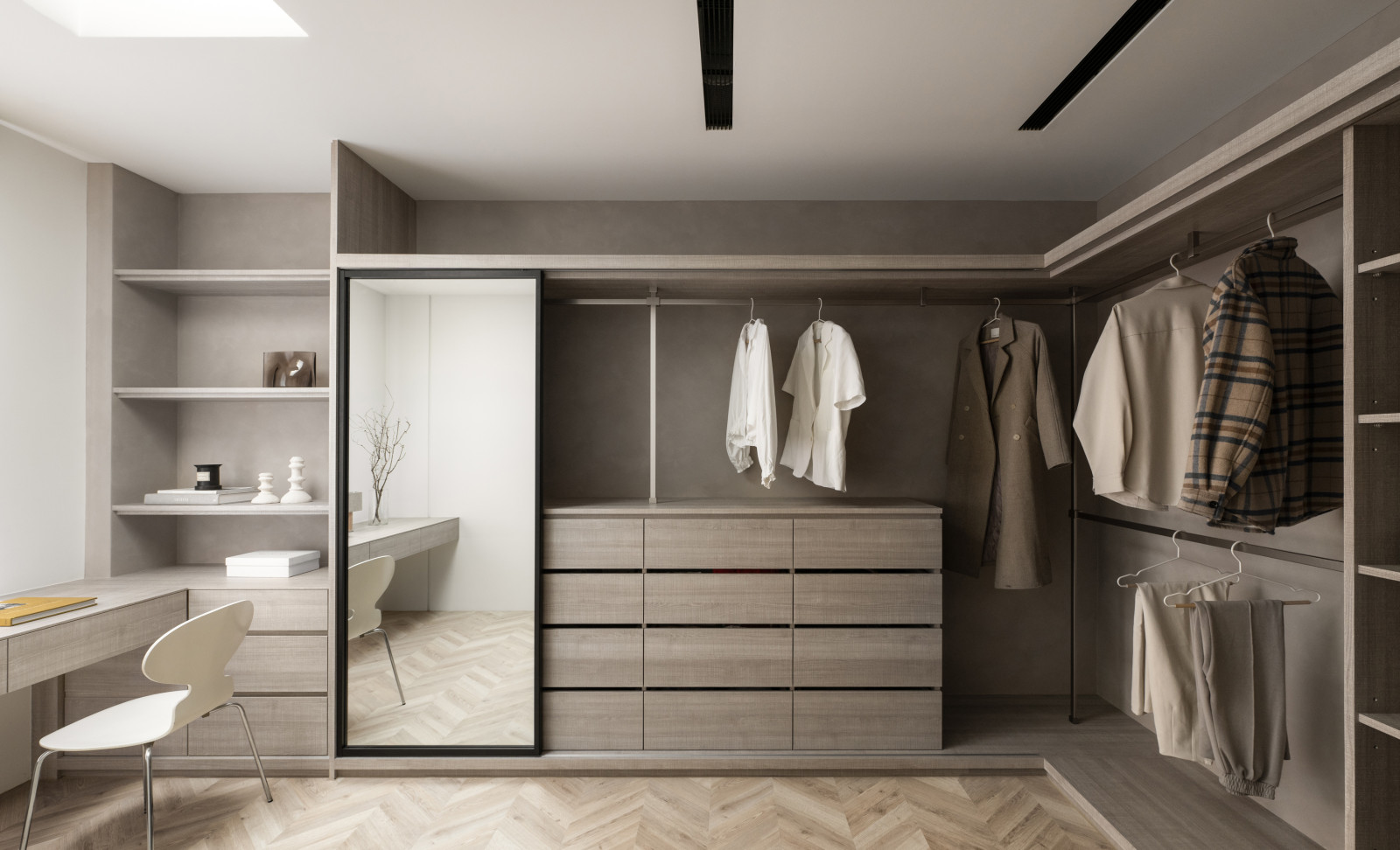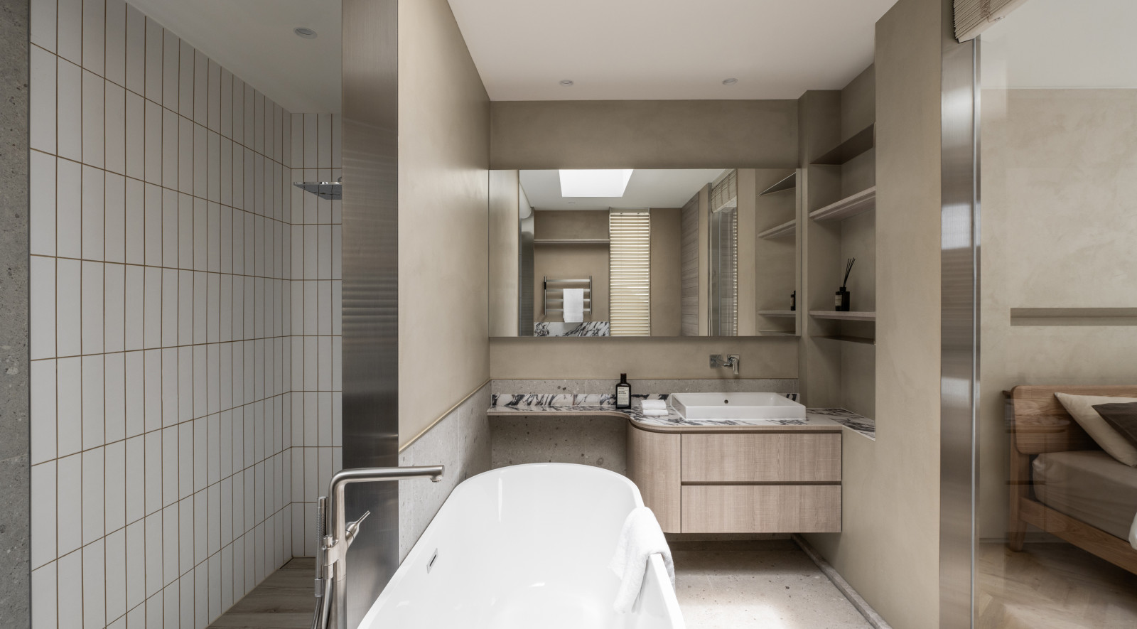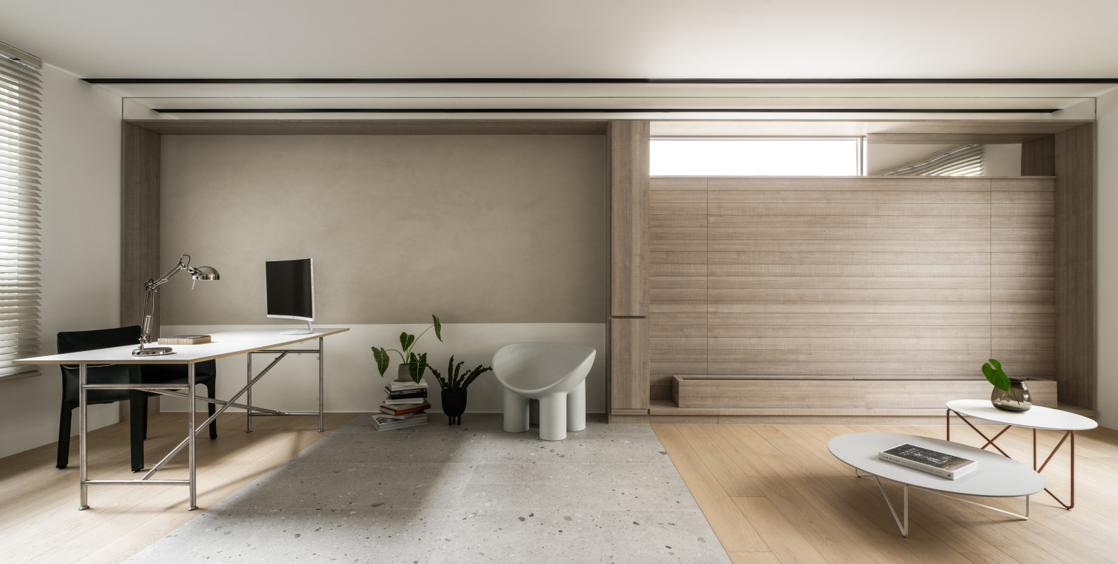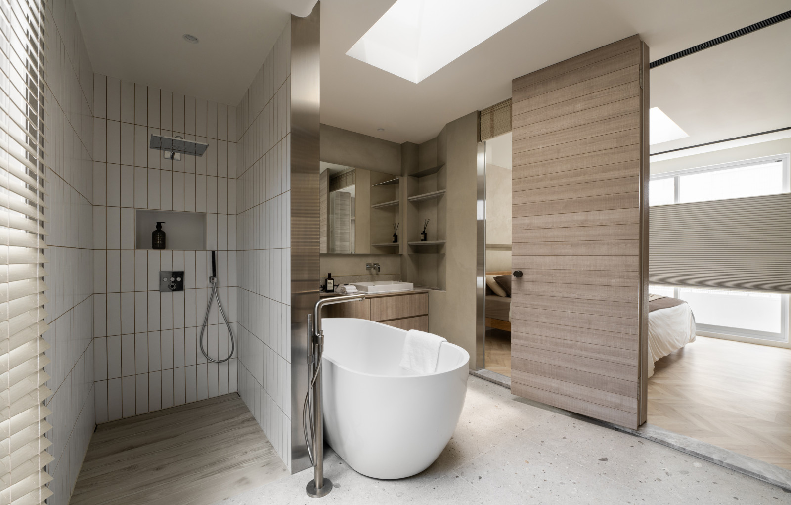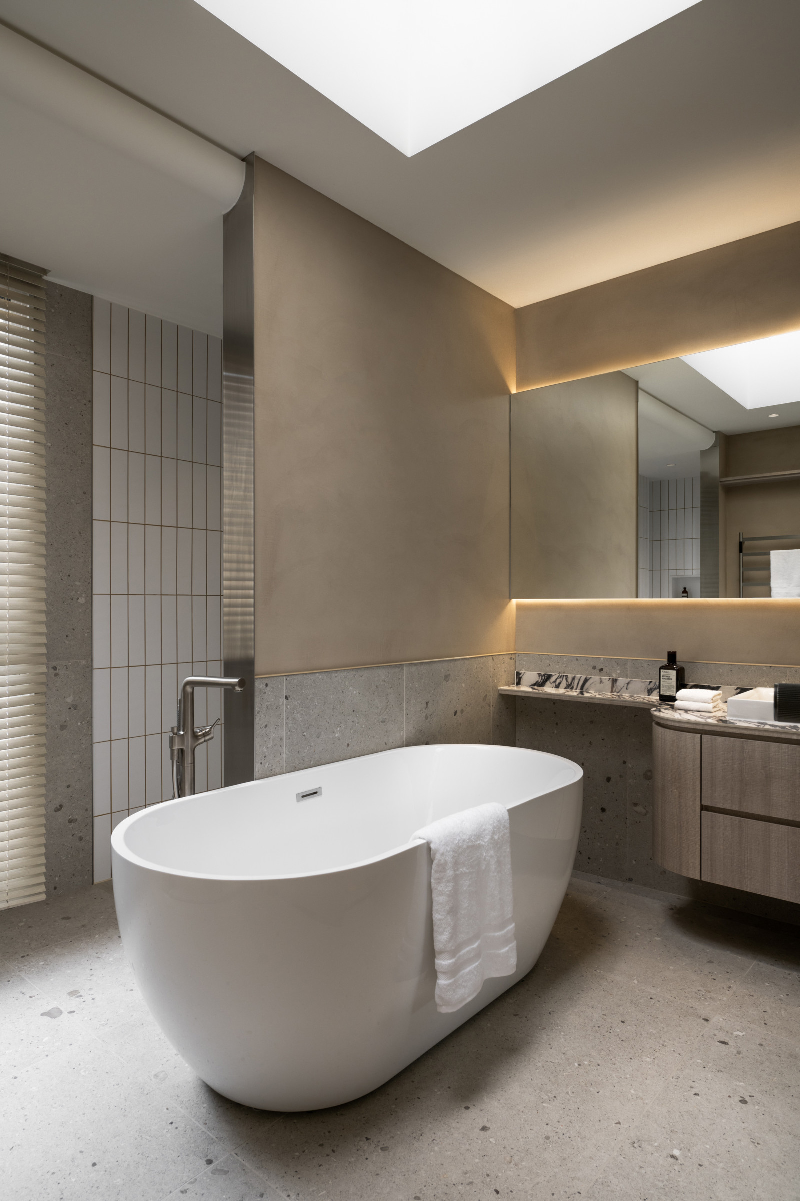 Tree shadows in the courtyard draw greenery into the interior, simplifying the circulation and layout of the old house to meet modern living needs.The central island anchors the public space, blending stone and wood to highlight a warm, natural texture.A cantilevered staircase and double-height skylight express lightness and spatial extension, with dynamic shifts of light and shadow.Storage design extends through the kitchen and dining areas, integrating pleated blinds, slatted doors, and metal elements to showcase a harmonious blend of materials.On the second floor, the audiovisual and workspace are unified behind concealed sliding doors.The master bedroom continues the language of curves and herringbone flooring, creating a serene and elegant atmosphere.The bathroom features wet-dry separation, with a freestanding bathtub and recessed niches that enhance the bathing experience.