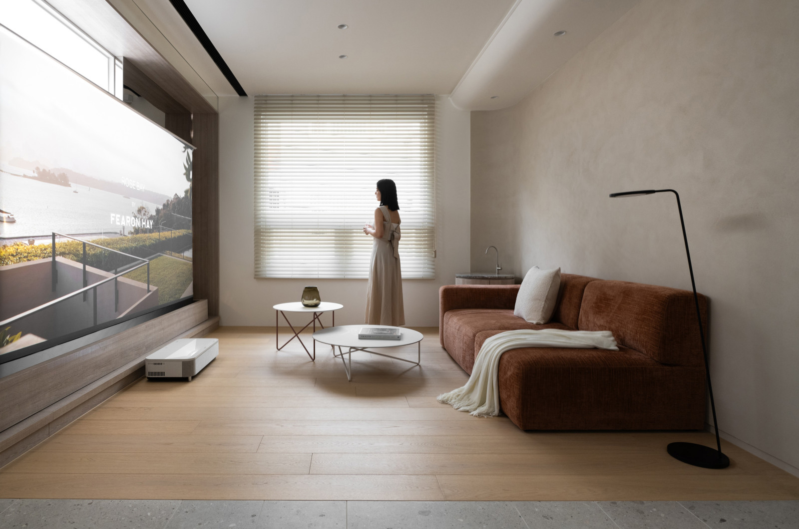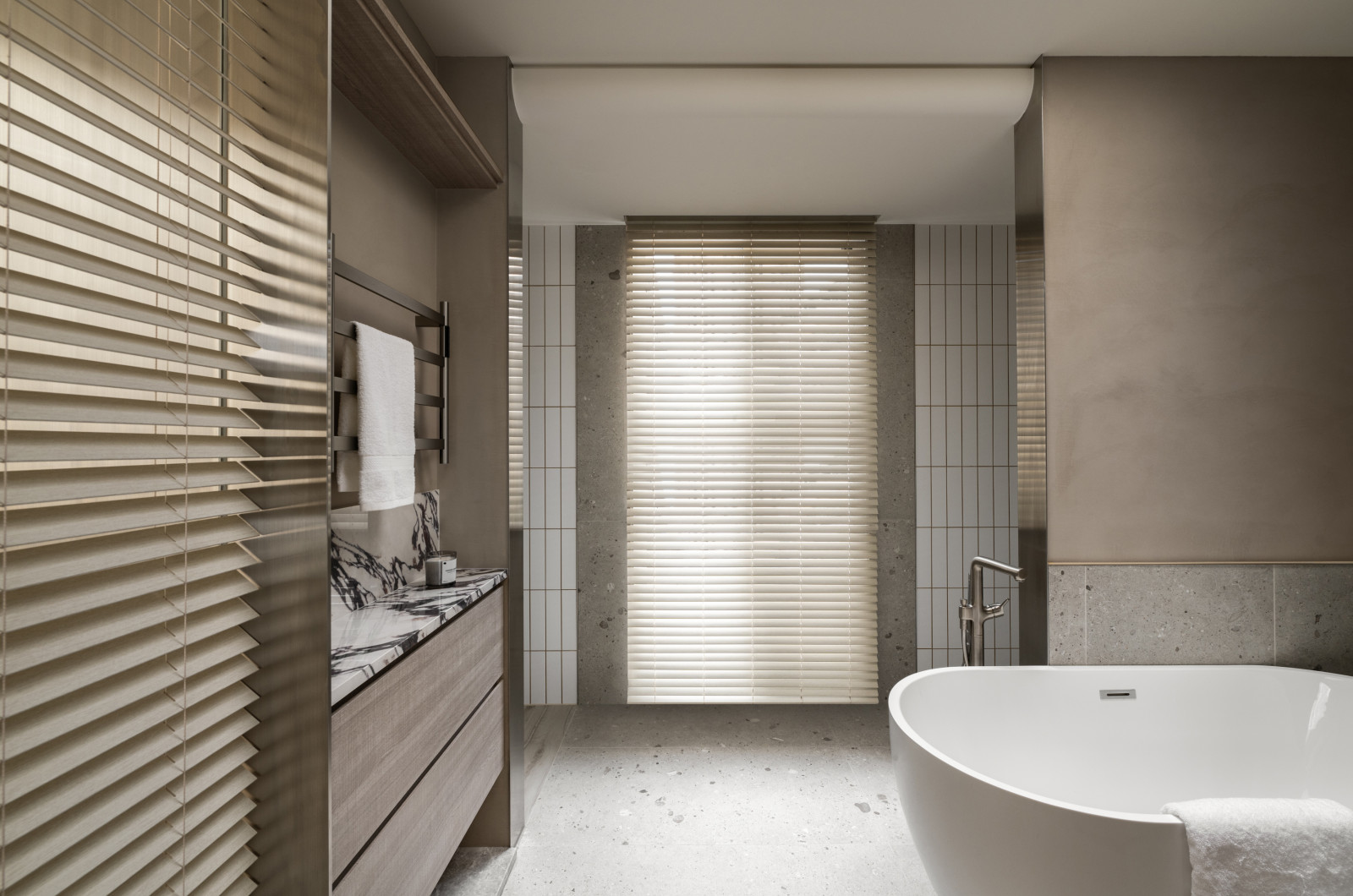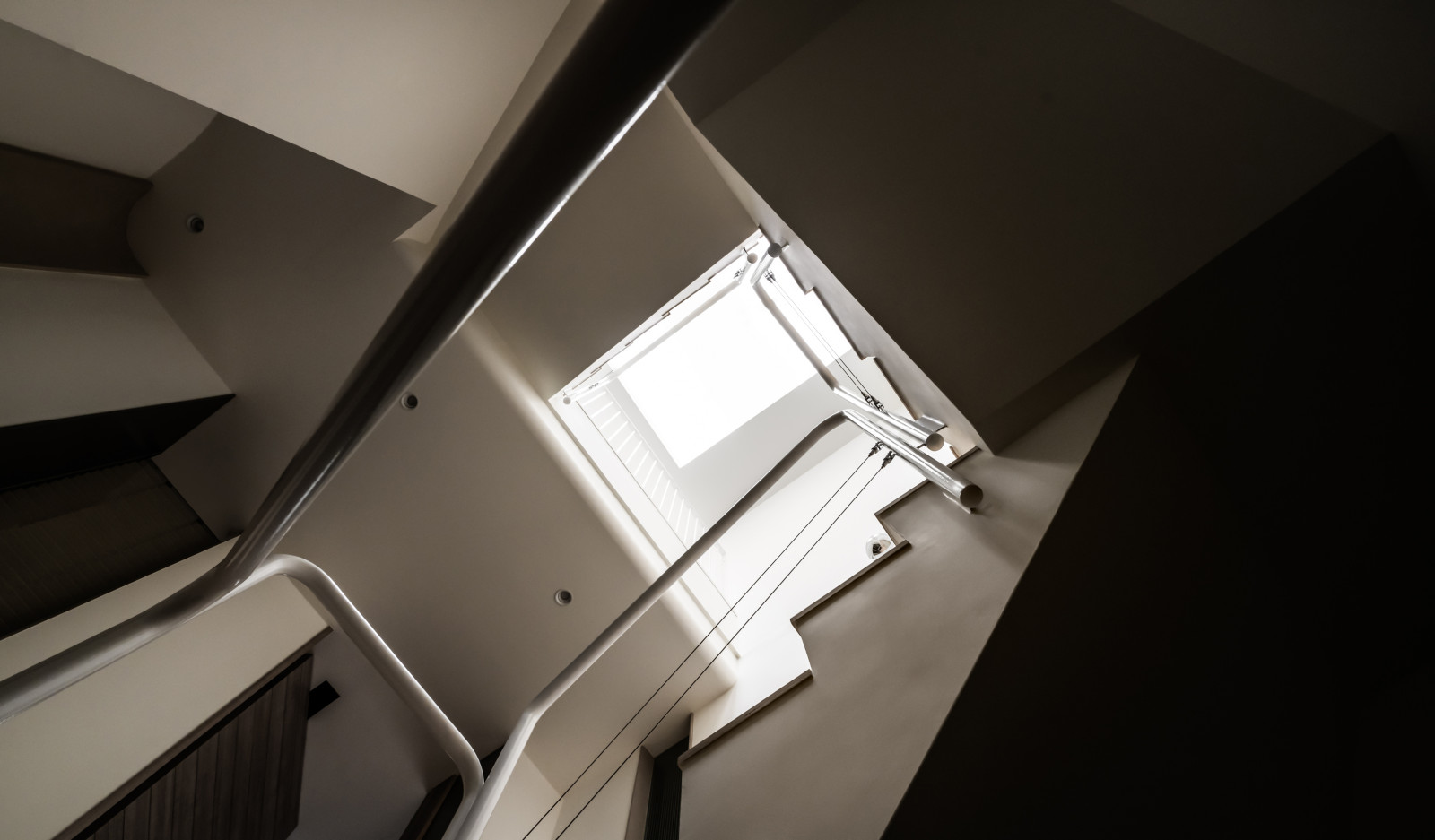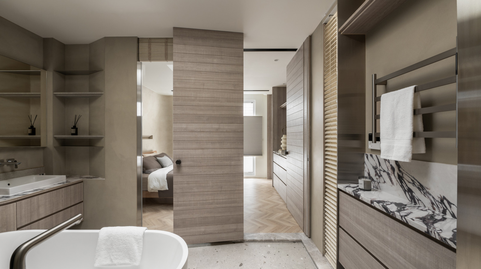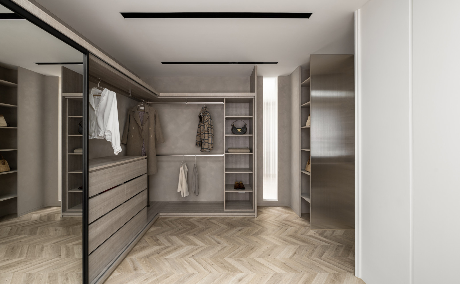 Tree shadows in the courtyard draw greenery into the interior, simplifying the circulation and layout of the old house to meet modern living needs.The central island anchors the public space, blending stone and wood to highlight a warm, natural texture.A cantilevered staircase and double-height skylight express lightness and spatial extension, with dynamic shifts of light and shadow.Storage design extends through the kitchen and dining areas, integrating pleated blinds, slatted doors, and metal elements to showcase a harmonious blend of materials.On the second floor, the audiovisual and workspace are unified behind concealed sliding doors.The master bedroom continues the language of curves and herringbone flooring, creating a serene and elegant atmosphere.The bathroom features wet-dry separation, with a freestanding bathtub and recessed niches that enhance the bathing experience.