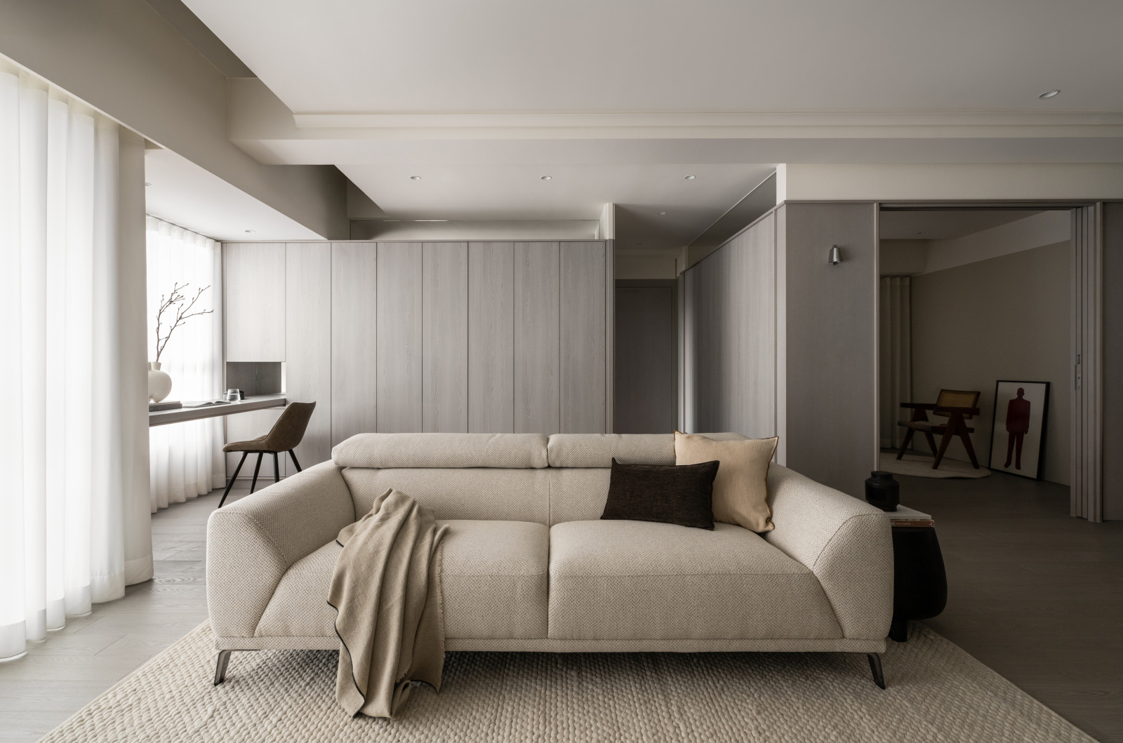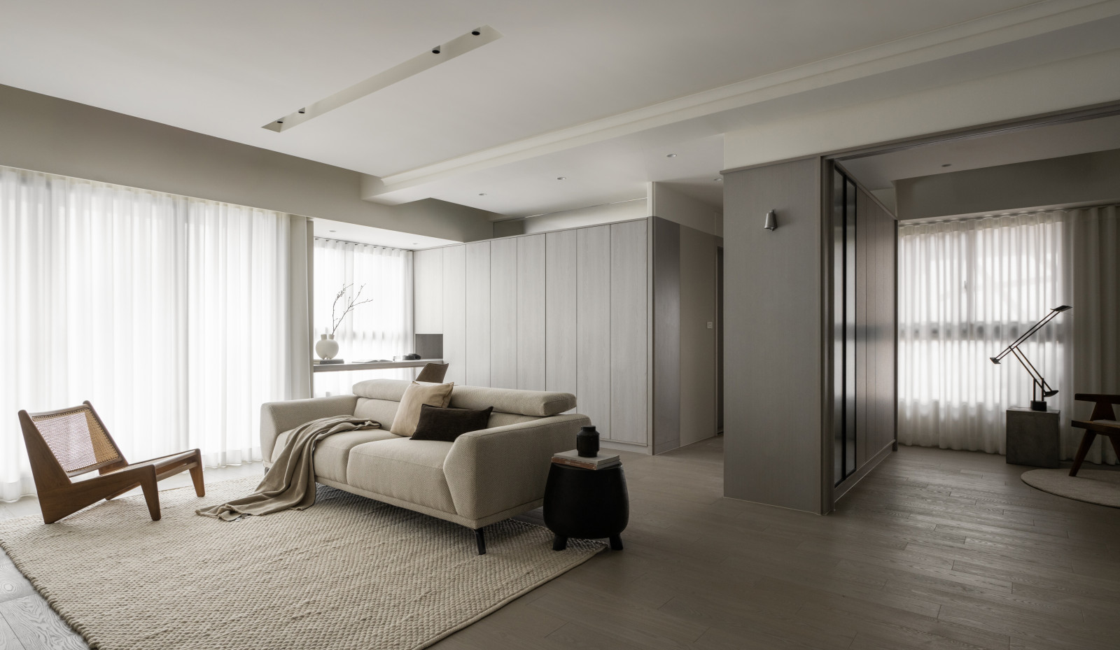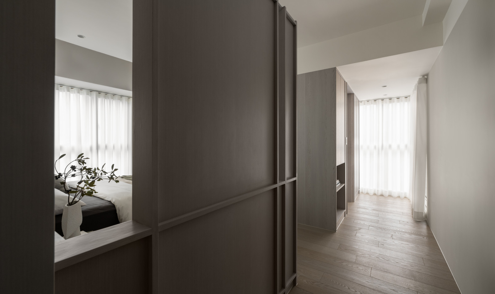 本案為毛胚屋規劃,設計由主臥、衛浴與廚房的既有隔間為基礎延伸發展。除滿足空間基本機能外,並配置具彈性使用性的客房與書房,以隱藏式拉門劃分公私領域,平時開啟可維持空間的通透與開闊感,必要時亦能提供良好的隱私性。各區櫃體設計採局部開放手法,於視線所及處做適當遮蔽,並藉由上下量體的虛實關係延伸空間感。整體配色以中性色階為主,搭配統一染色木皮,創造低飽和的安定氛圍;色彩與材質透過高程水平分割,統整樑位與天花的高低落差,使視覺更為簡潔一致。玄關處則以不做滿的櫃體比例搭配異材質地坪界定區域,並利用雙面格柵引入自然光線,使玄關不成暗角,同時保有穿透與隱私的平衡。主臥內,利用通往衛浴的廊道整合更衣與收納機能,搭配落地紗簾展現建案本身良好的採光條件,營造柔和靜謐的休憩氛圍。| 桃園室內設計 | 空間規劃 | 新成屋設計 客變設計 |