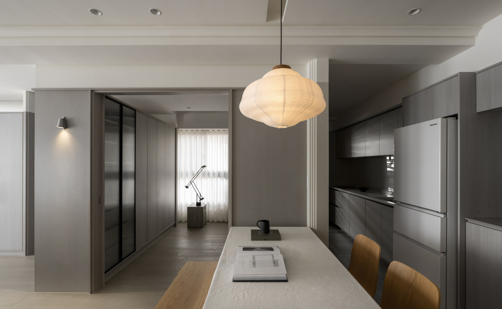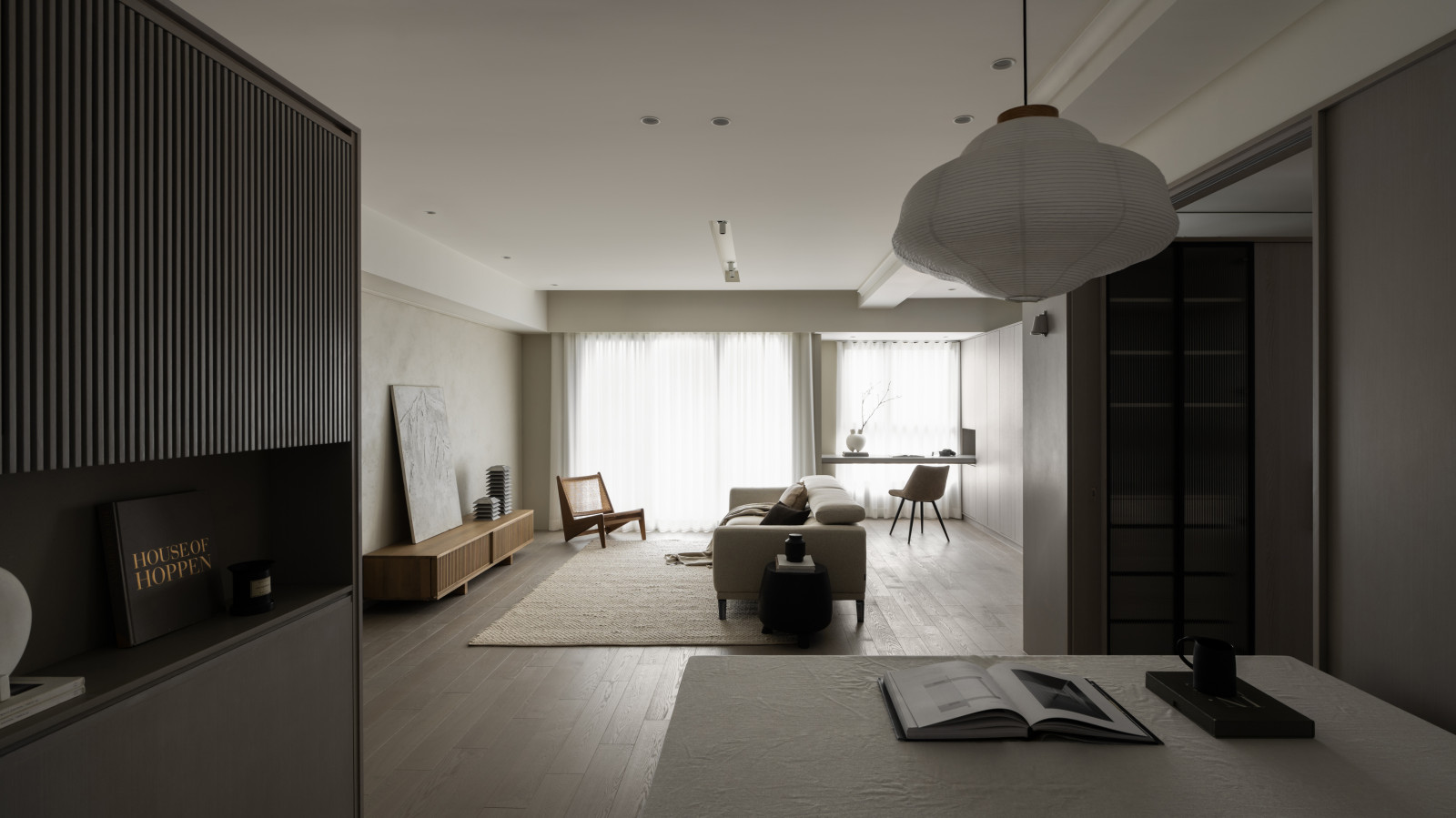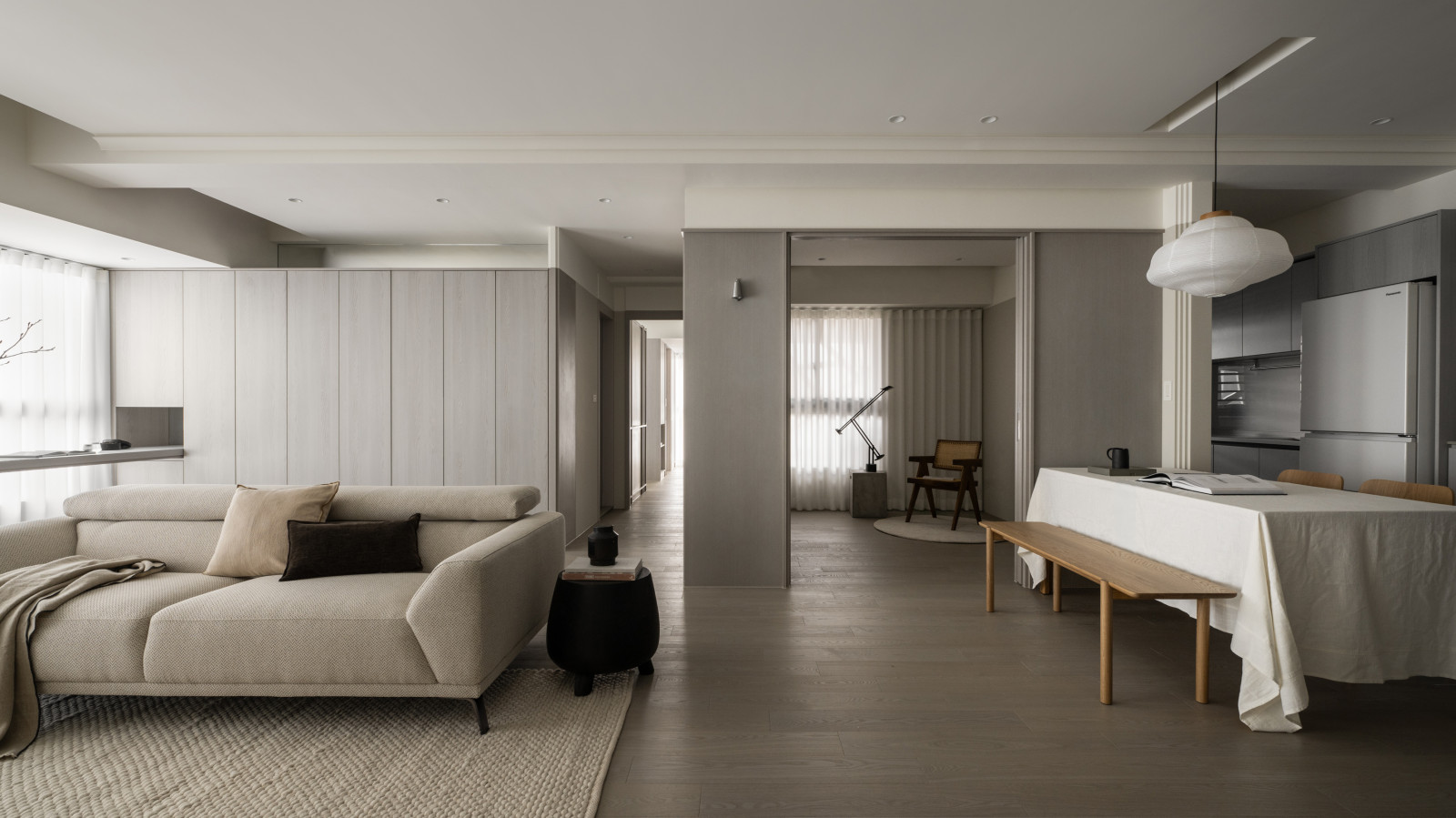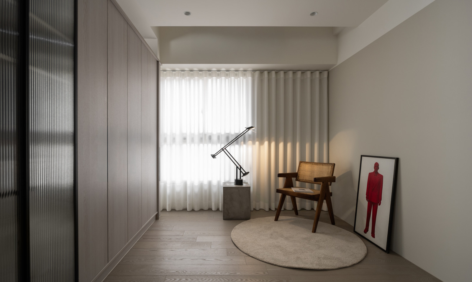 本案為毛胚屋規劃,設計由主臥、衛浴與廚房的既有隔間為基礎延伸發展。除滿足空間基本機能外,並配置具彈性使用性的客房與書房,以隱藏式拉門劃分公私領域,平時開啟可維持空間的通透與開闊感,必要時亦能提供良好的隱私性。各區櫃體設計採局部開放手法,於視線所及處做適當遮蔽,並藉由上下量體的虛實關係延伸空間感。整體配色以中性色階為主,搭配統一染色木皮,創造低飽和的安定氛圍;色彩與材質透過高程水平分割,統整樑位與天花的高低落差,使視覺更為簡潔一致。玄關處則以不做滿的櫃體比例搭配異材質地坪界定區域,並利用雙面格柵引入自然光線,使玄關不成暗角,同時保有穿透與隱私的平衡。主臥內,利用通往衛浴的廊道整合更衣與收納機能,搭配落地紗簾展現建案本身良好的採光條件,營造柔和靜謐的休憩氛圍。| 桃園室內設計 | 空間規劃 | 新成屋設計 客變設計 |