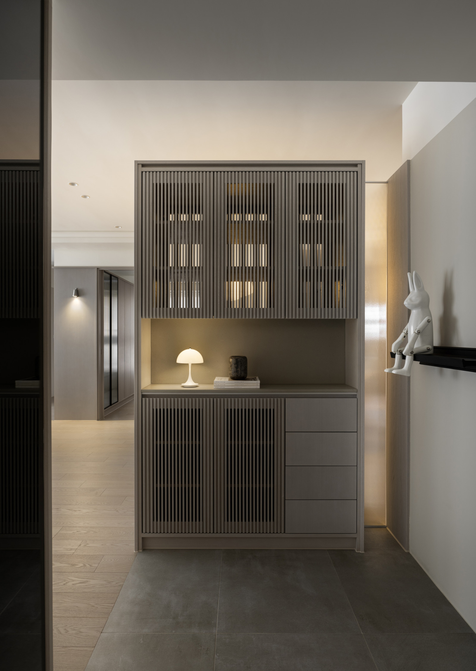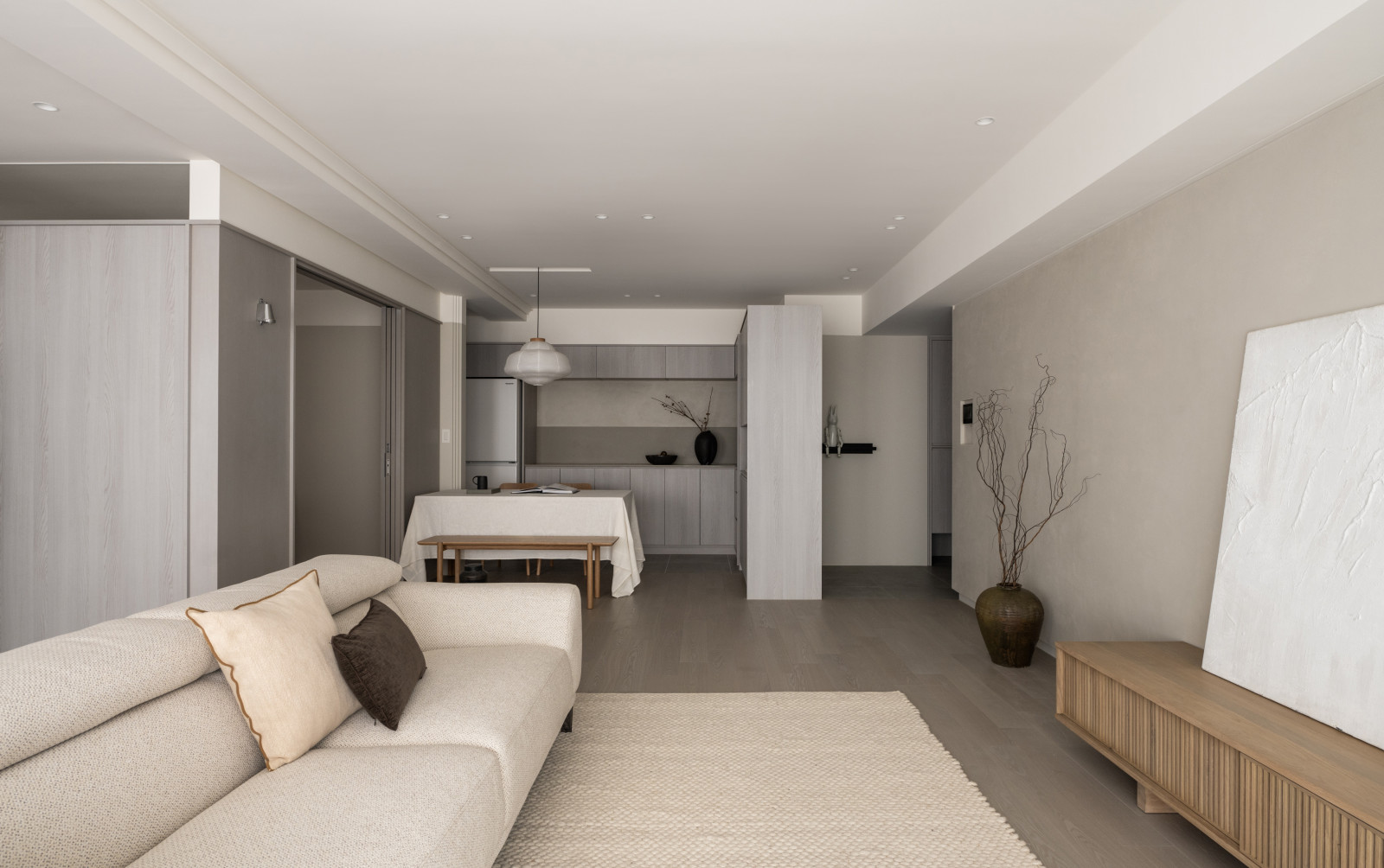 This project starts with a bare shell unit, expanding upon existing partitions for the master bedroom, bathroom, and kitchen. The layout includes flexible guest and study areas, with a hidden sliding door separating public and private zones—open for spaciousness, closed for privacy.Storage combines open and closed volumes to balance visibility and flow. Vertical divisions and height variation enhance visual depth, while neutral tones and consistent wood finishes add calm sophistication. Horizontally aligned elements smooth out ceiling and beam irregularities.At the entrance, contrasting floor materials and semi-enclosed cabinetry define the foyer, with a slatted screen filtering light to avoid darkness. In the master bedroom, integrated wardrobes create a dressing corridor, and sheer curtains highlight natural light for a serene retreat.