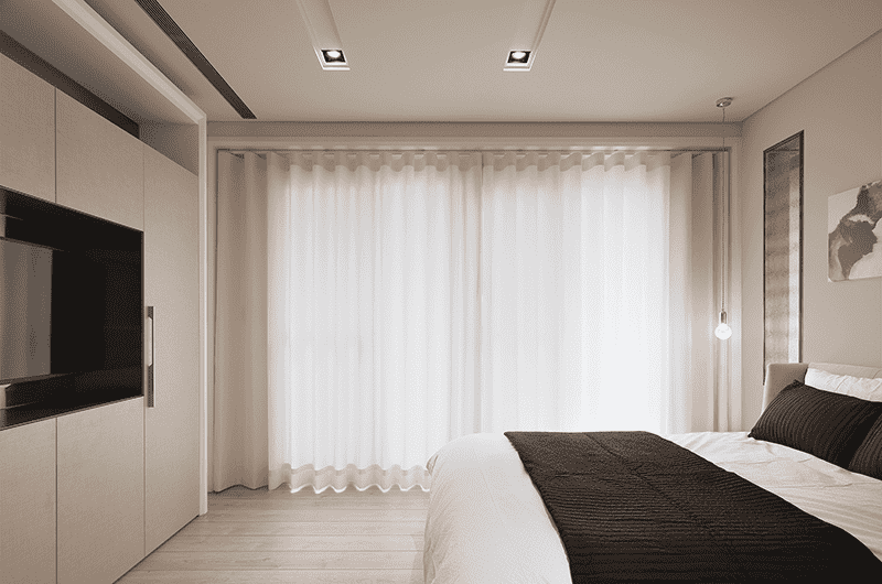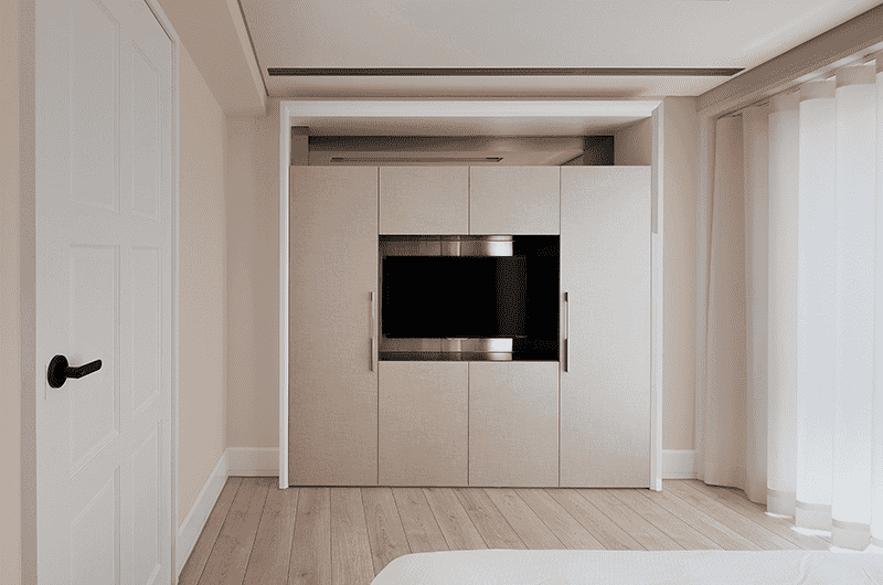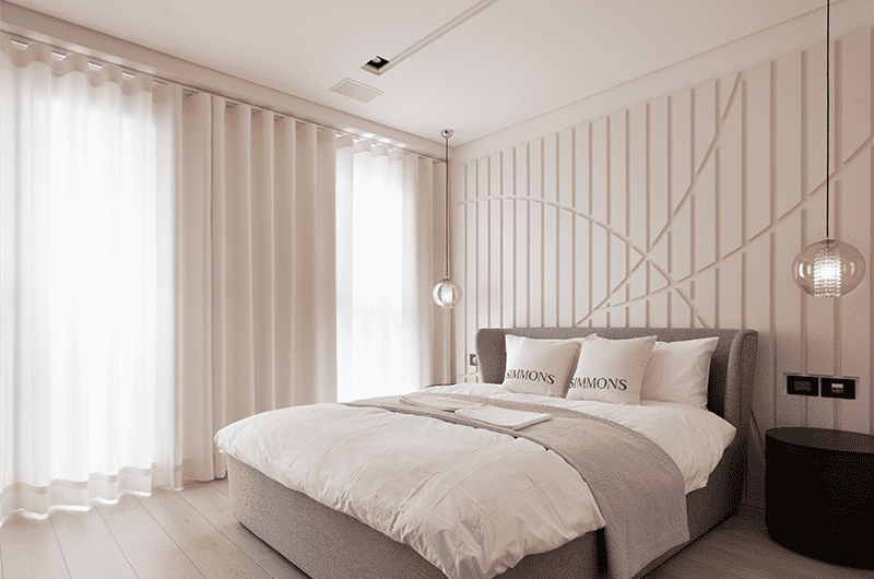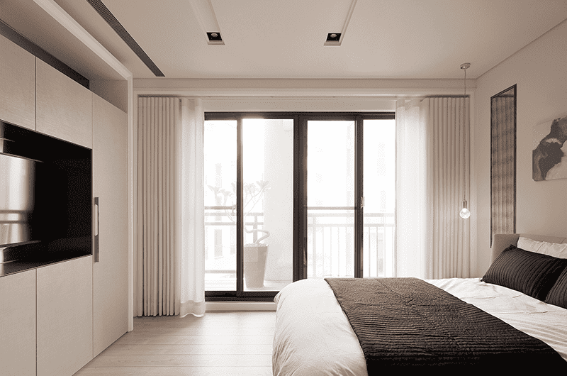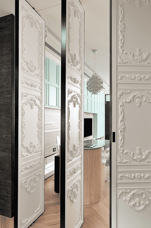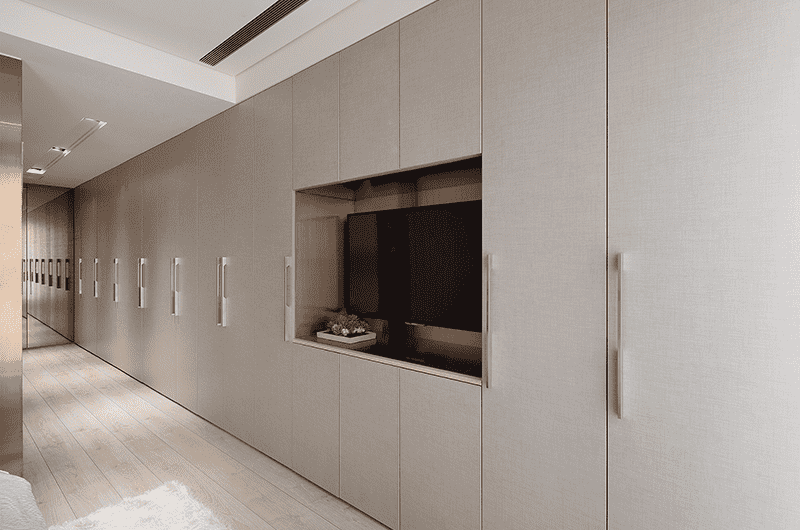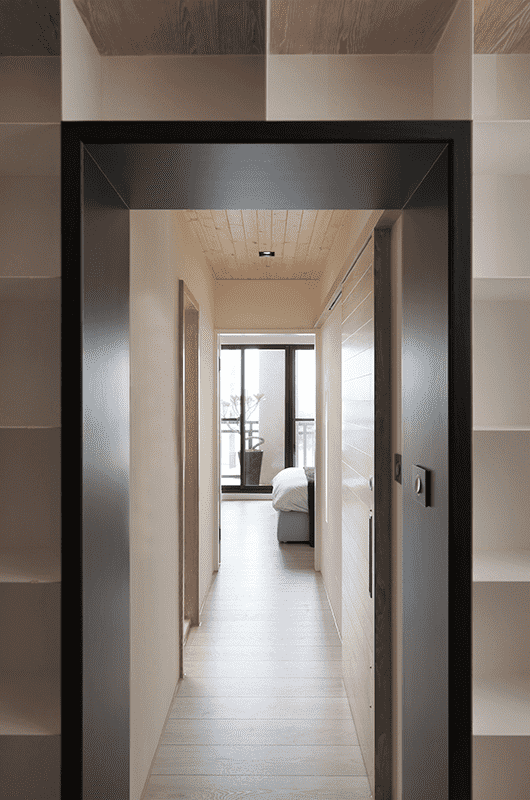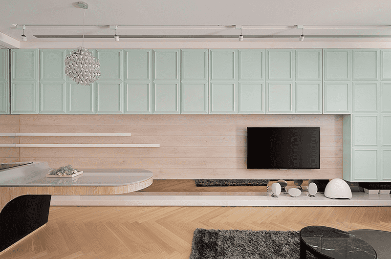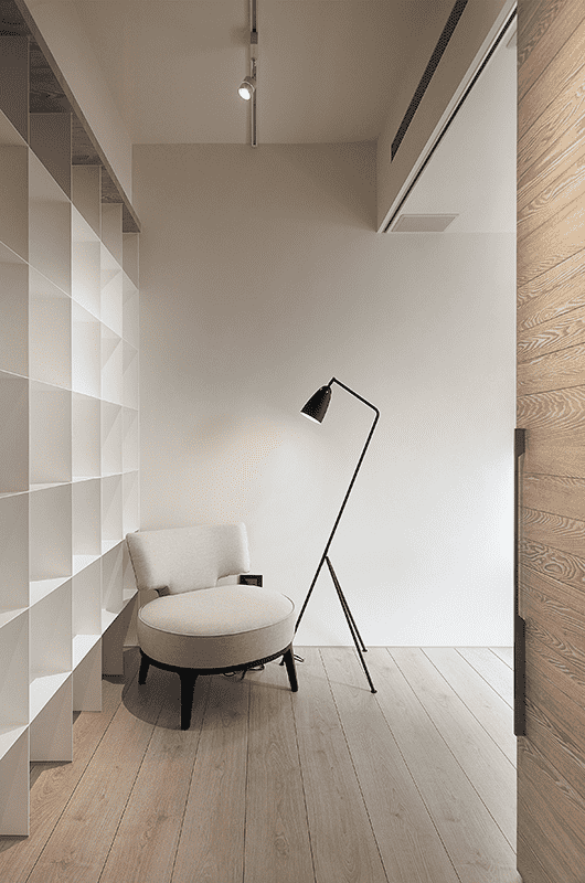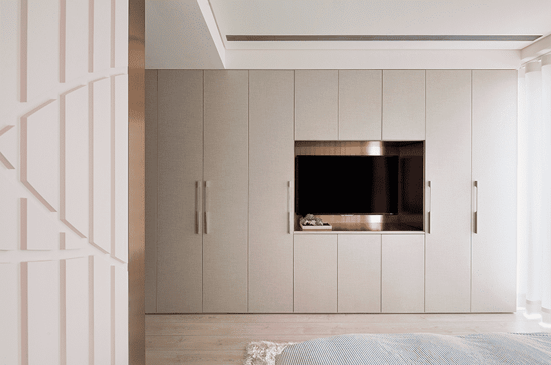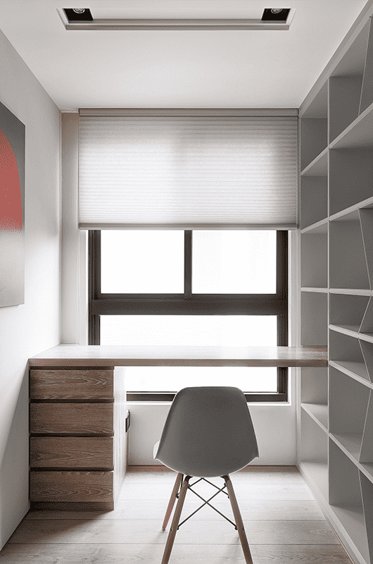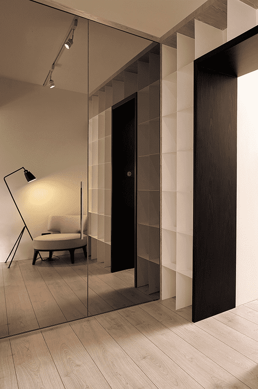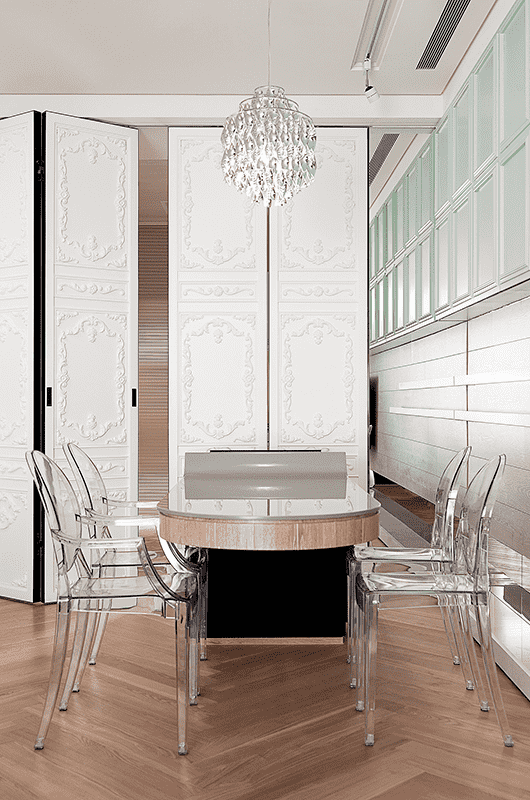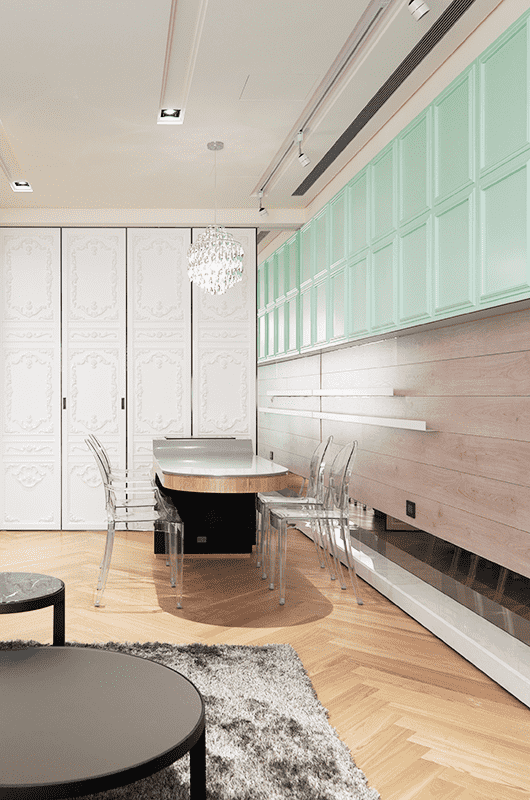 空間無關侷限,在於觀看的方式。傳統連棟式透天住宅無非具有樓面積、採光有限之條件,於是在規劃上希望化拙為優,以主題式空間設計規劃每個樓層。推開純白雕琢的長型折門,水晶般澄澈的Kartell法式古典單椅,和粼粼閃爍的吊燈迎接來訪賓客,整面粉嫩薄荷綠的格狀線板劃開客廳尺度,放大空間感,並以暖樸木紋中和色調,電視牆底端鏡面元素輝映端景,亦妝點精緻質感。拾級而上,每日勤忙於事業的屋主期待私領域圍繞著喜愛色系,部分收納櫃體延續粉嫩薄荷綠色調,貫徹空間樓層整體性,臥室主牆以淡粉色系、格柵,以及如緞帶舞動而輕柔揚起的線條分割,創造輕鬆無壓的歇憩場域。面積條件有限的透天住宅,不以實牆為空間區劃,反之利用豐富的開放式格櫃為牆,抑或作為穿廊,於動線間盡情擴充坪效,藉此相同元素之收納櫃體跨越分嶺,使得整體視覺越趨完善。規劃上不僅透過象徵女性的粉色調整合各空間與機能,同時運用象徵屋主事業的金屬材質整合介面,呈現剛柔並濟,將細緻中帶有堅毅的性格由內而外地呼應,完善結合屋主喜好與住宅優缺,細膩描繪這幢法式輕古典。| 桃園室內設計 | 空間規劃 | 中古屋翻修 |