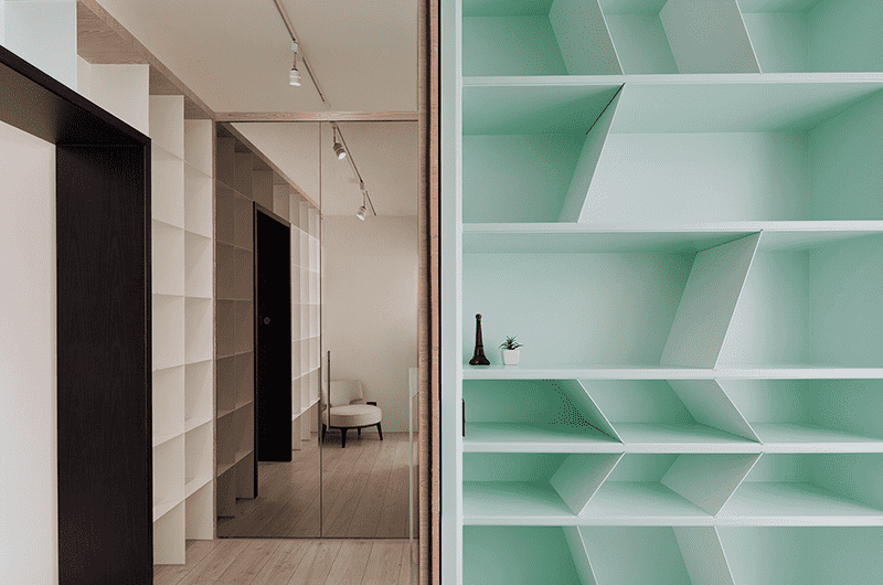 Spatial limitations are a matter of perspective. This traditional terraced house, though limited in floor area and daylight, transforms constraints into design strengths through themed spaces on each floor. Guests are welcomed by carved white folding doors, Kartell chairs, and chandeliers, with mint green and pink lattice panels expanding the living room visually. Warm wood tones and mirrored TV walls add softness and depth.The homeowner’s private space upstairs features favorite colors—light pink and ribbon-like grilles—for a calming retreat. Instead of solid walls, open shelving defines zones, enhancing flow and spaciousness. Pink accents symbolize femininity, while metal details reflect the owner's career, blending softness with strength. The design balances function, personality, and elegance, presenting a refined French-inspired aesthetic.
